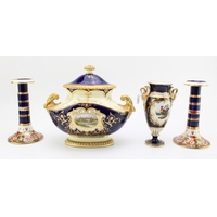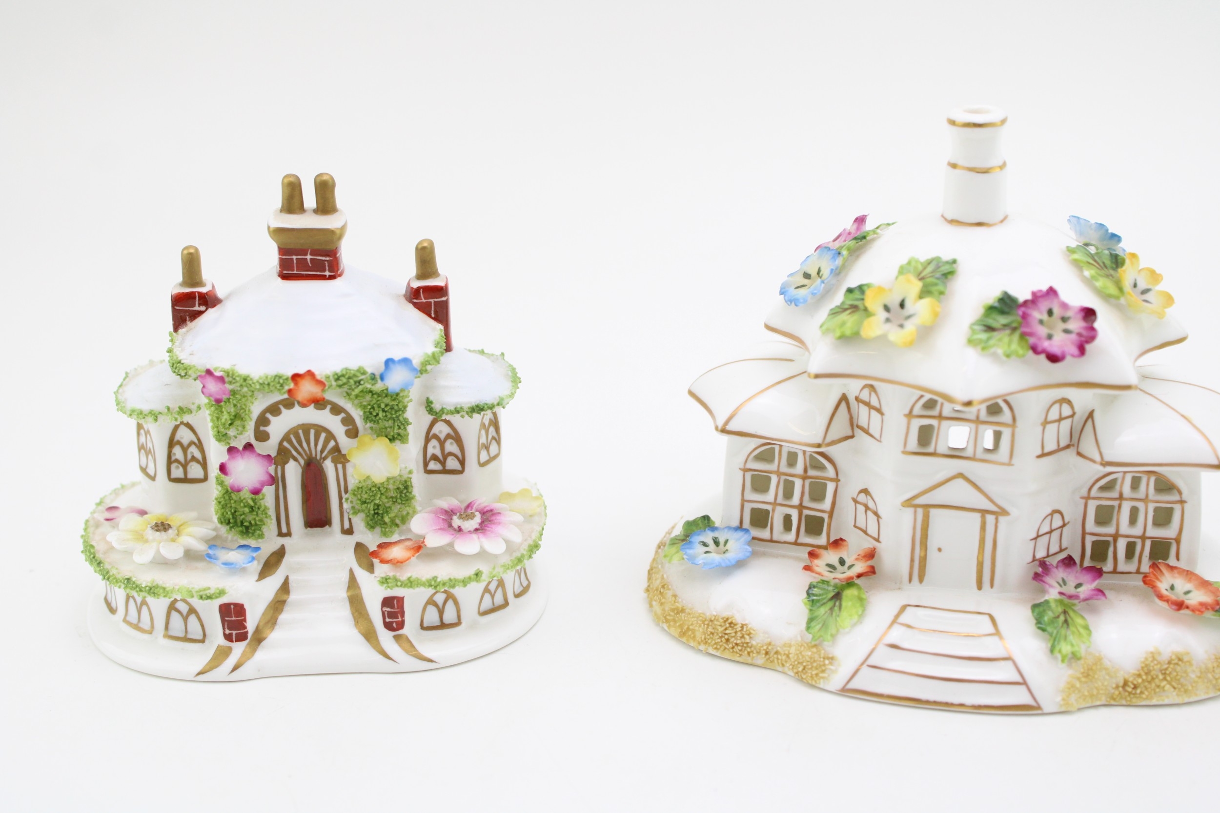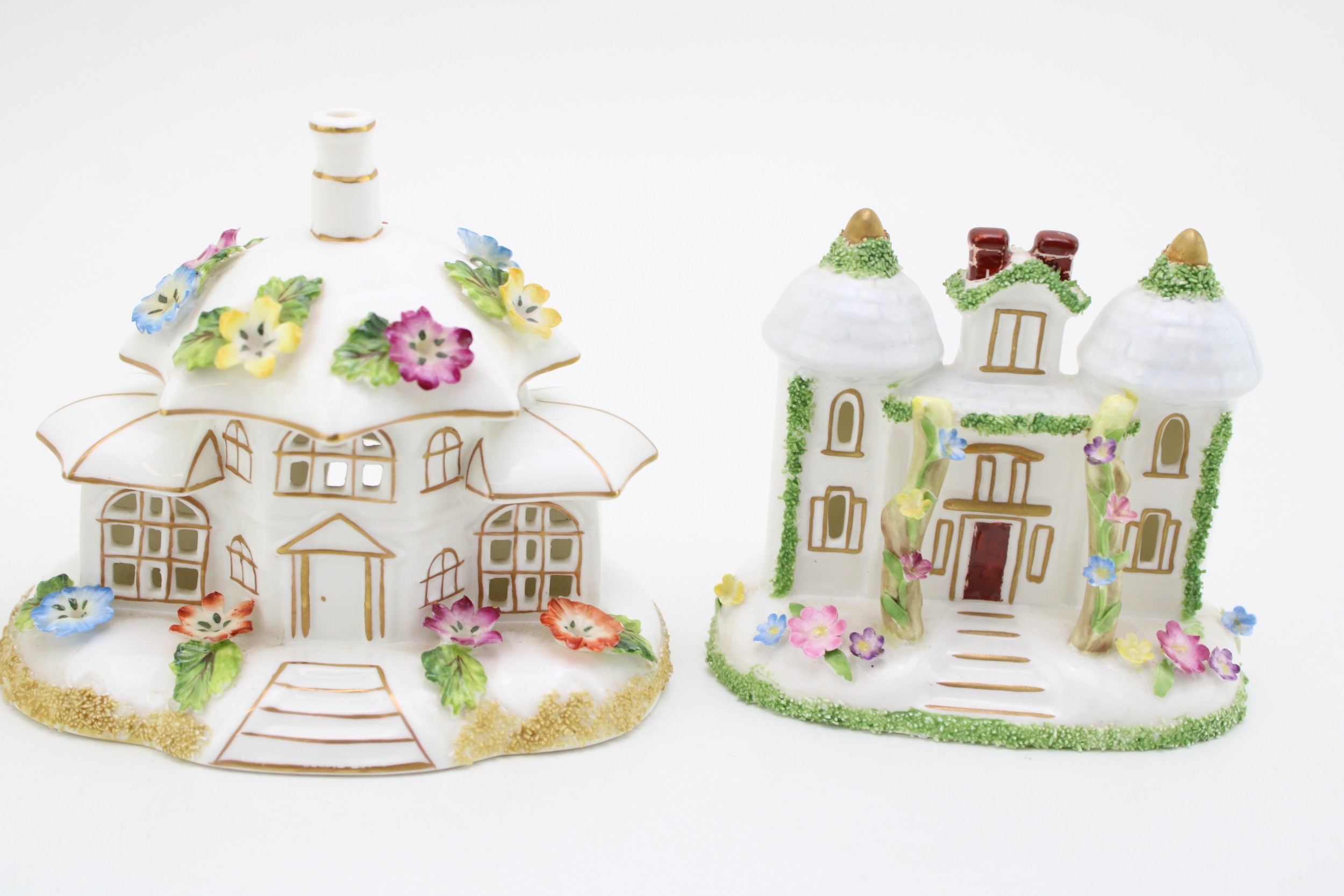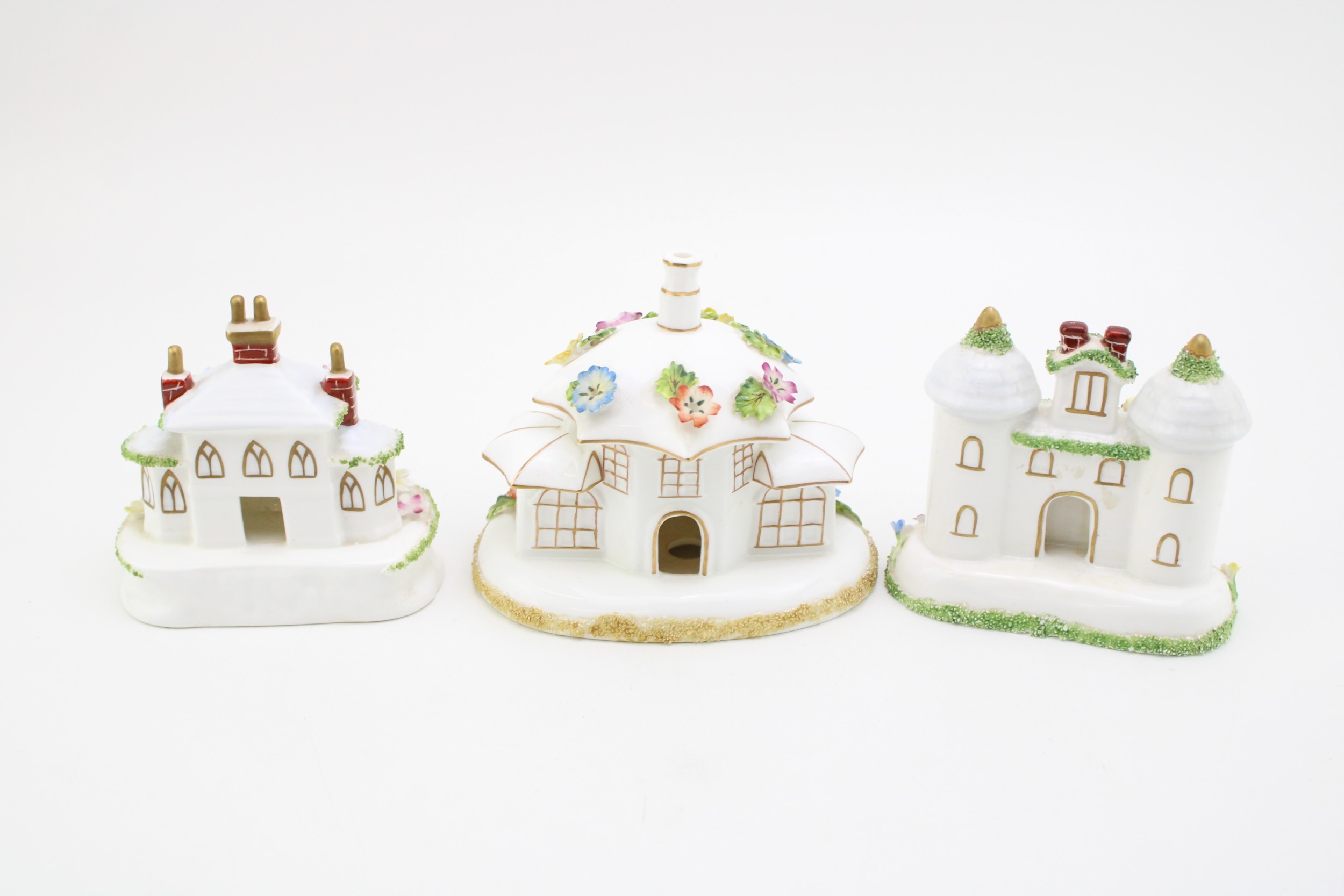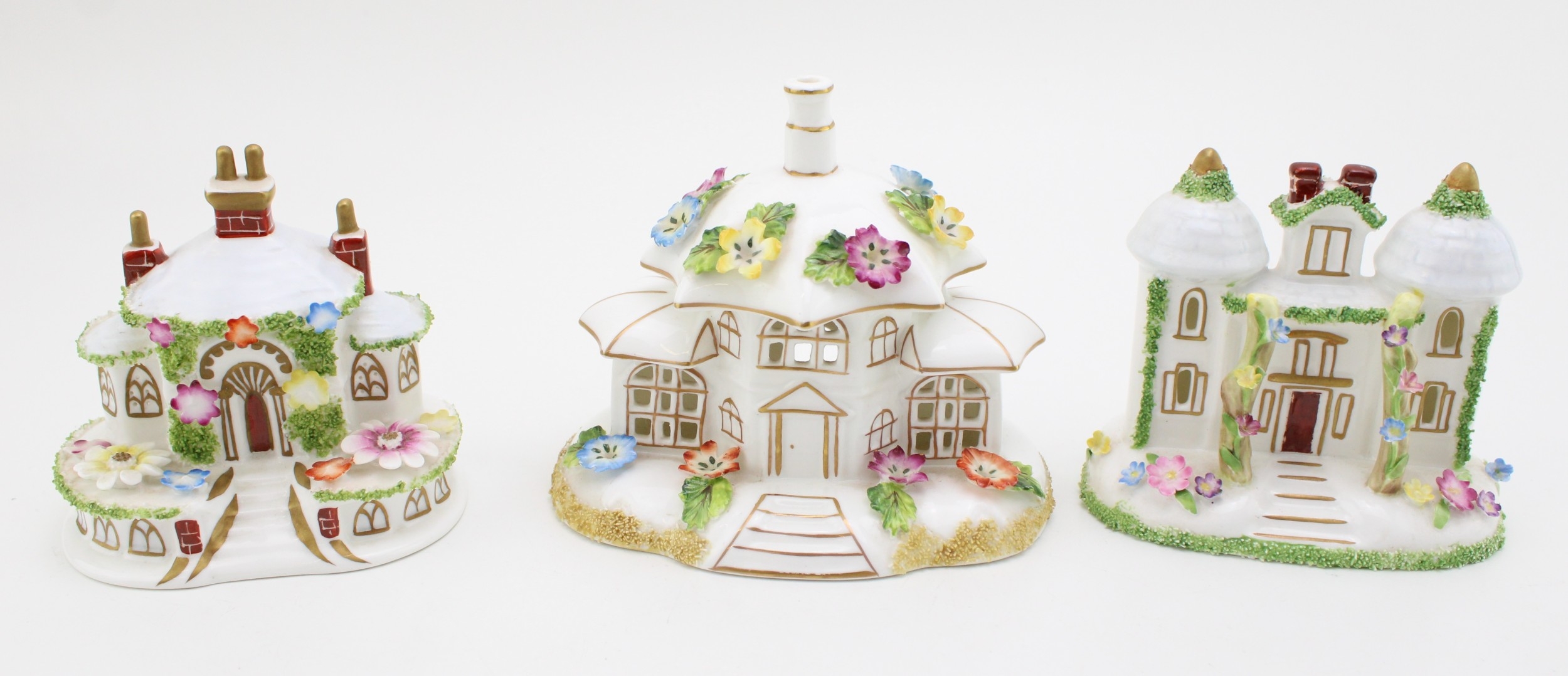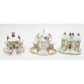 Coalport 'Twin Towers', 'Keepers Cottage' and 'The Parasol House' 11cm tall, (3).