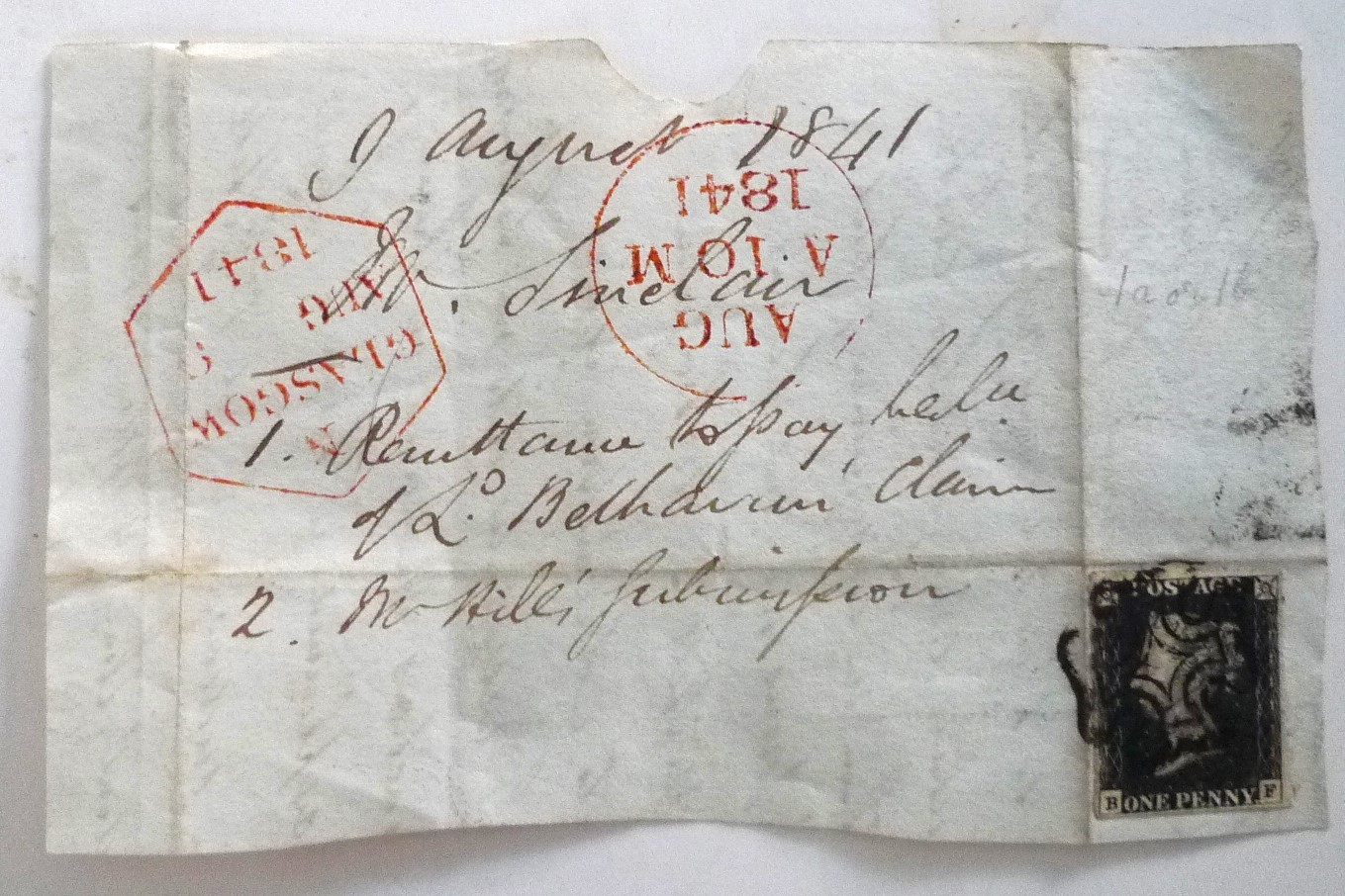 Penny Black part cover. Dated August 9th 1841. Plate 1b with NW 7 o’clock flaw. Heavy black Maltese cross cancellation.