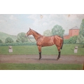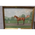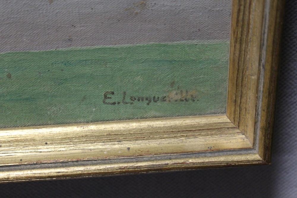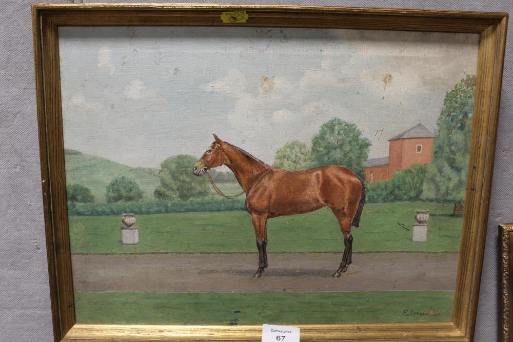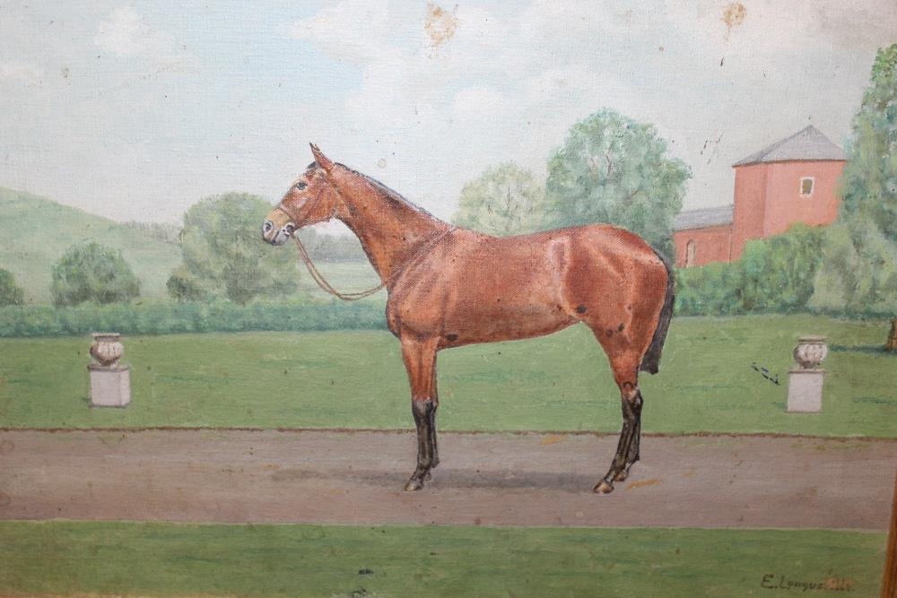 A GILT FRAMED OIL ON CANVAS OF A HORSE IN A COUNTRY GARDEN SIGNED E. LONGUEVILLE LOWER RIGHT 30CM X 40CM