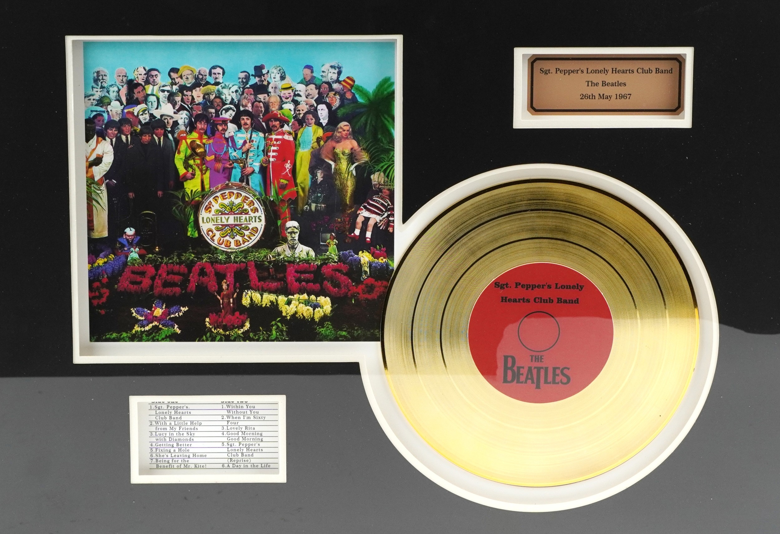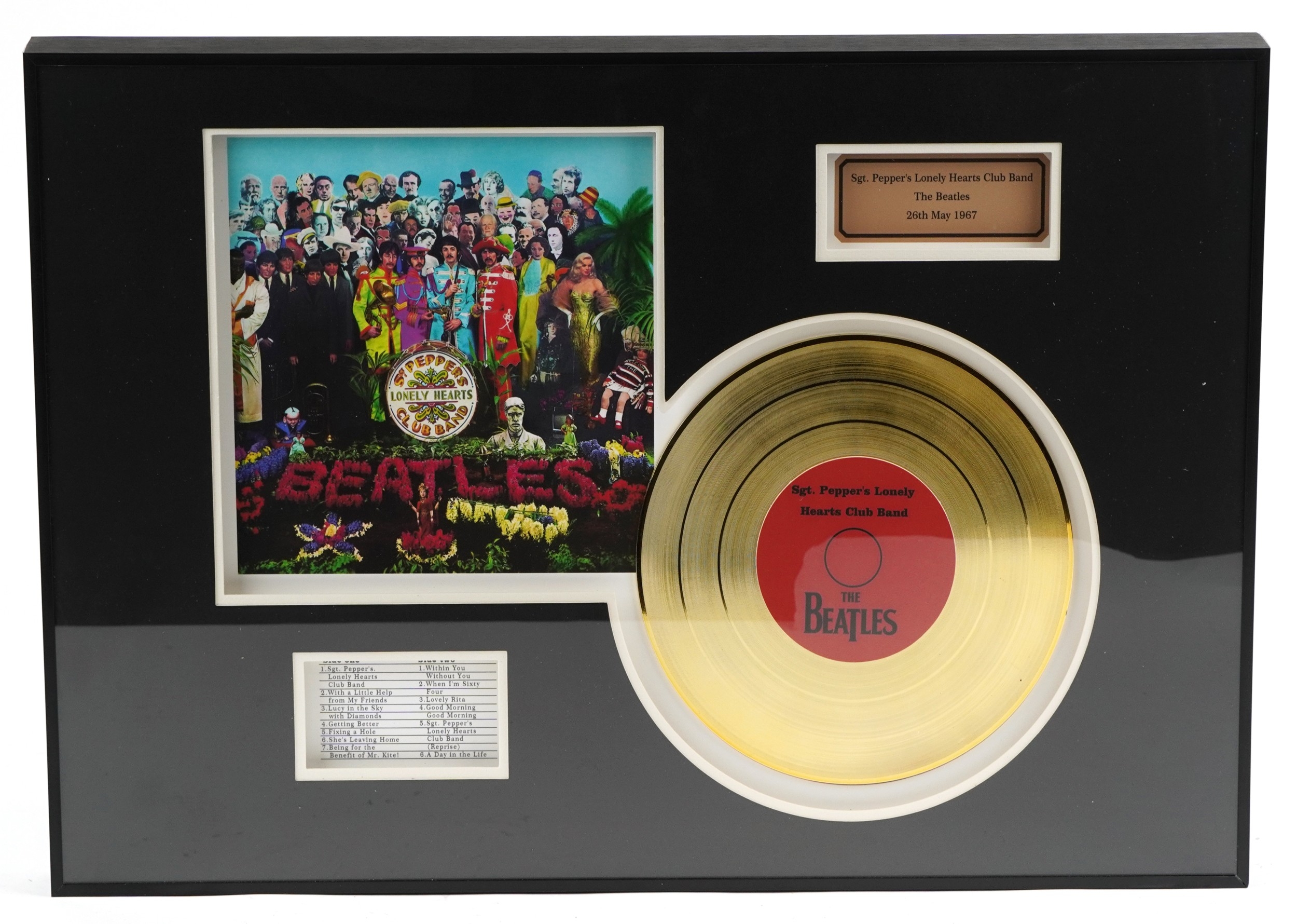 A The Beatles Sgt. Pepper's Lonely Hearts Club Band gold record display, overall 60.5cm x 40.5cm.