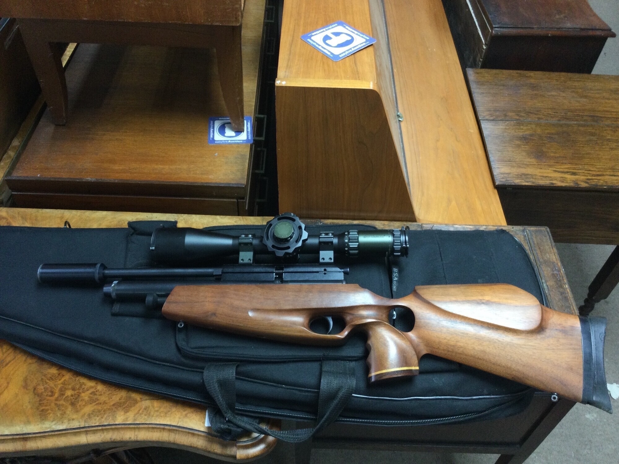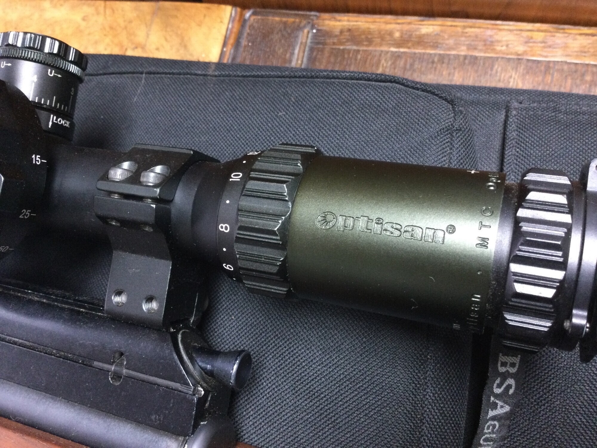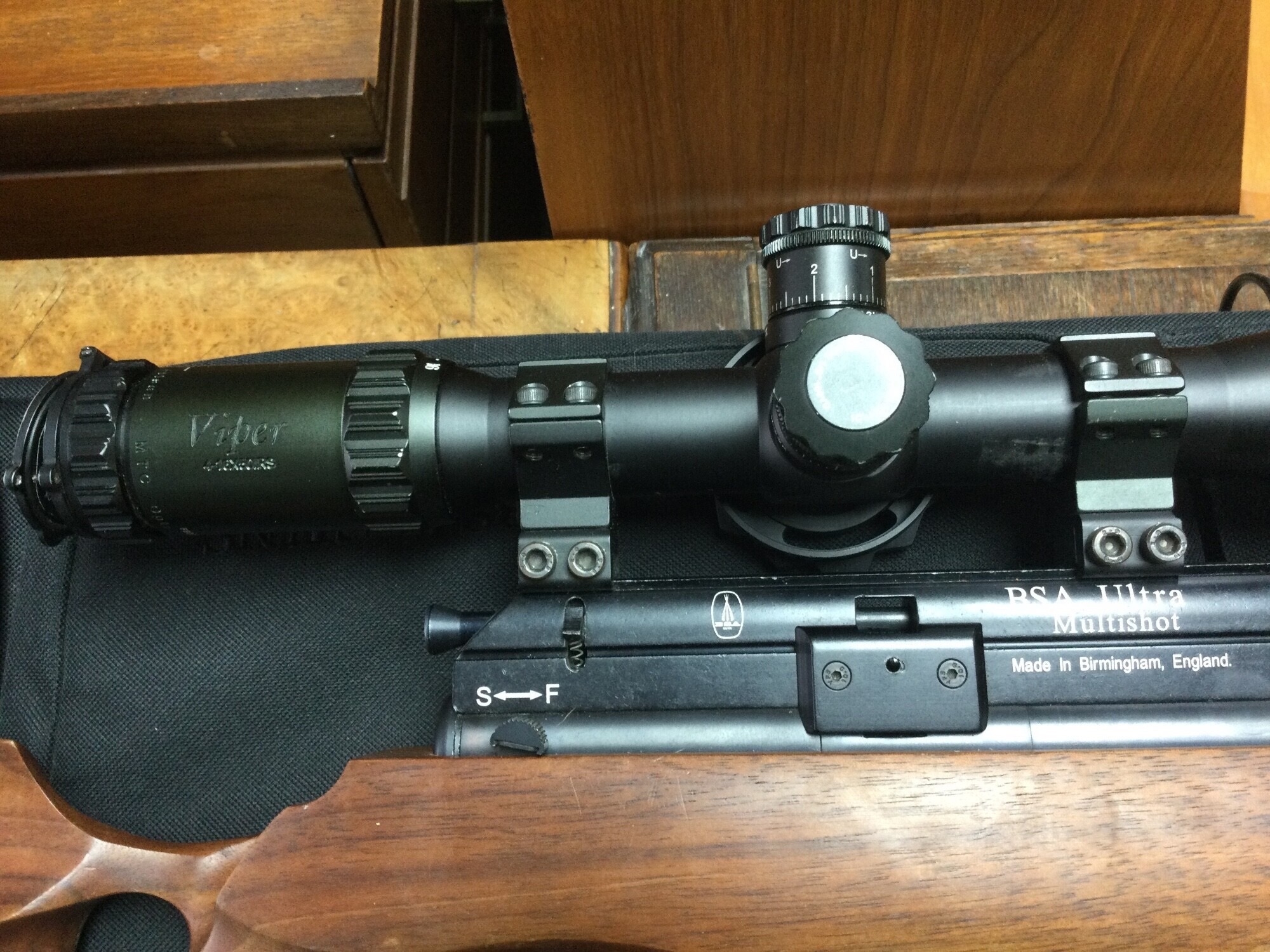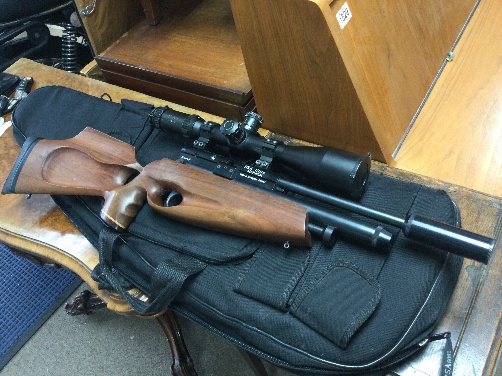 A BSA ultra PCP air rifle, with attached MTC Viper 4 2 16x50 scope. 22 cal. With case
