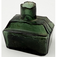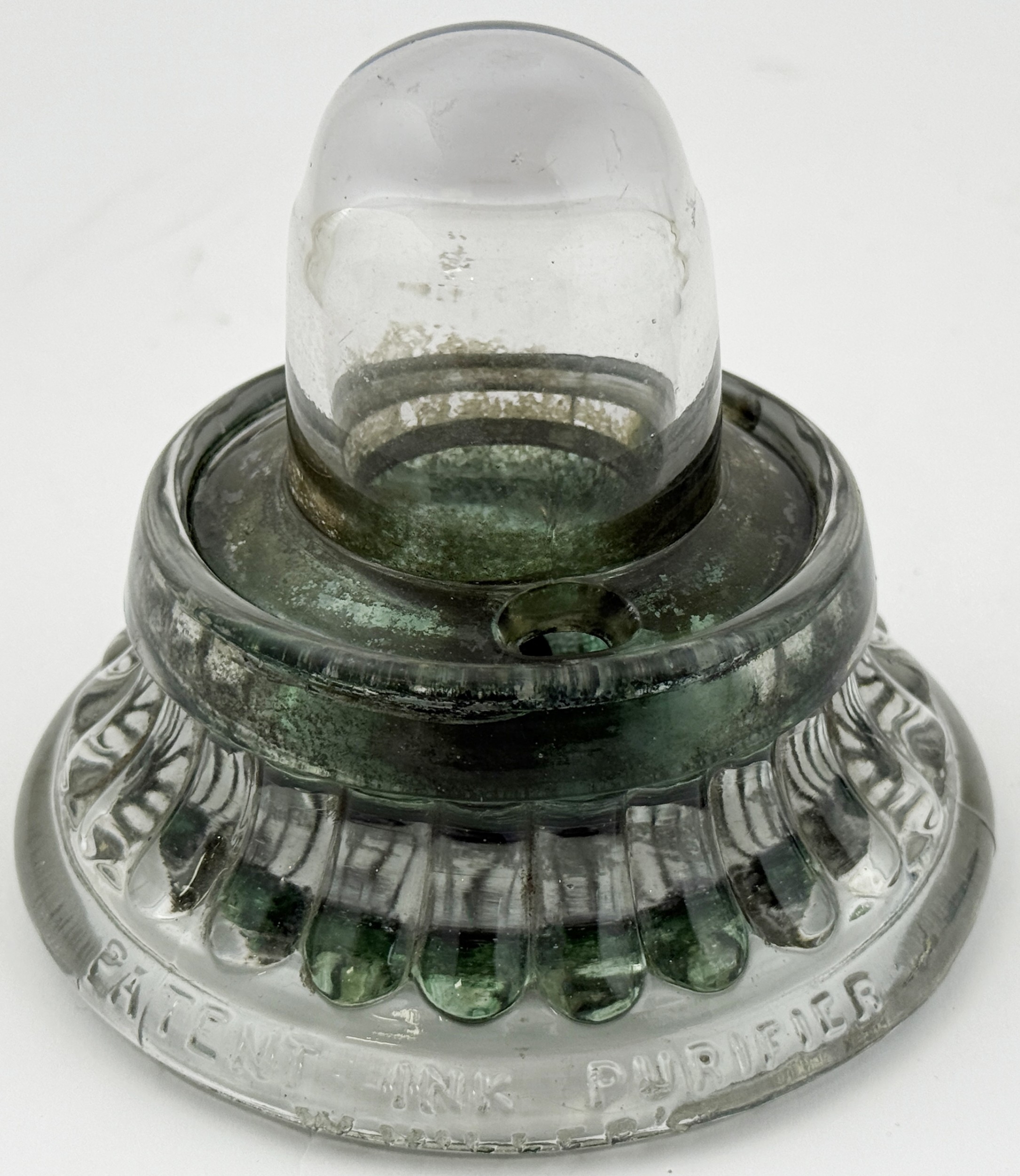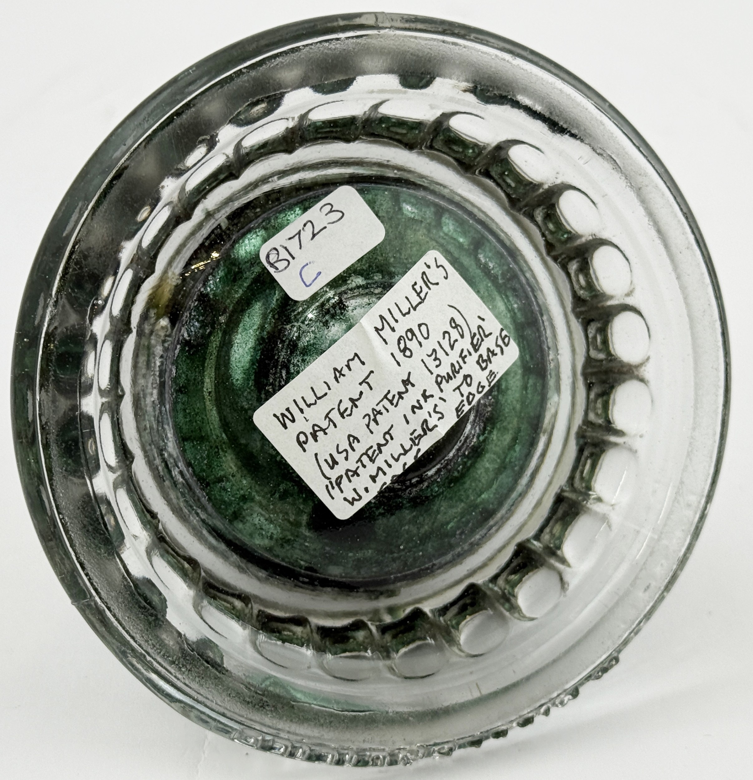MILLERS PATENT INK PURIFIER BOTTLE. 3.75ins tall. Clear glass Millers 1890 patent ink embossed PATENT INK PURIFIER/ W MILLERS around base edge. Ink staining to interior,t otherwise undamaged.