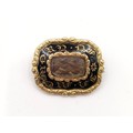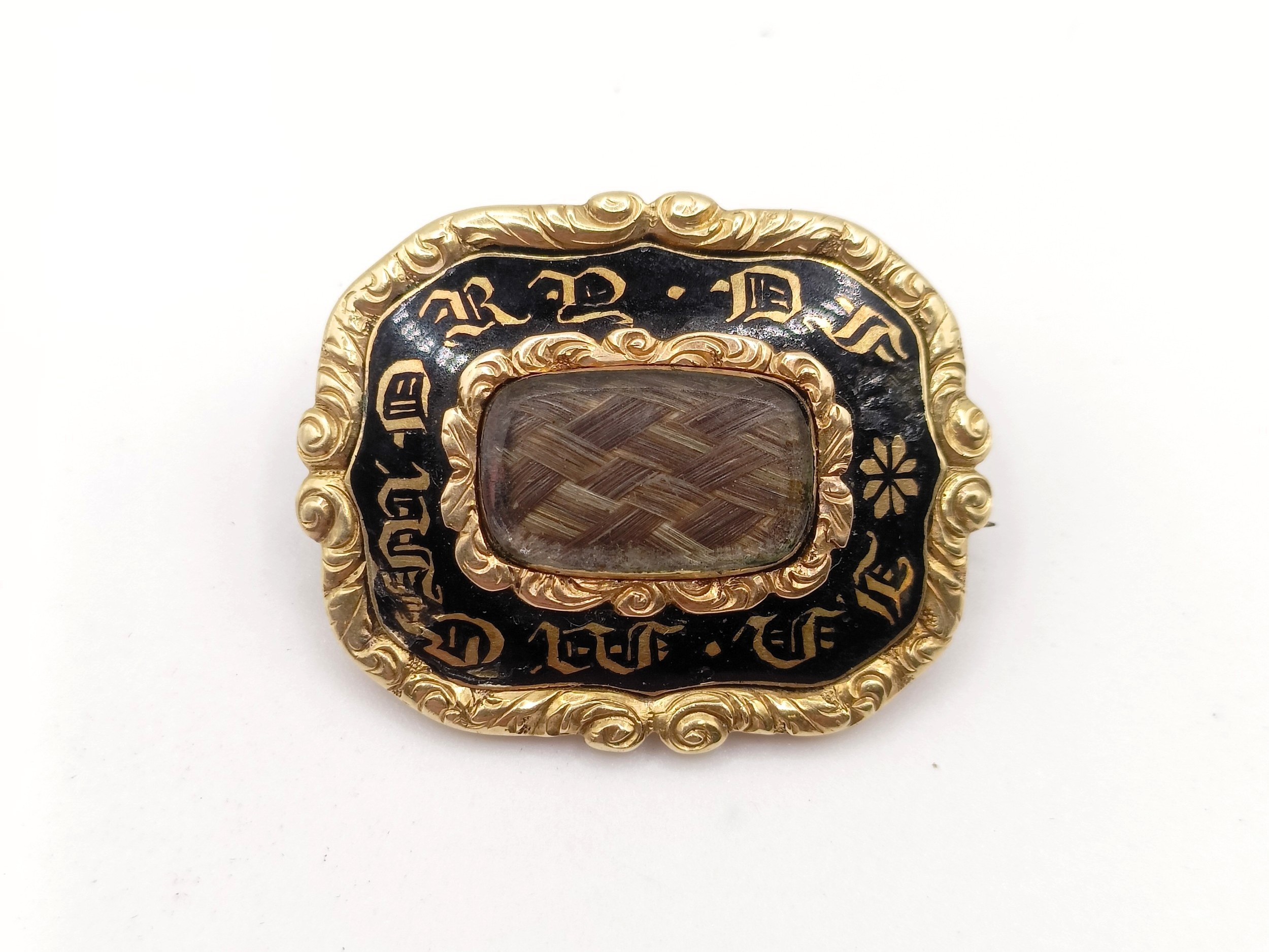 A 19th century yellow coloured metal and black enamel memorial brooch, inset with a lock of hair, later engraved ‘Robert Tennant Young Killed In Action 15-6-18, aged 20 years’