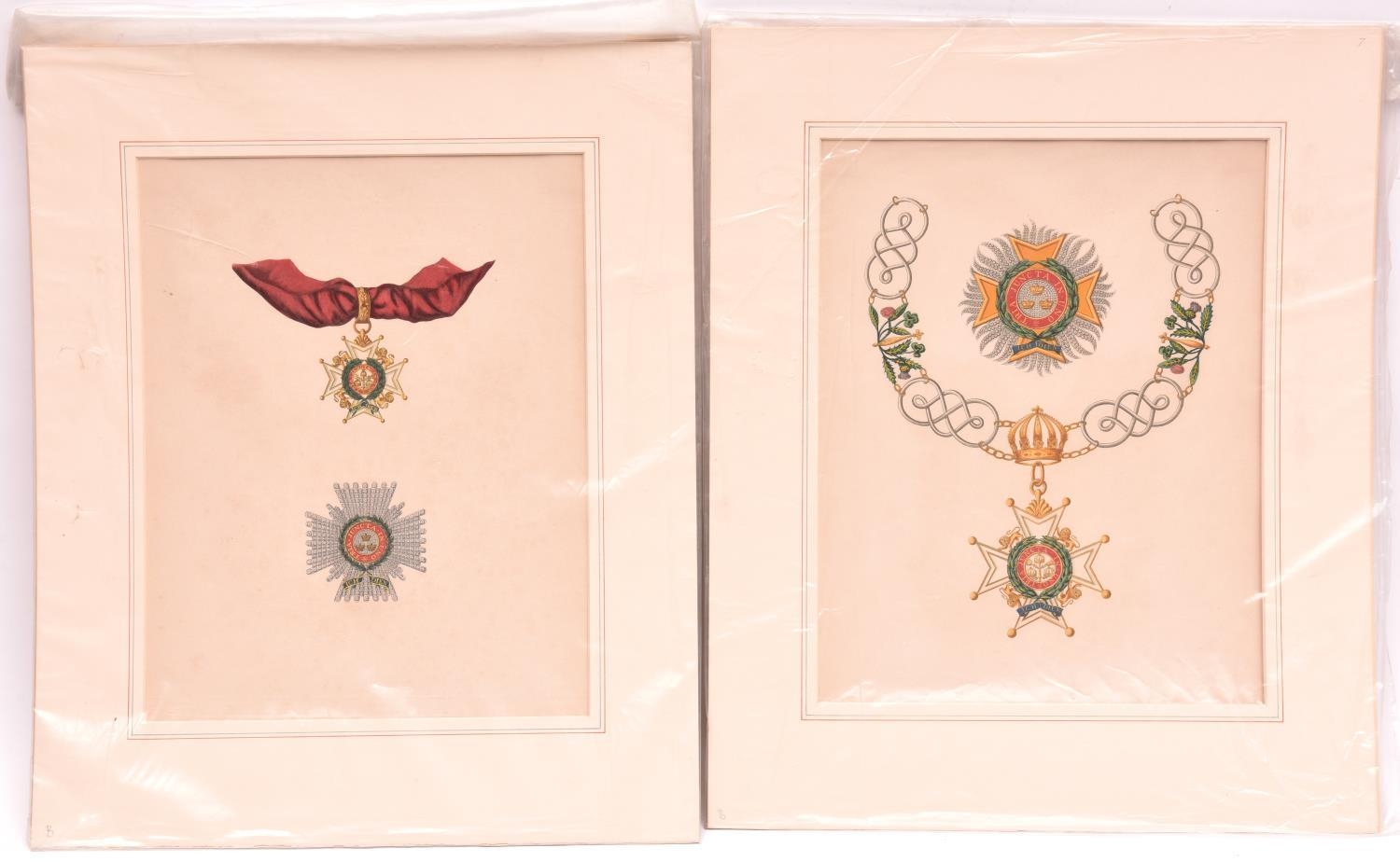 Six exquisitely executed watercolour drawings of Orders of Chivalry, comprising Order of the Garter collar, collar badge and breast star; Order of the Bath collar with Civil Division badge and Civil Knight’s Grand Cross breast star; Bath Military Knight Commander’s star and badge; another Bath breast star, collar and badge; Military Companion of the Bath; and Knight Grand Cross of Order of St Michael and St George breast star, collar and badge. Each 10" x 13", in card window mounts. VGC £40-50