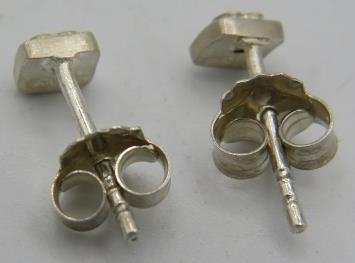 A pair of delicate diamond single-stone earrings, inset heat shaped and square silver mounts, each diamond approx 0.01ct, in branded Ernest Jones box.