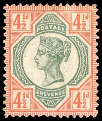 1892 Jubilee 4½d colour trial with head plate in green and duty plate in orange on crown wmkd paper, fine o.g. scarce. SG 206va