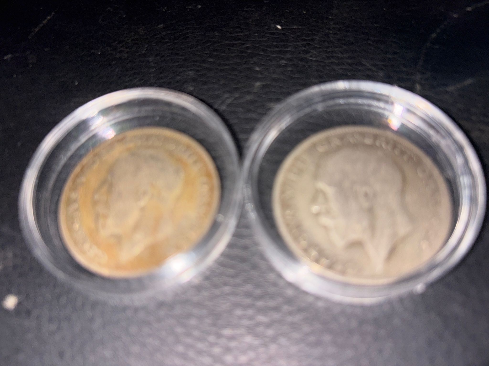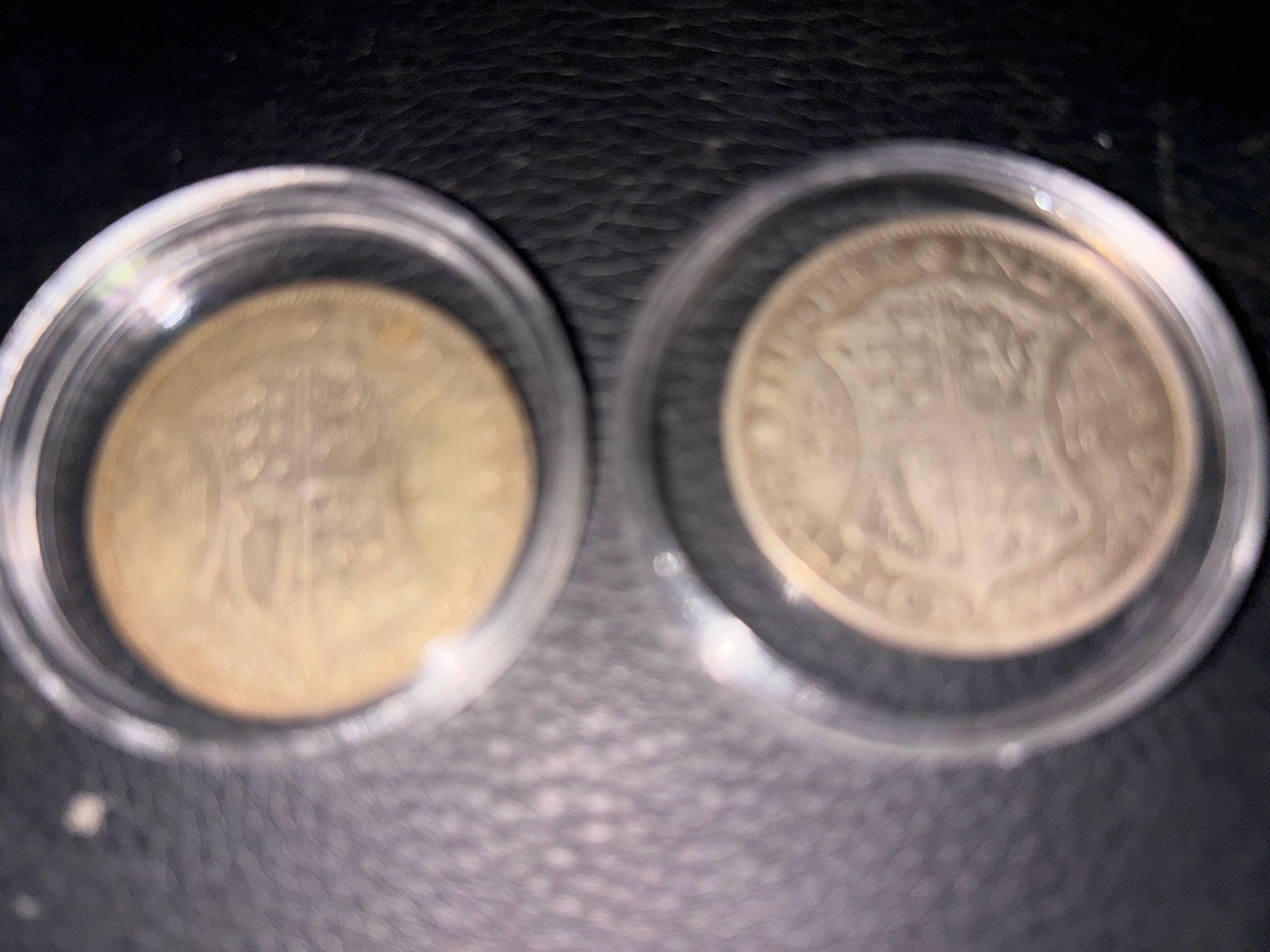 Two George V Silver Half Crowns – 1928 & 1929 – British Pair A matched pair of original British half crown coins from the reign of George V, dated 1928 and 1929. Struck in .500 silver (post-1920 issue), both coins feature the classic crowned shield reverse. Each shows honest circulation wear consistent with age, but remains clear, solid and collectable. Presented in protective capsules and offered together as a pair. A tidy late-1920s duo with good silver content and strong collector appeal.