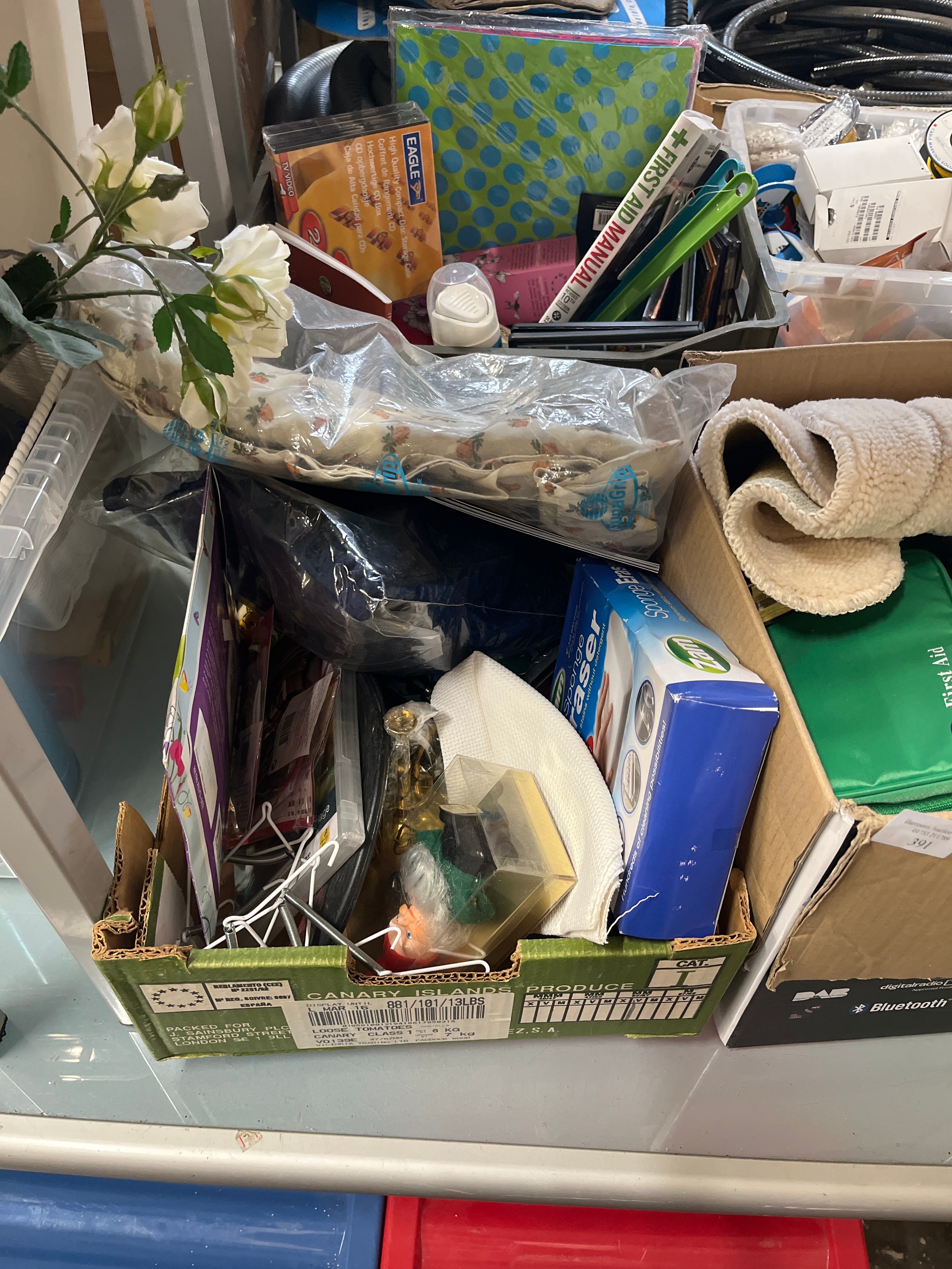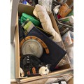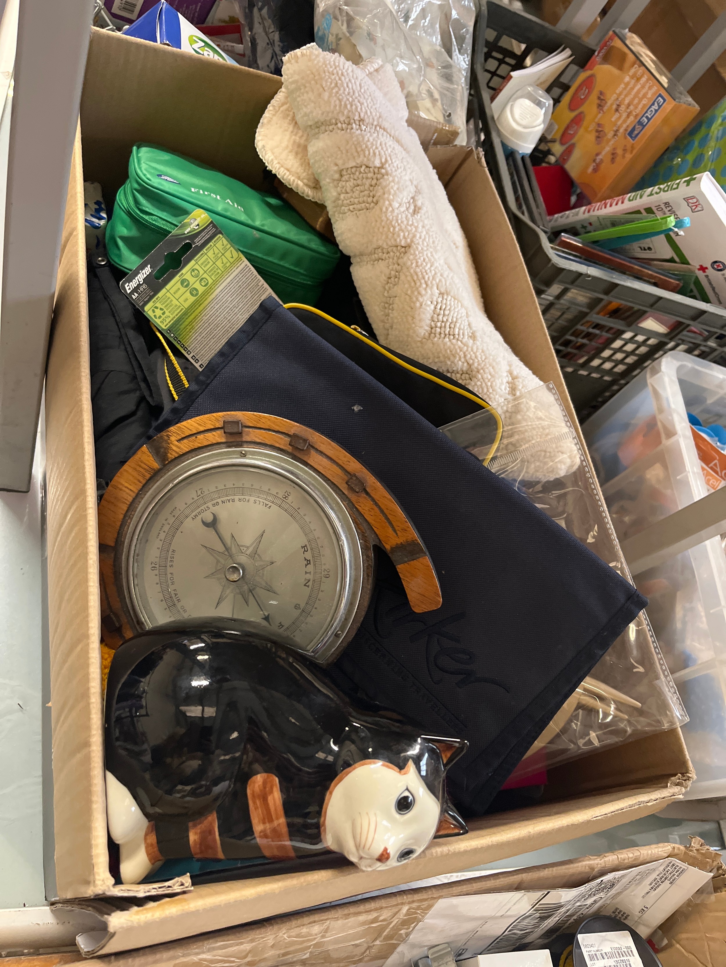 3 MARVELLOUS MIXED MISCELLANY BOXES WITH A QUAIL CAT FIGURE, HORSESHOE BAROMETER, KNITTED FLOWERS, CRAFT ITEMS AND LOTS MORE