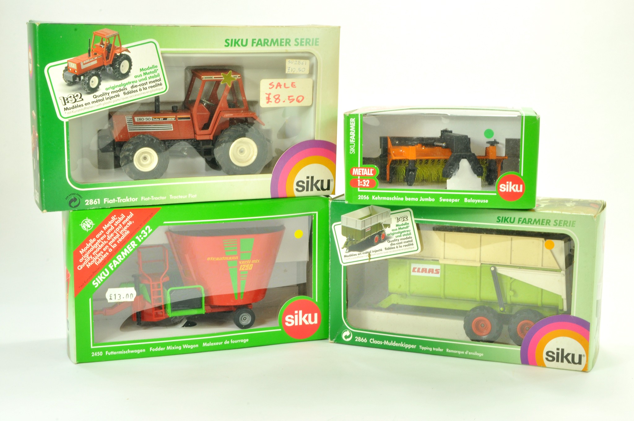 Siku 1/32 Farm Toy / Model Group comprising various implements plus Vintage Fiat Tractor. Excellent, look in general to not have been previously displayed with original boxes.