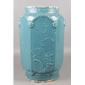 A Chinese hexagonal pottery seat in a blue glaze with prunus blossom decoration. Height 47cm.