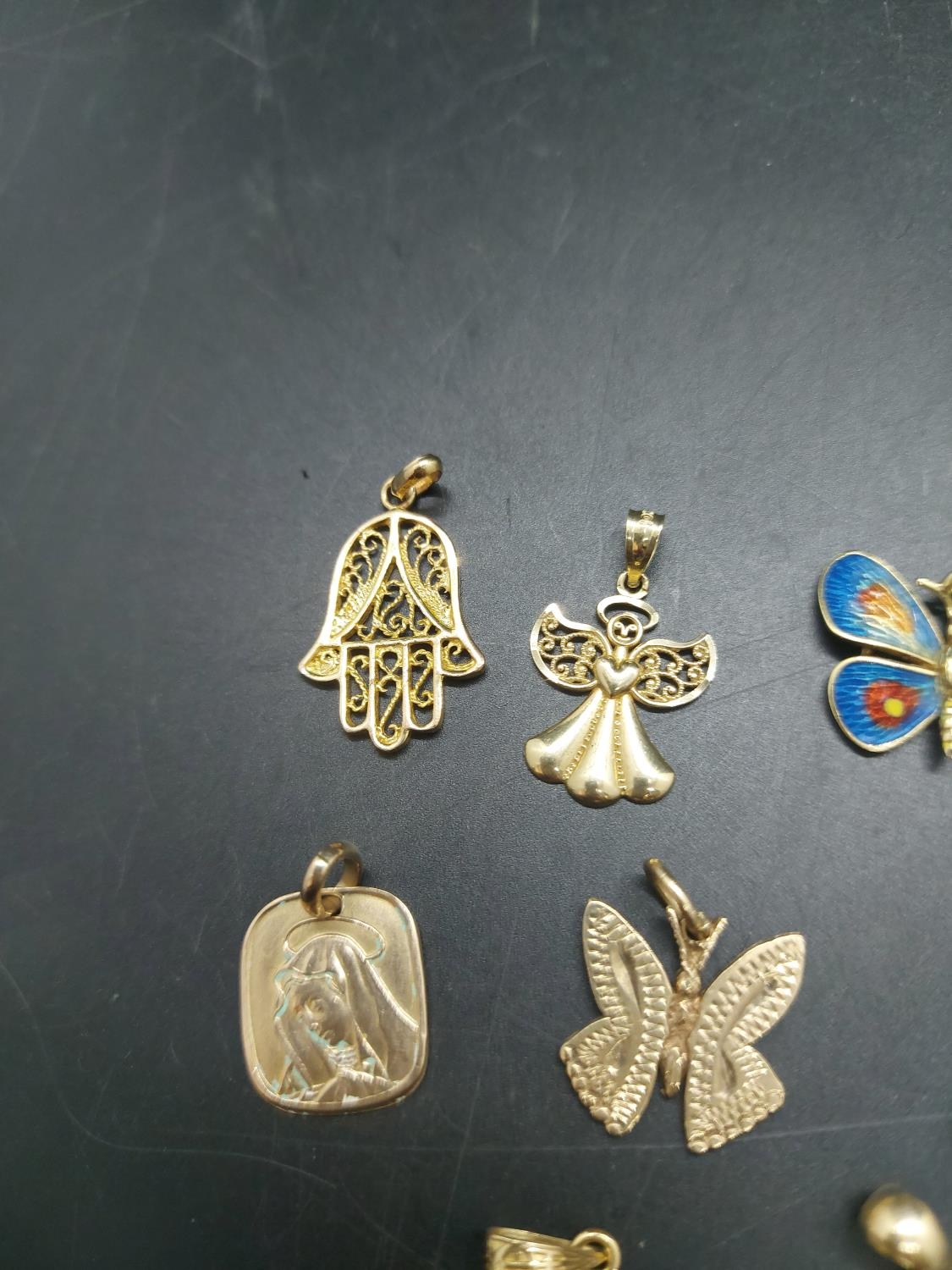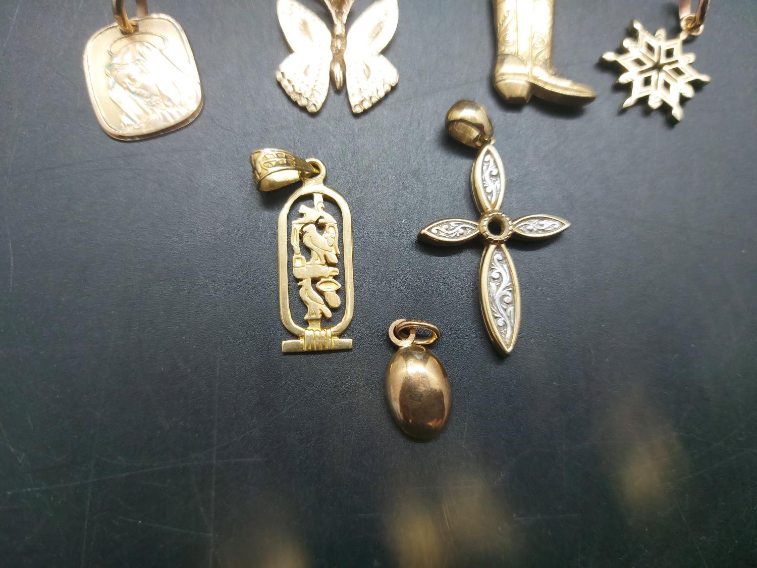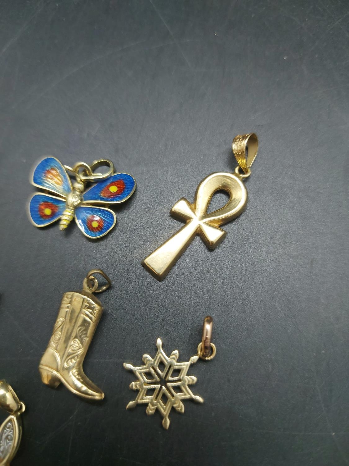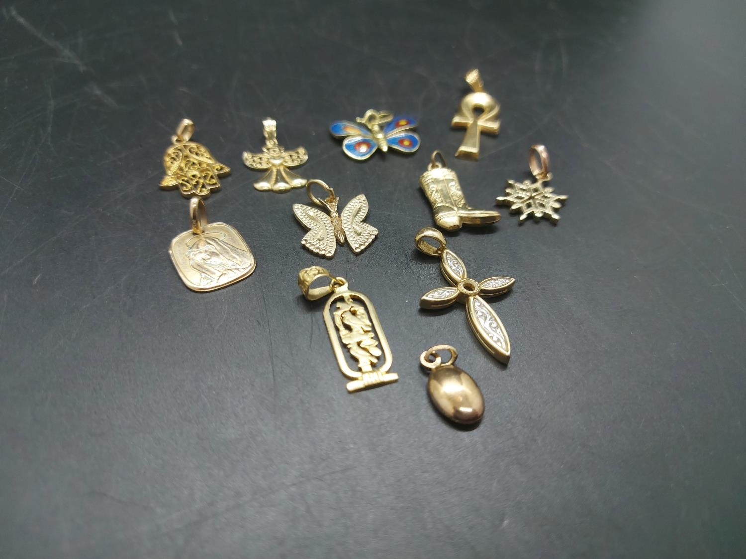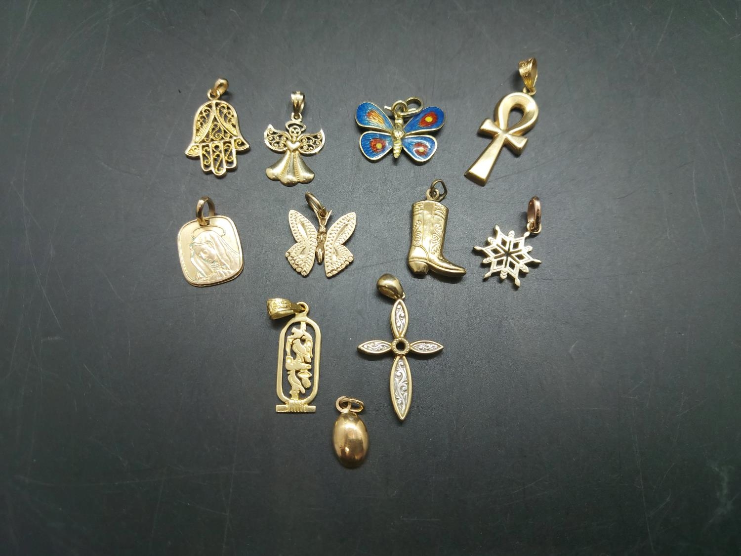 Eleven various necklace pendants, four 9ct gold - combined gross weight 5.25 grams, two 14ct including enamel butterfly - combined gross weight 5.2 grams and five yellow metal