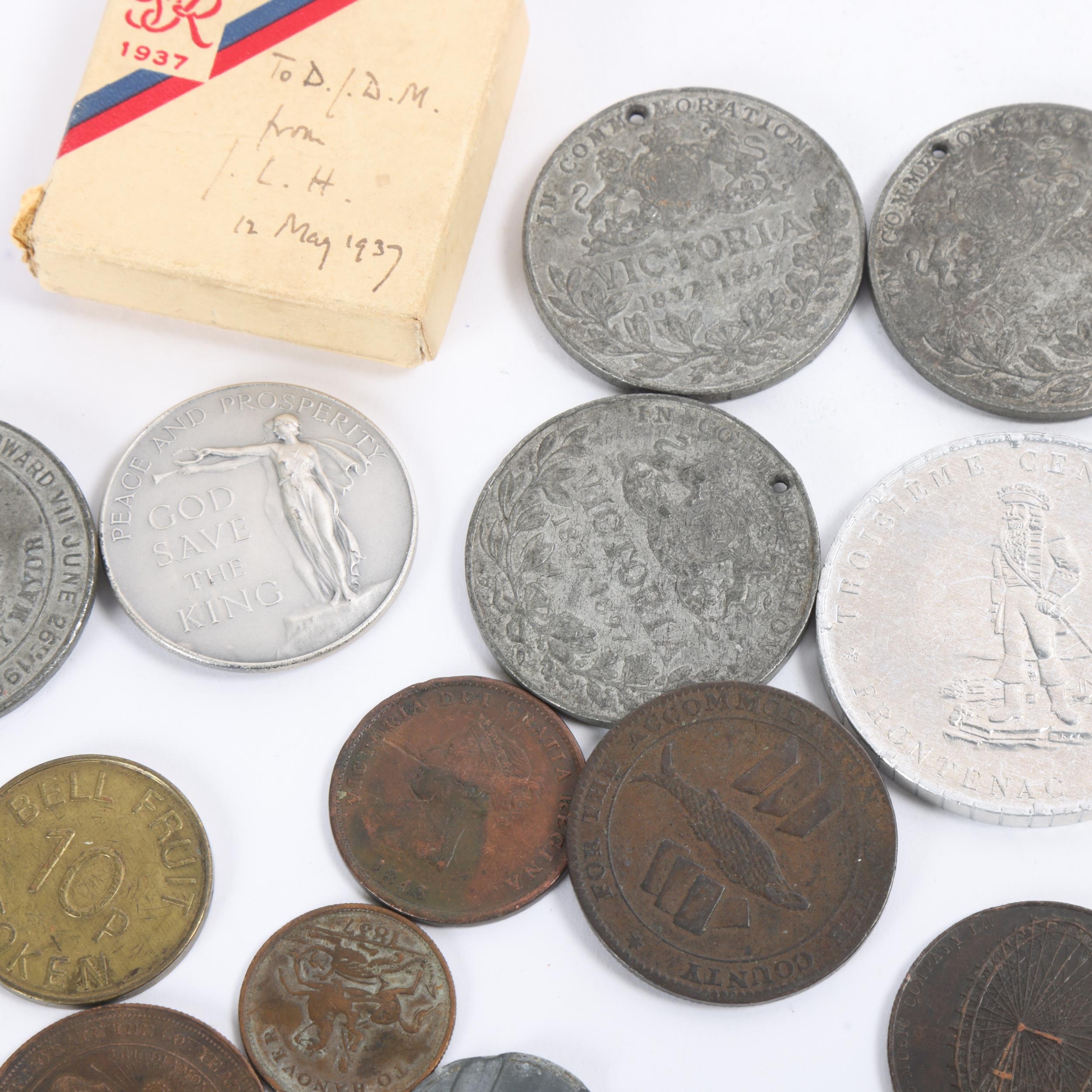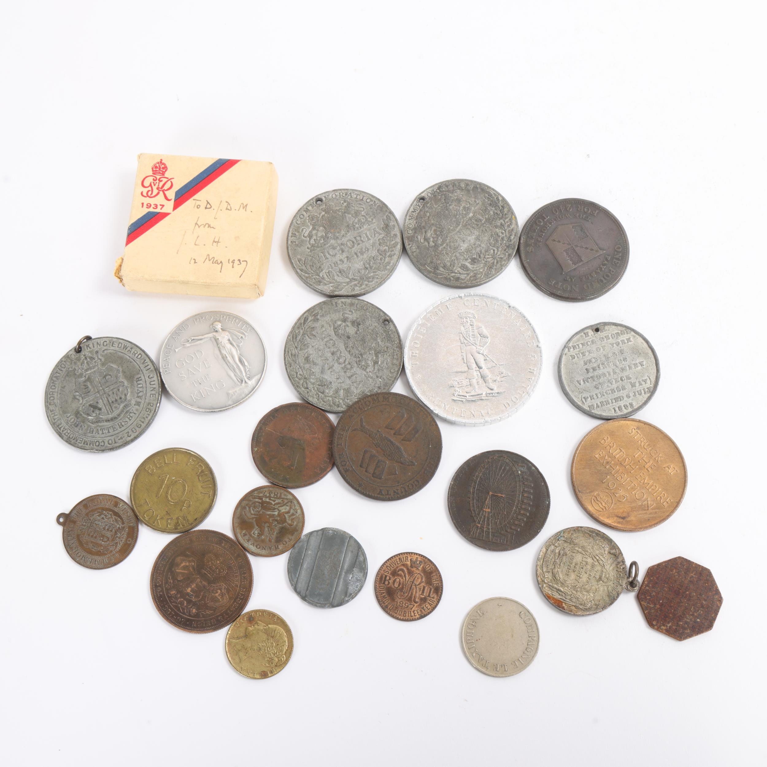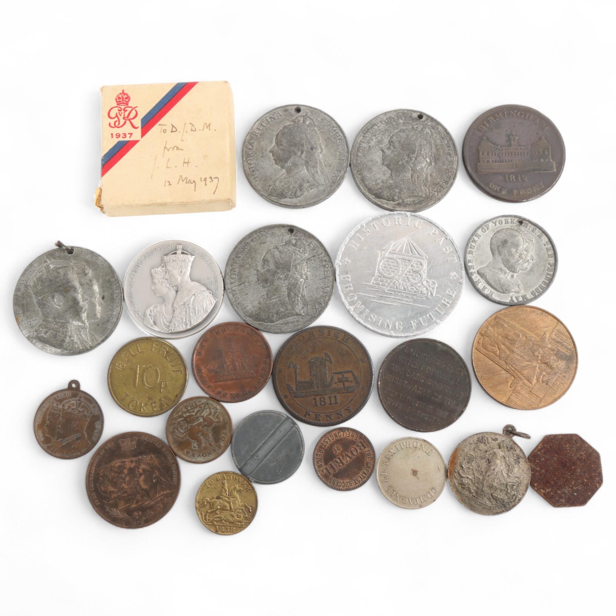 A collection of 19th and 20th century British tokens and medallions, including 1812 Birmingham Workhouse Penny, Queen Victoria 60th Jubilee medals, Nobel 1925Empire Exhibition Medal etc (22)
