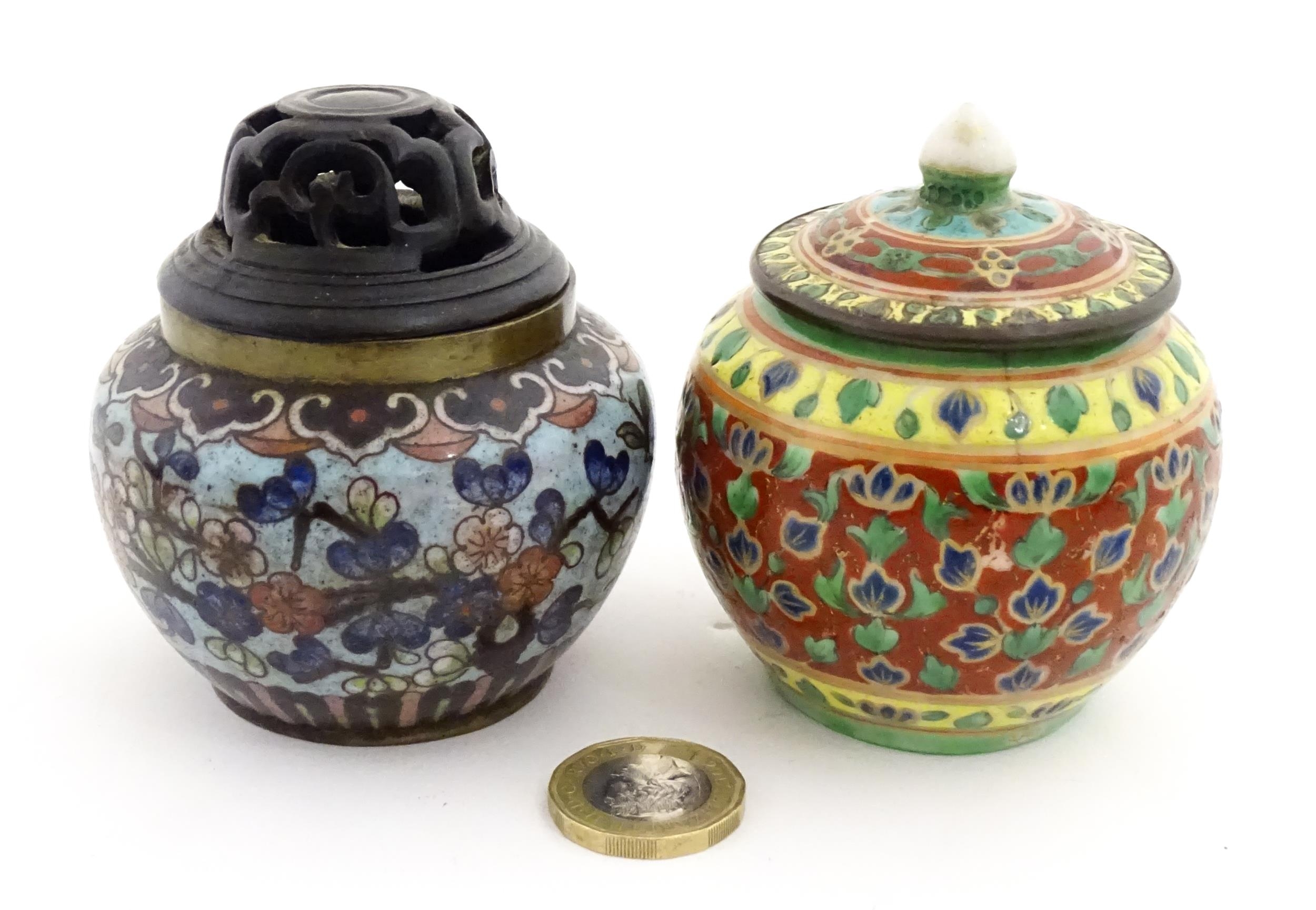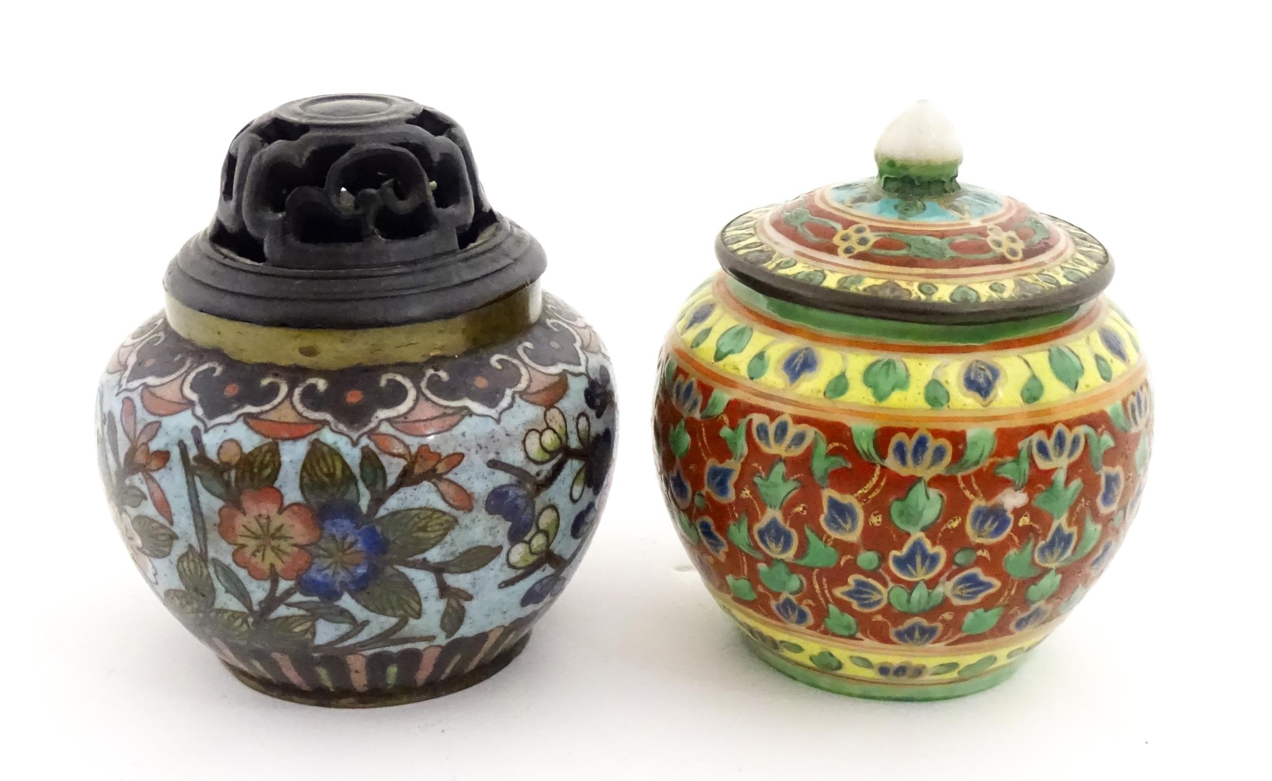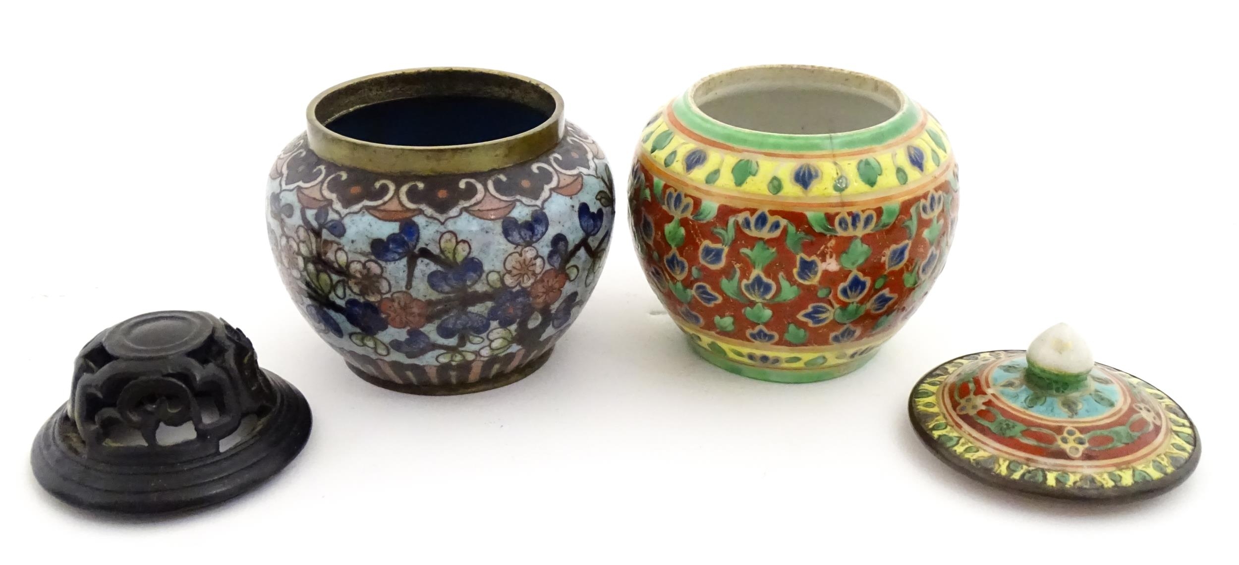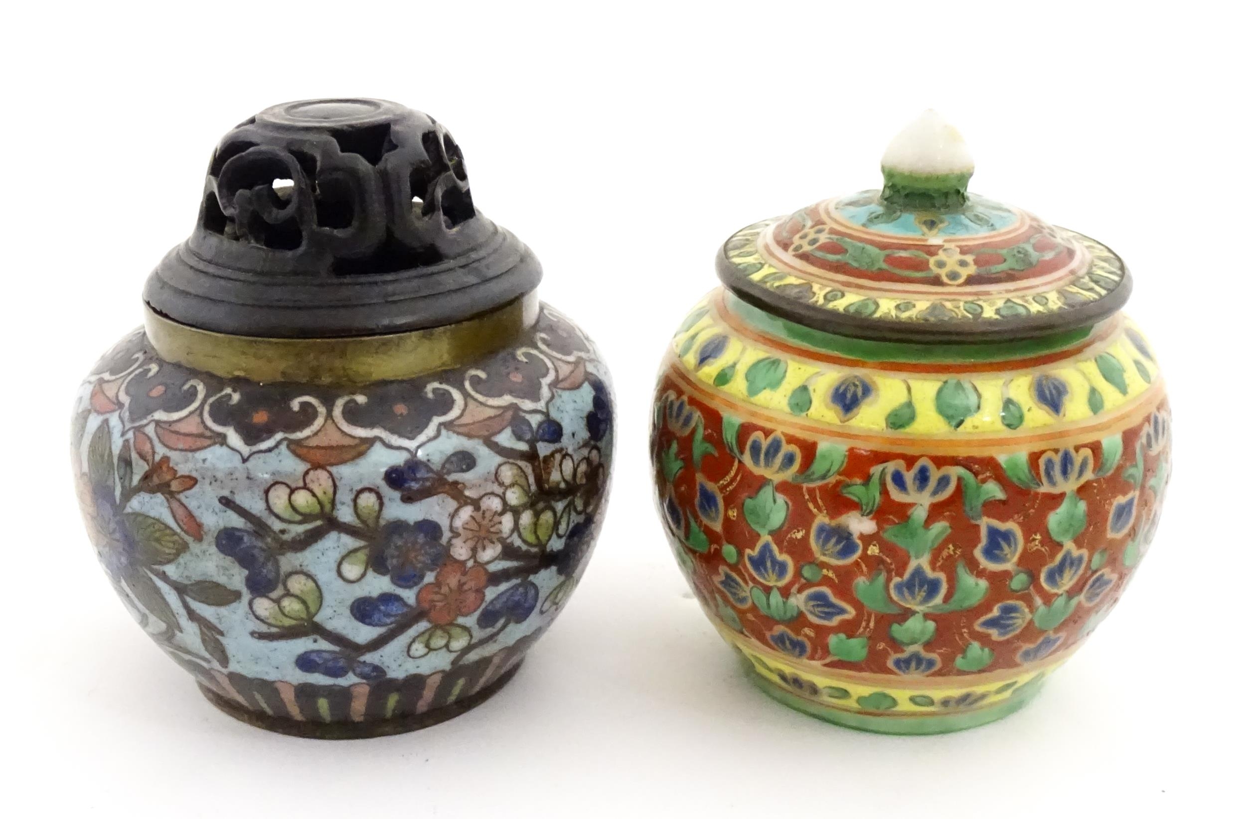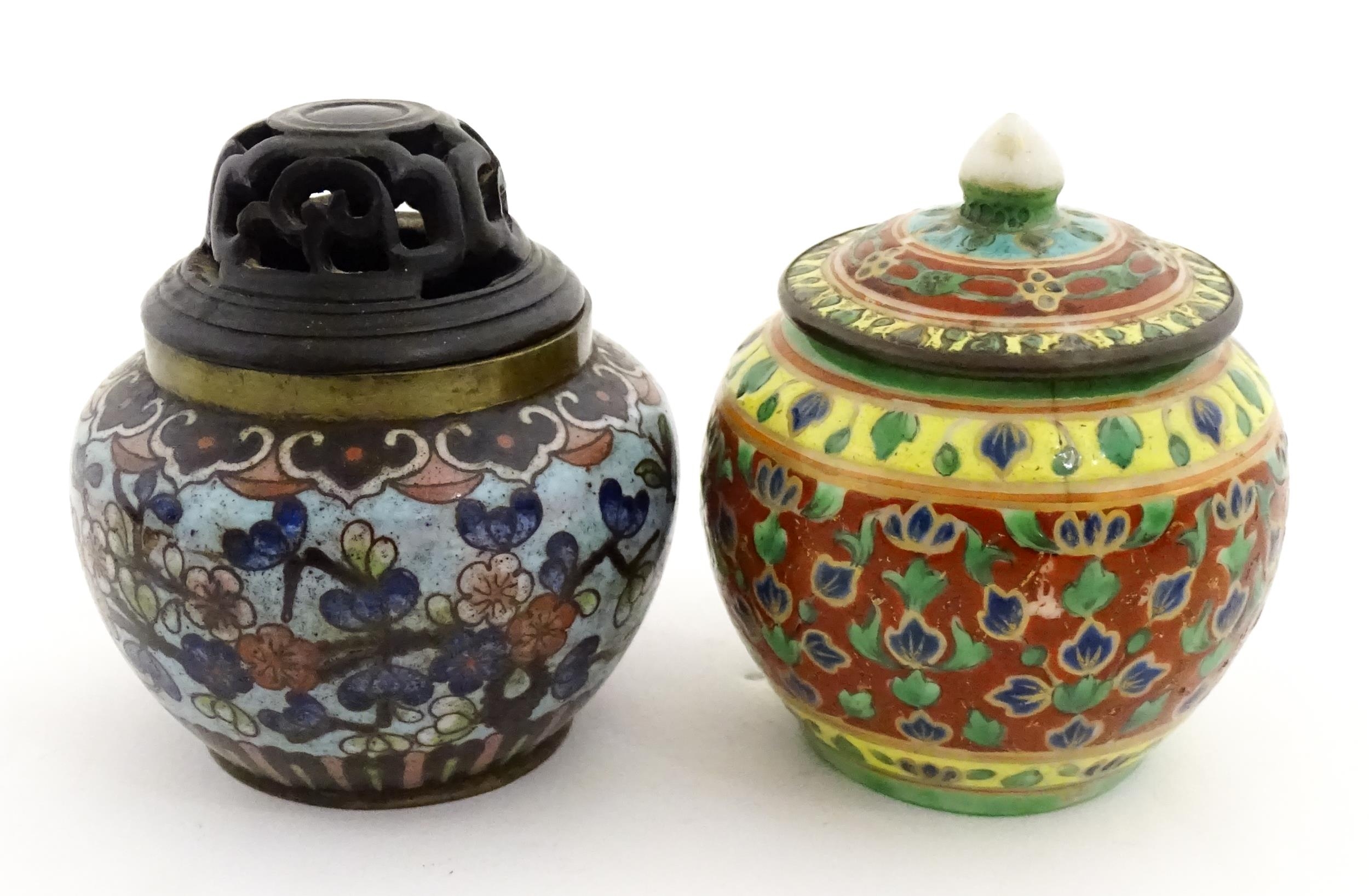 A small Oriental cloisonne pot with floral and foliate decoration. Together with a small Chinese ceramic pot and cover with flower detail. Largest approx. 3" high overall (2)