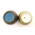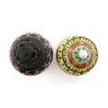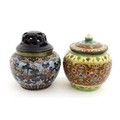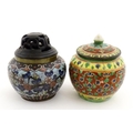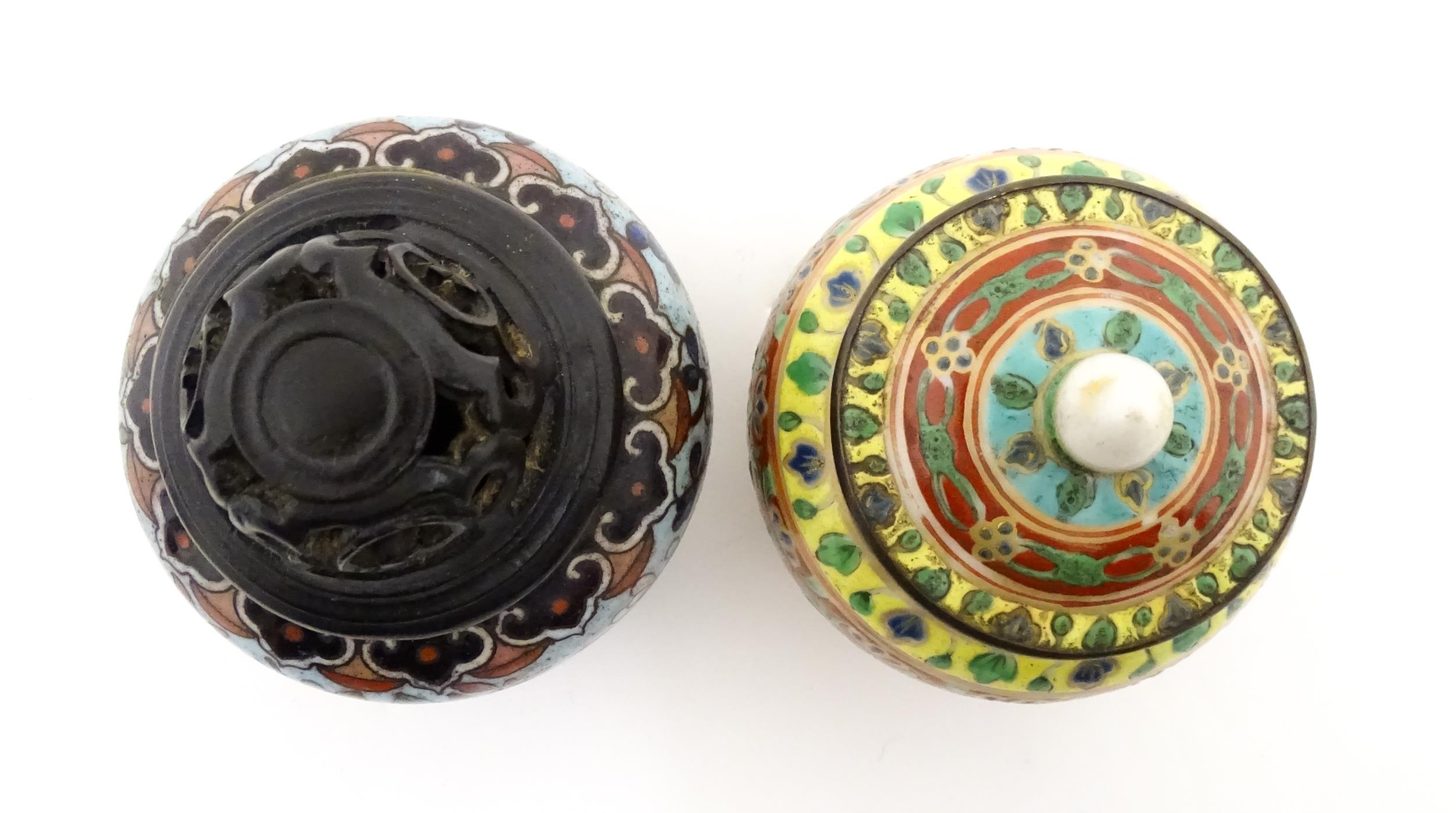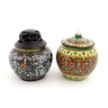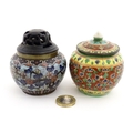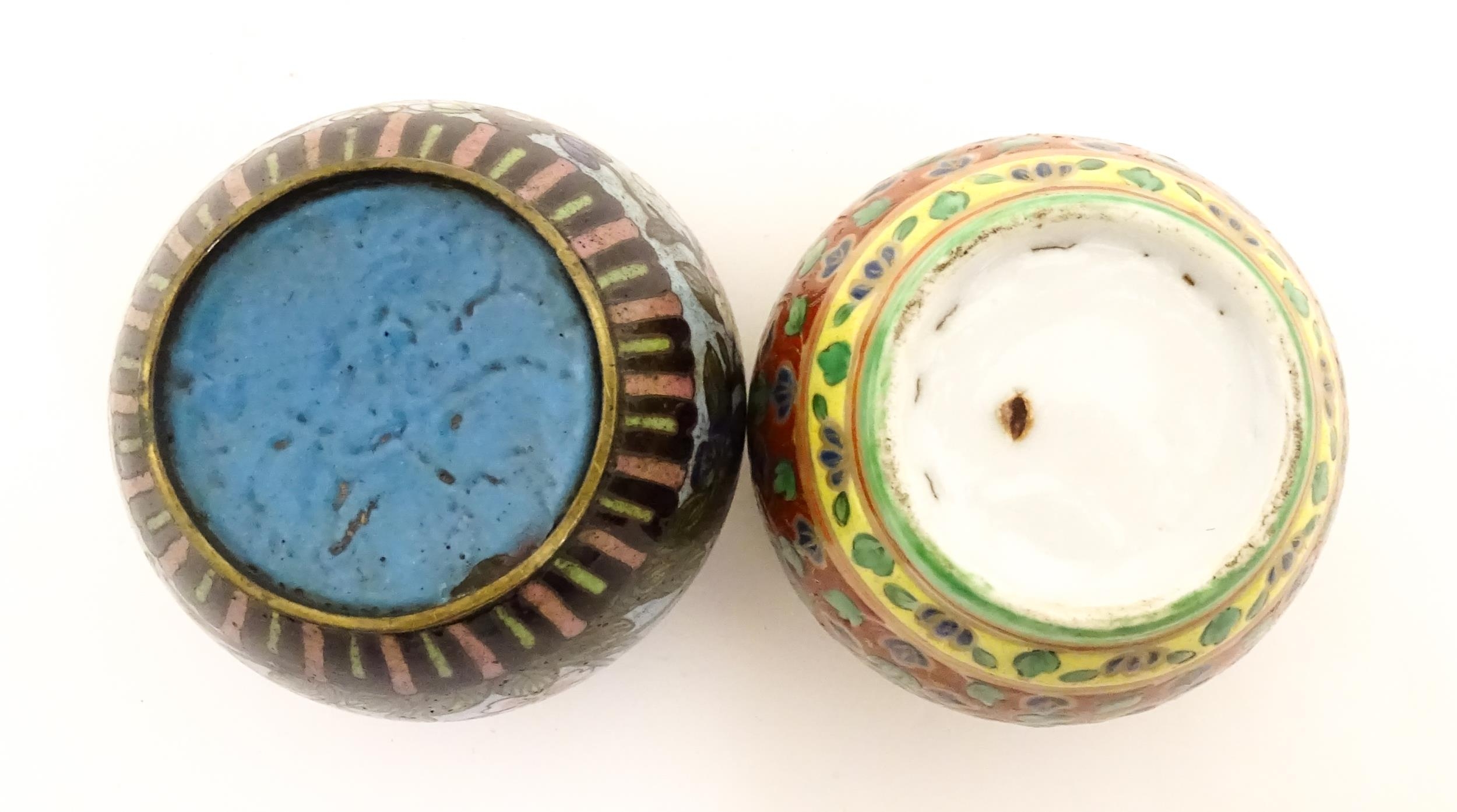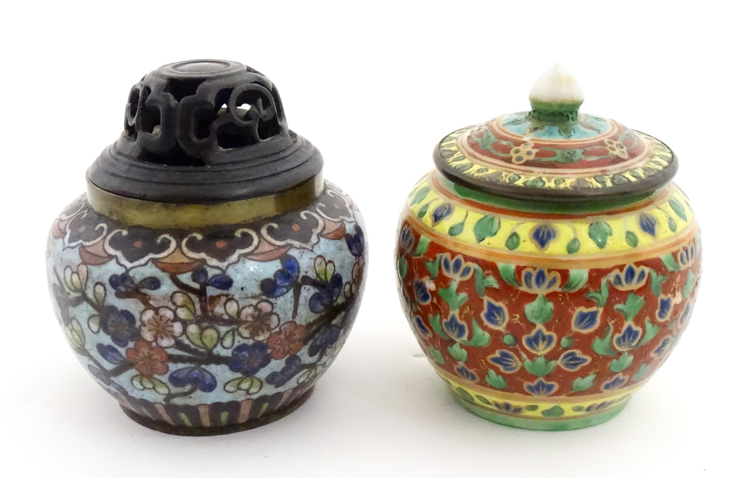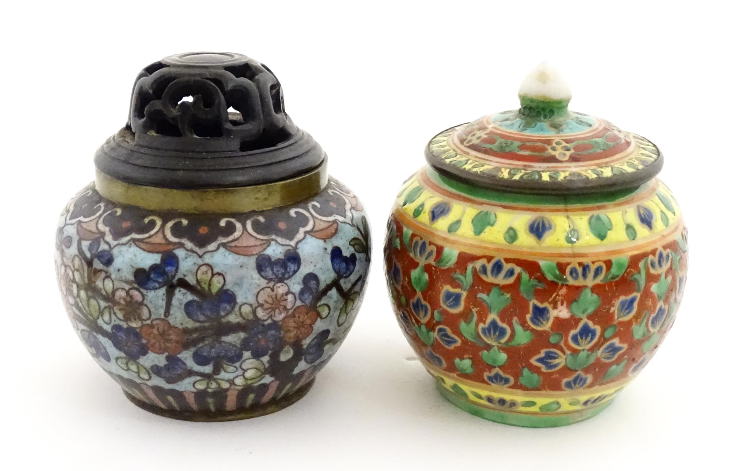 A small Oriental cloisonne pot with floral and foliate decoration. Together with a small Chinese ceramic pot and cover with flower detail. Largest approx. 3" high overall (2)