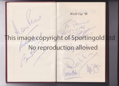 WORLD CUP 1966 / AUTOGRAPHS Hardback book World Cup '66 by Hugh McIlvanney, Sportsmans Book Club edition (no cover but in good condition) signed on frontispiece (To Dennis) by Geoff Hurst, Roger Hunt, Ray Wilson, George Cohen, Alan Ball, Martin Peters, Gordon Banks and Bobby Charlton. Good