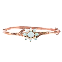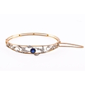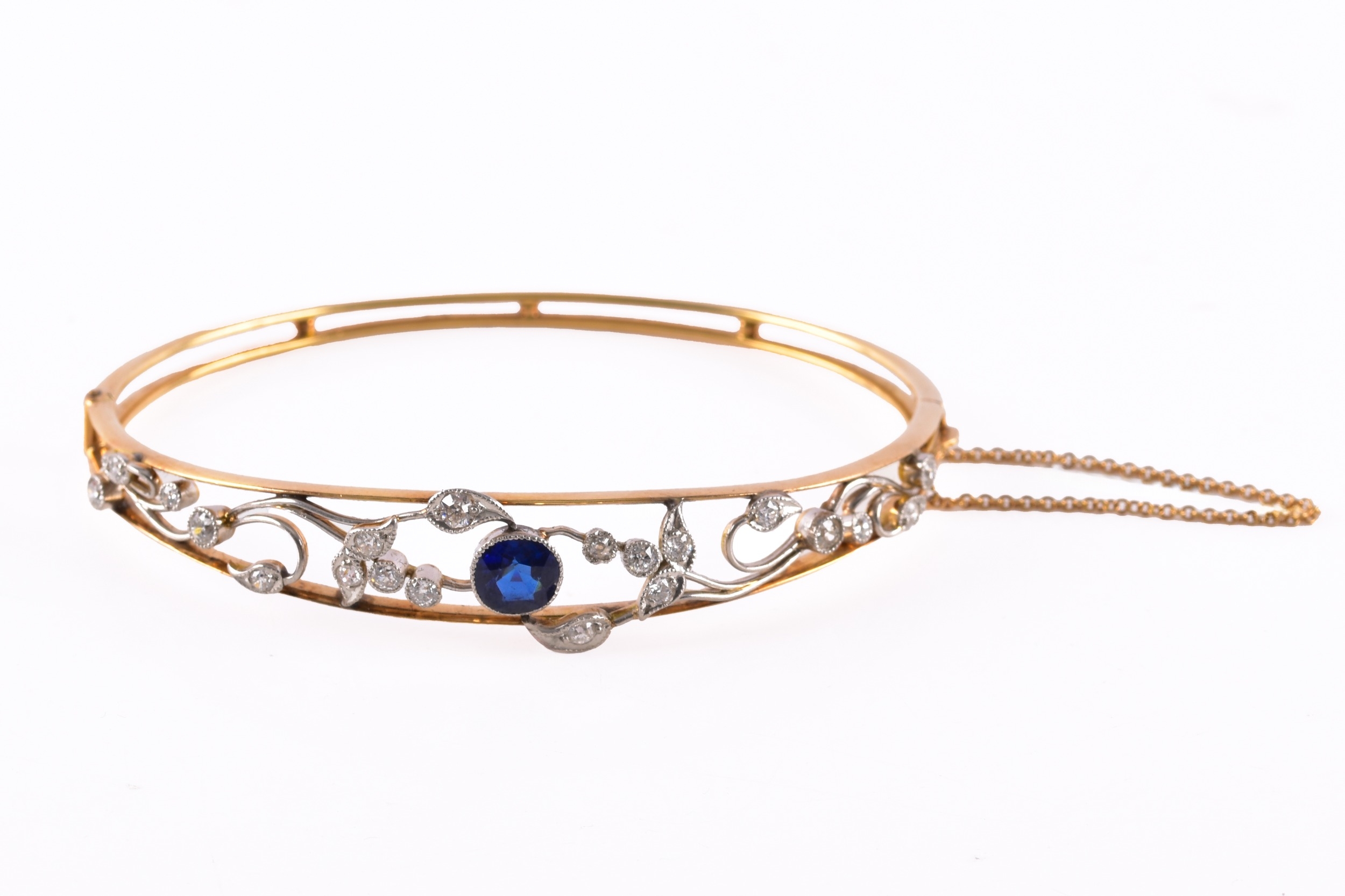 A yellow gold and platinum bangle, set to the centre with a cushion shape sapphire with an approximate weight of 1.22 carats in a rubover millegrain edge setting, surrounded by twenty round old cut diamonds set within a platinum foliate design, featuring intricate openwork, 6 cm diameter, fitted with tongue clasp and safety chain.