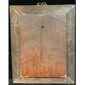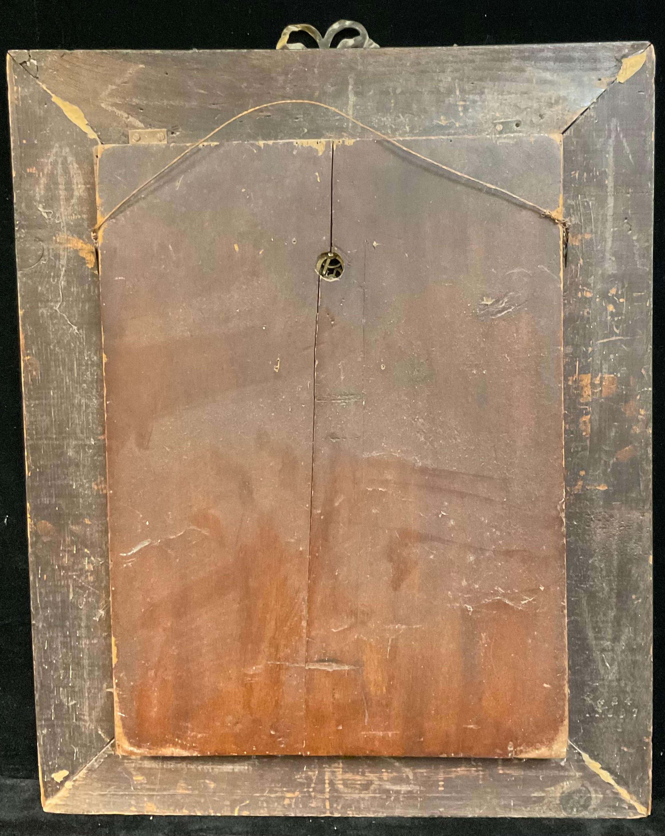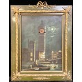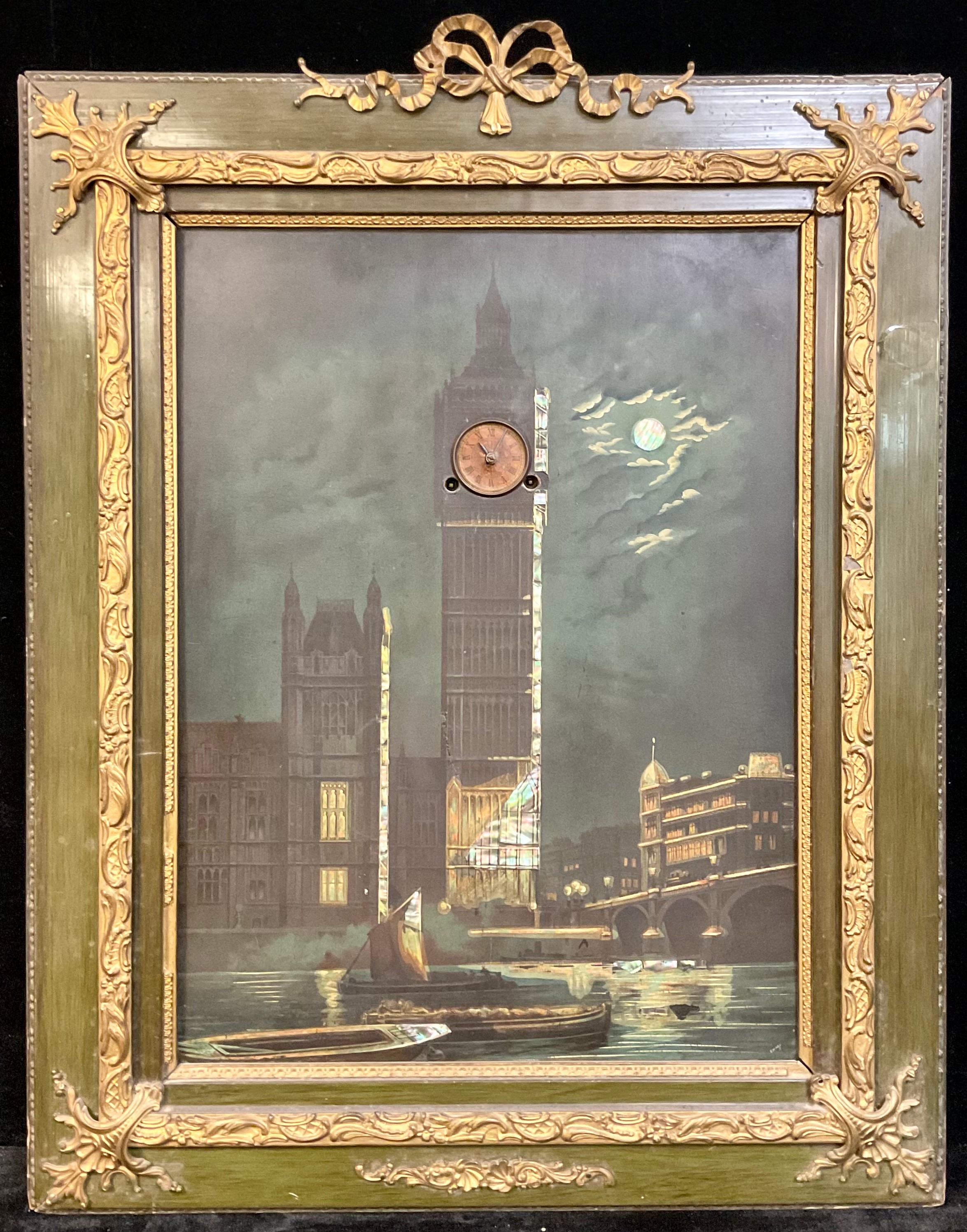 A 19th century novelty papier mache 'automaton' musical clock, the panel with a view of the Houses of Parliament overlooking the River Thames at night, the moonlight picked out with mother of pearl, the Elizabeth Tower enclosing a 4cm dial inscribed with Roman numerals and flanked by a pair of twin-winding holes, the panel 49cm x 36cm, the gilt metal mounted green scumbled frame with tied ribbon crest, 69cm x 54cm overall