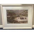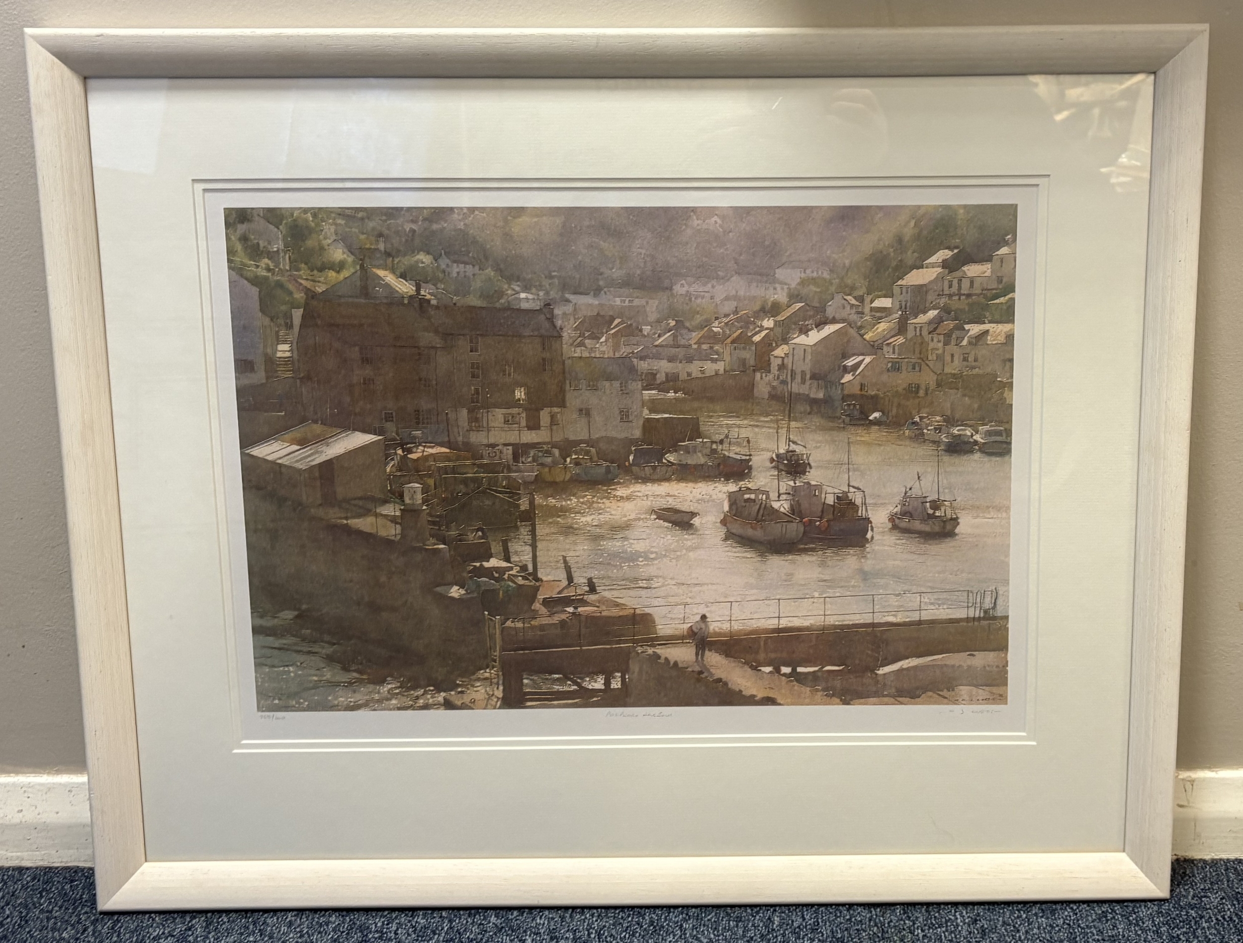 D J CURTIS: A framed and glazed limited edition print entitled 'Polperro Harbour'. Number 265 / 600. Approx. 52 cm x 34.5 cm (ss). Est. £20 - £30.