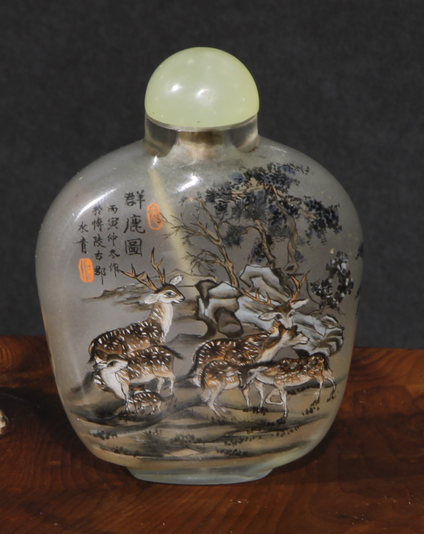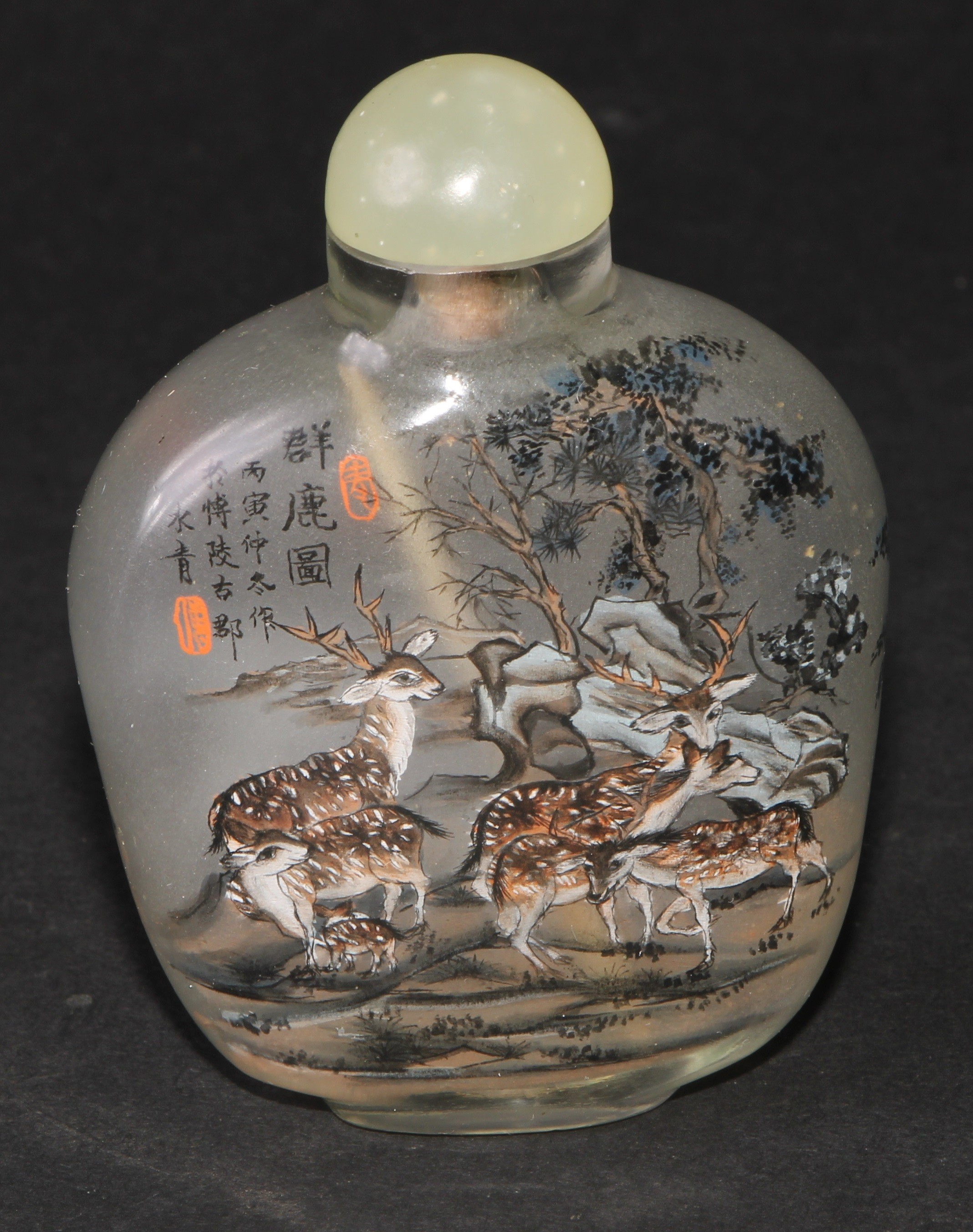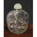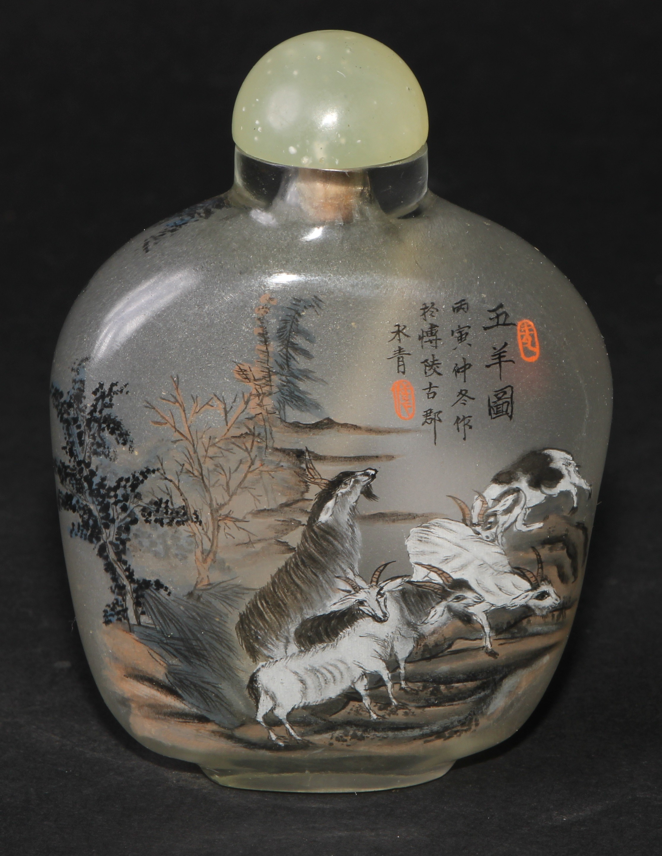 A Chinese inside painted flattened ovoid snuff bottle, decorated with verse, and goats grazing an outcrop, 8cm high