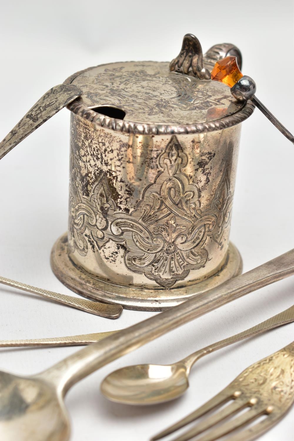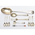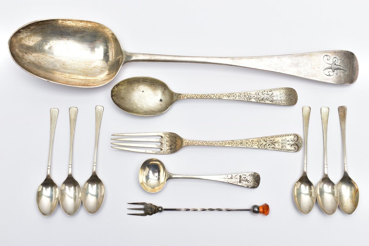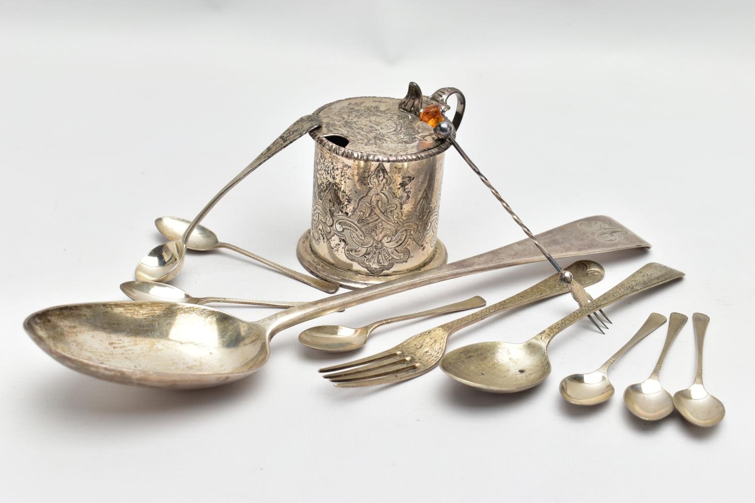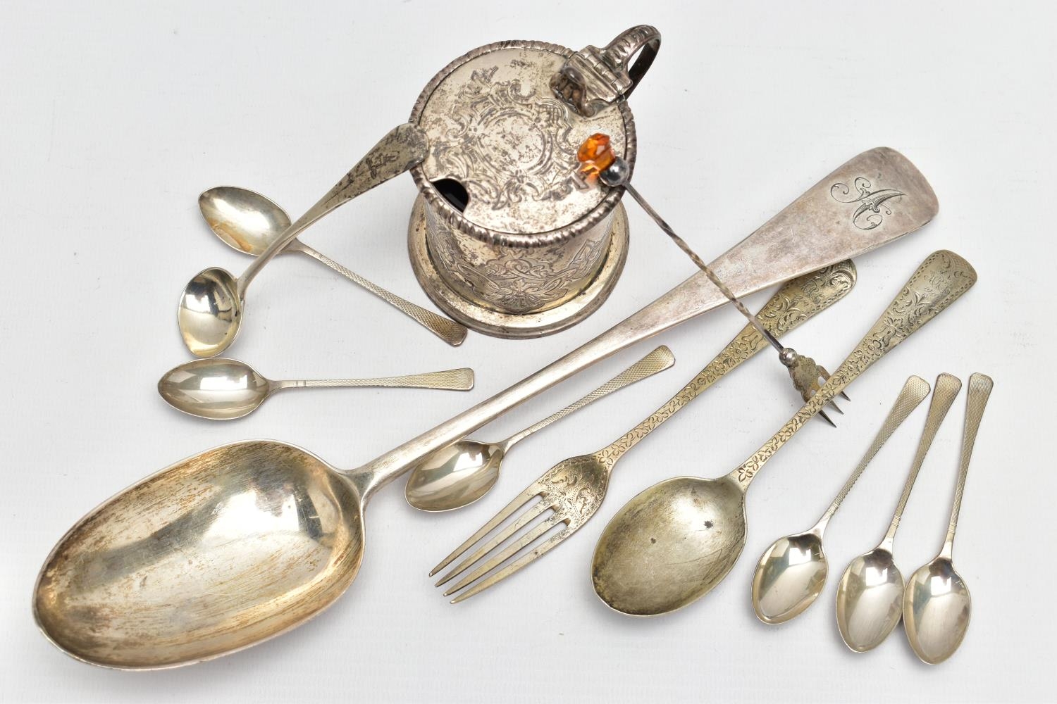 A VICTORIAN SILVER OLD ENGLISH PATTERN BASTING SPOON, TEN OTHER ITEMS OF 19TH AND 20TH CENTURY FLATWARE AND A VICTORIAN SILVER DRUM SHAPE COVERED MUSTARD, the basting spoon with engraved initial 'A', makers John Aldwinckle & Thomas Slater, London 1888, a set of six George VI silver coffee spoons, engine turned decoration to the handles, makers Travis, Wilson & Co Ltd, Sheffield 1940, an Edwardian dessert fork and spoon engraved with monogram 1910 and leaf decoration, makers Elkington & Co, Birmingham 1908, a pickle fork with orange paste thistle finial, a Victorian condiment spoon engraved with crest and the mustard with S scroll handle, foliate engraved decoration to hinged cover and side, blue glass liner, makers Charles Thomas Fox & George Fox, London 1851, gross weight 12.91ozt, 401.4 grams (12) (Condition report: dessert fork and spoon have wear to bowl and prongs, the mustard has some salt corrosion inside the cover and underside of base, one tiny chip to the rim of the liner, items generally need cleaning)