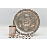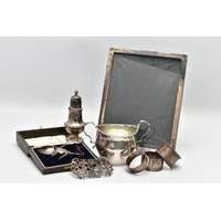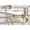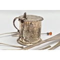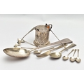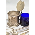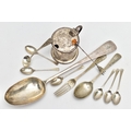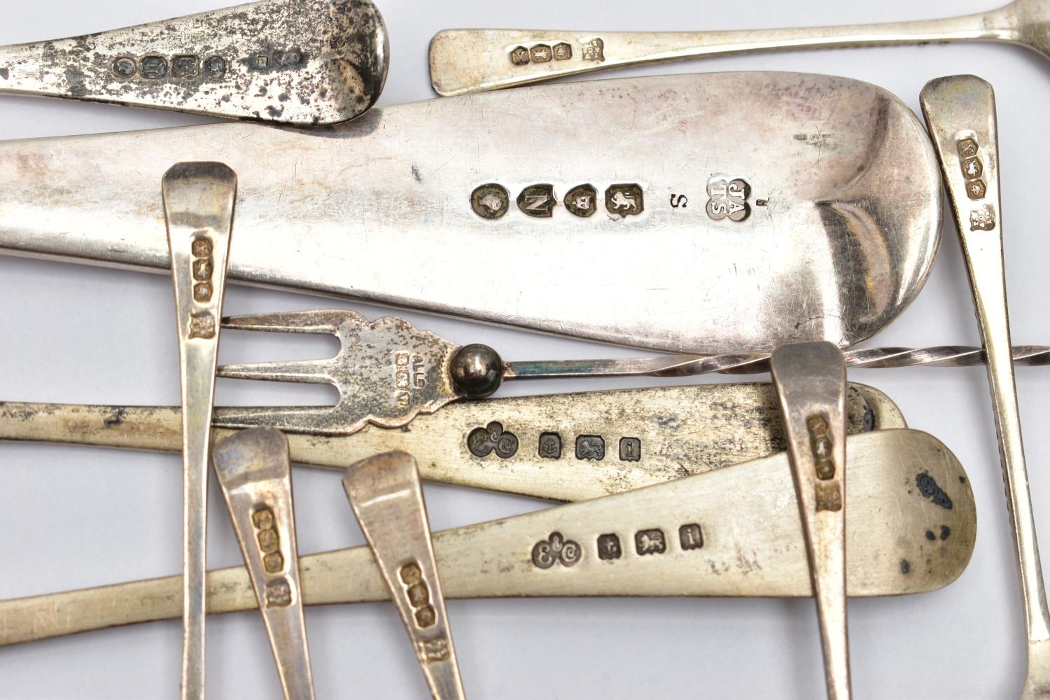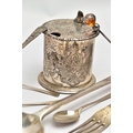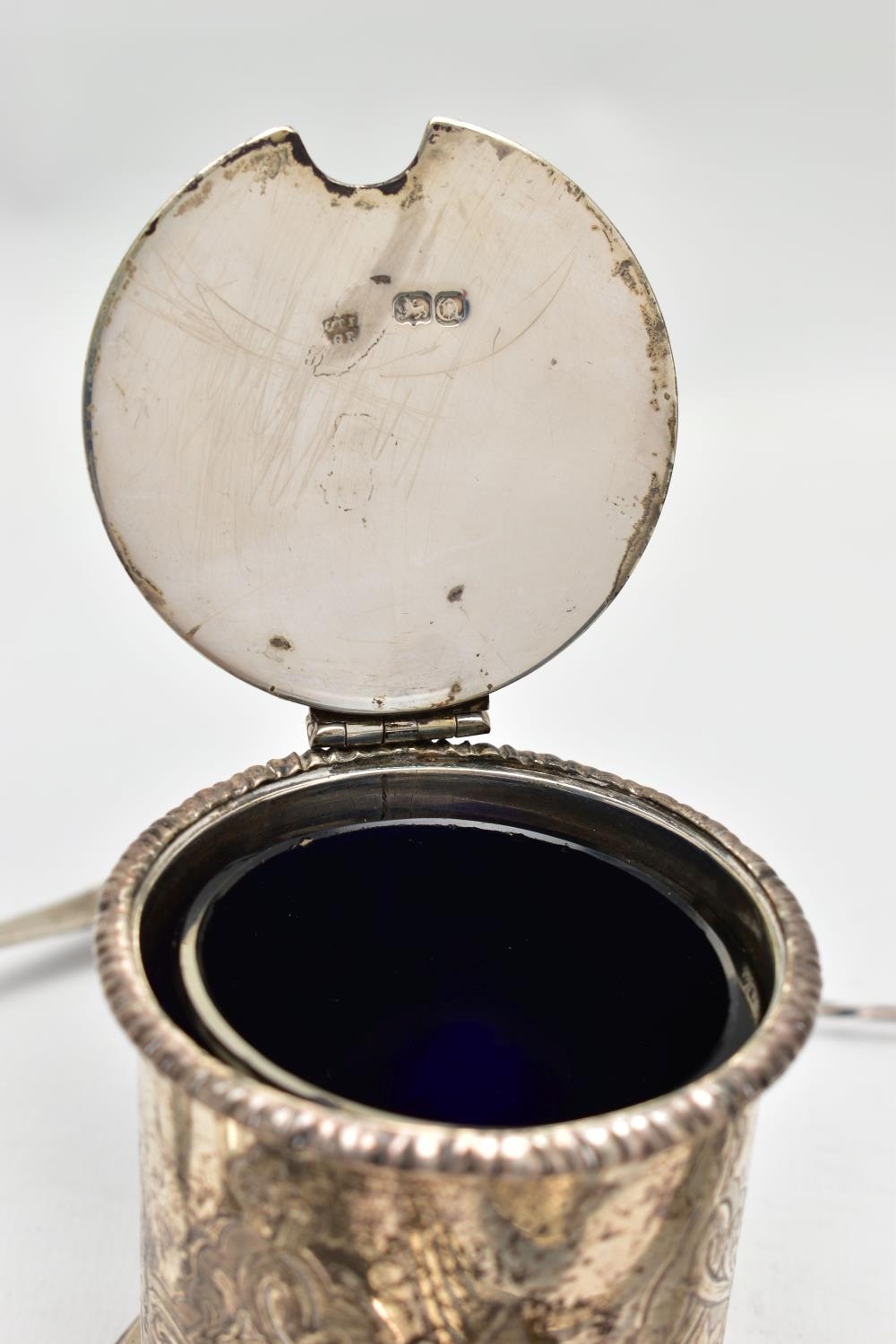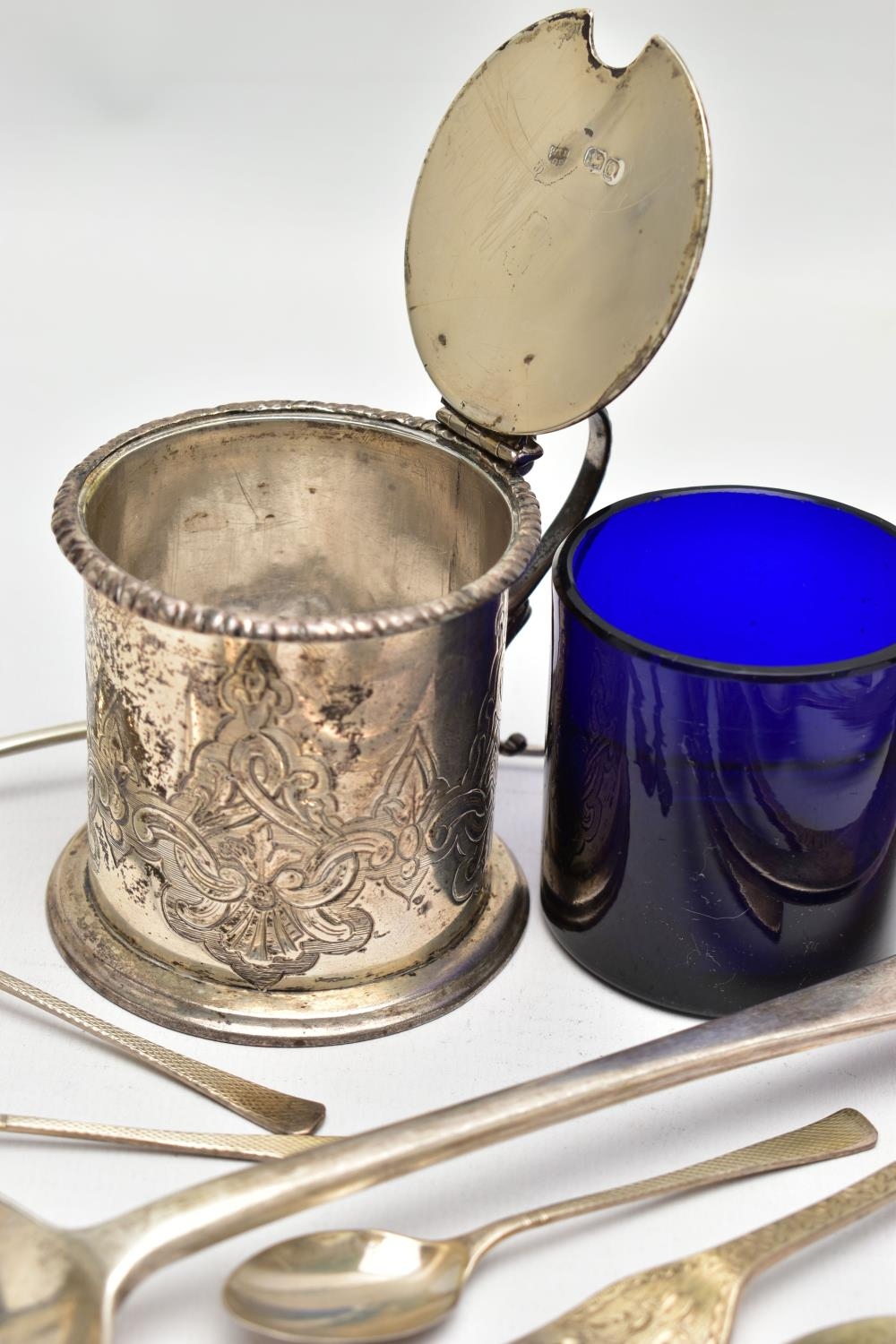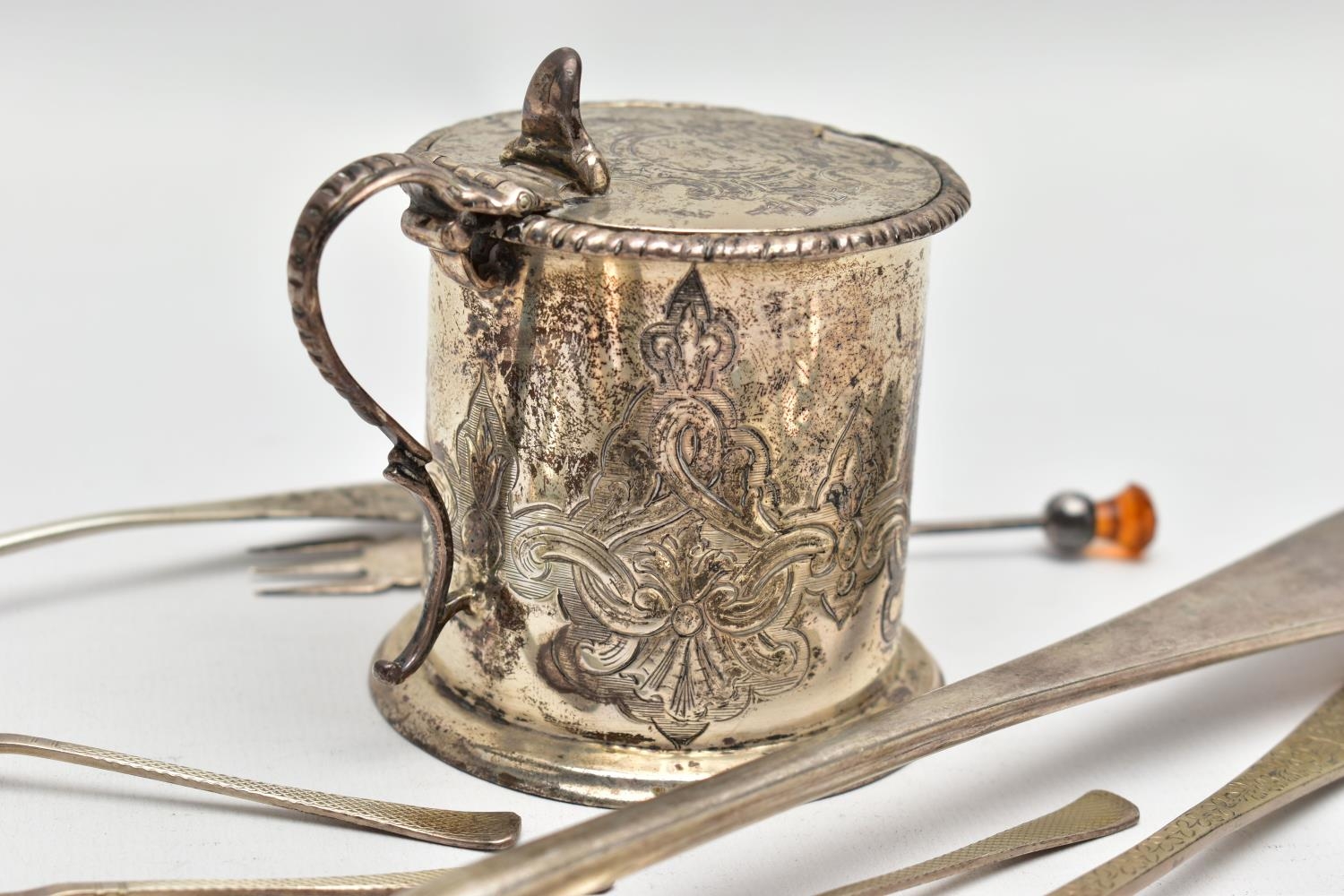 A VICTORIAN SILVER OLD ENGLISH PATTERN BASTING SPOON, TEN OTHER ITEMS OF 19TH AND 20TH CENTURY FLATWARE AND A VICTORIAN SILVER DRUM SHAPE COVERED MUSTARD, the basting spoon with engraved initial 'A', makers John Aldwinckle & Thomas Slater, London 1888, a set of six George VI silver coffee spoons, engine turned decoration to the handles, makers Travis, Wilson & Co Ltd, Sheffield 1940, an Edwardian dessert fork and spoon engraved with monogram 1910 and leaf decoration, makers Elkington & Co, Birmingham 1908, a pickle fork with orange paste thistle finial, a Victorian condiment spoon engraved with crest and the mustard with S scroll handle, foliate engraved decoration to hinged cover and side, blue glass liner, makers Charles Thomas Fox & George Fox, London 1851, gross weight 12.91ozt, 401.4 grams (12) (Condition report: dessert fork and spoon have wear to bowl and prongs, the mustard has some salt corrosion inside the cover and underside of base, one tiny chip to the rim of the liner, items generally need cleaning)