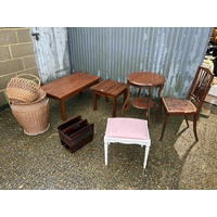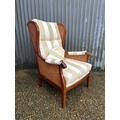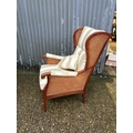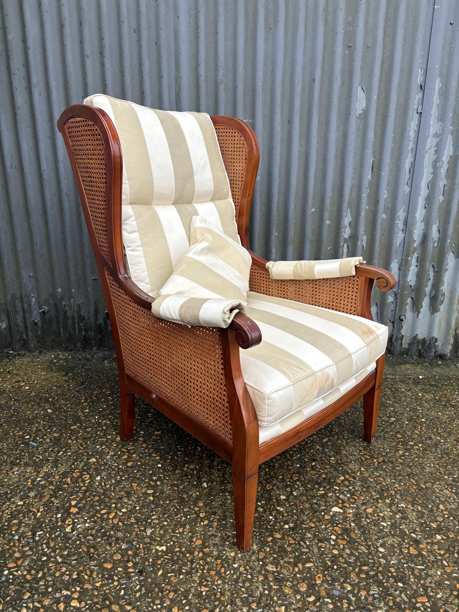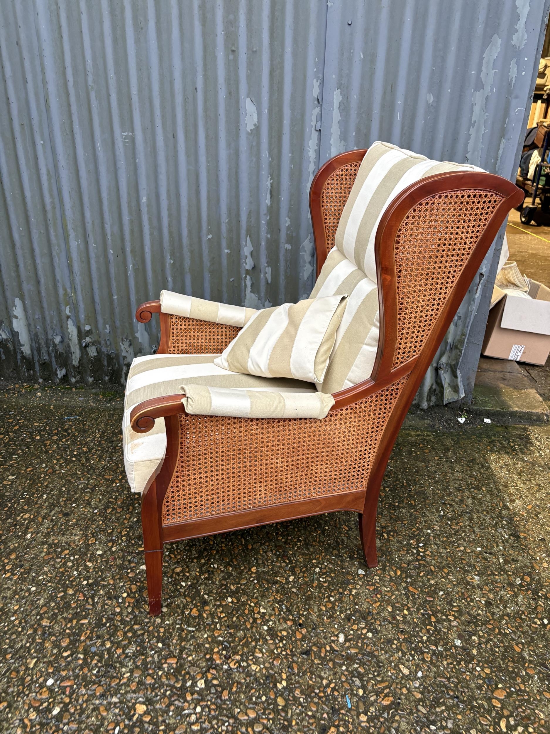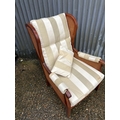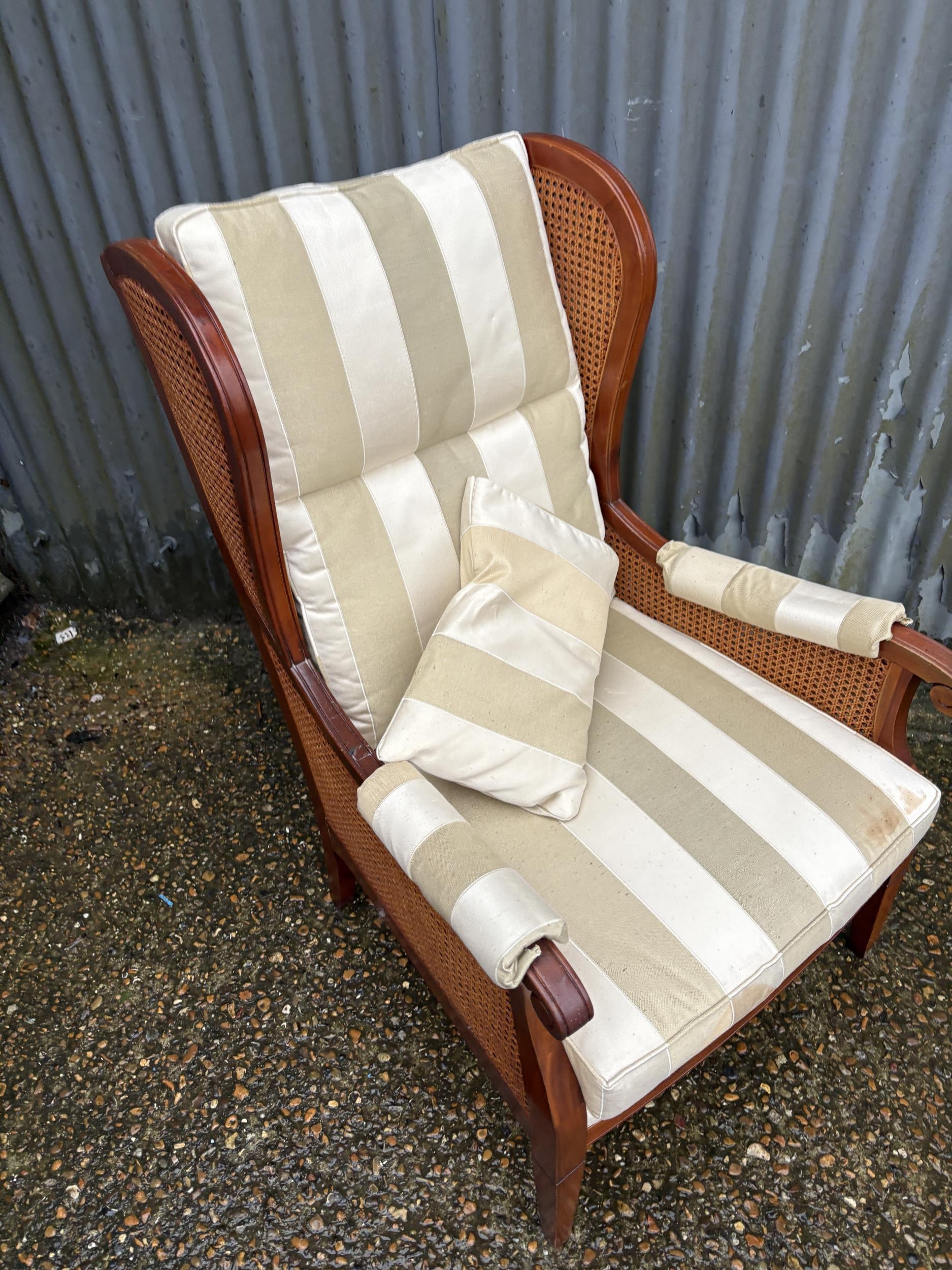 A Modern hardwood and begere armchair with gold stripe upholstery