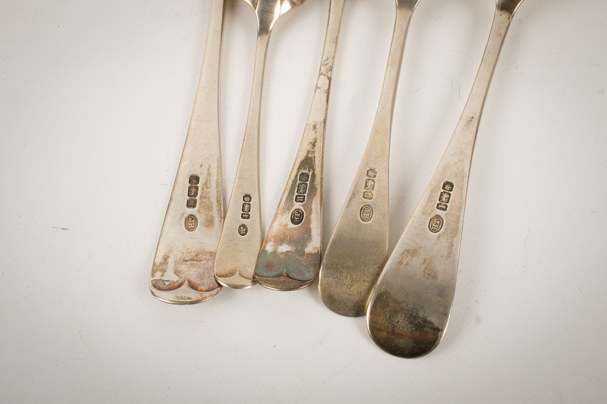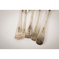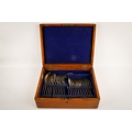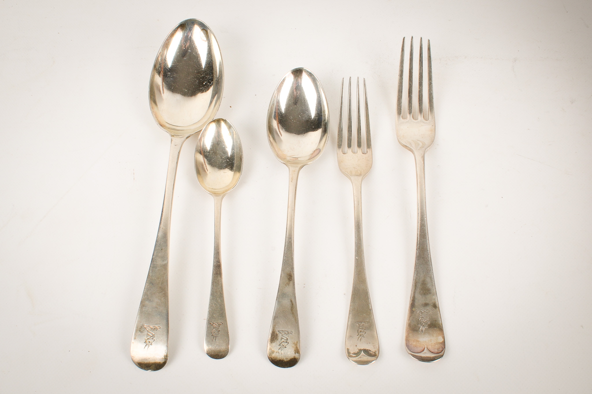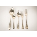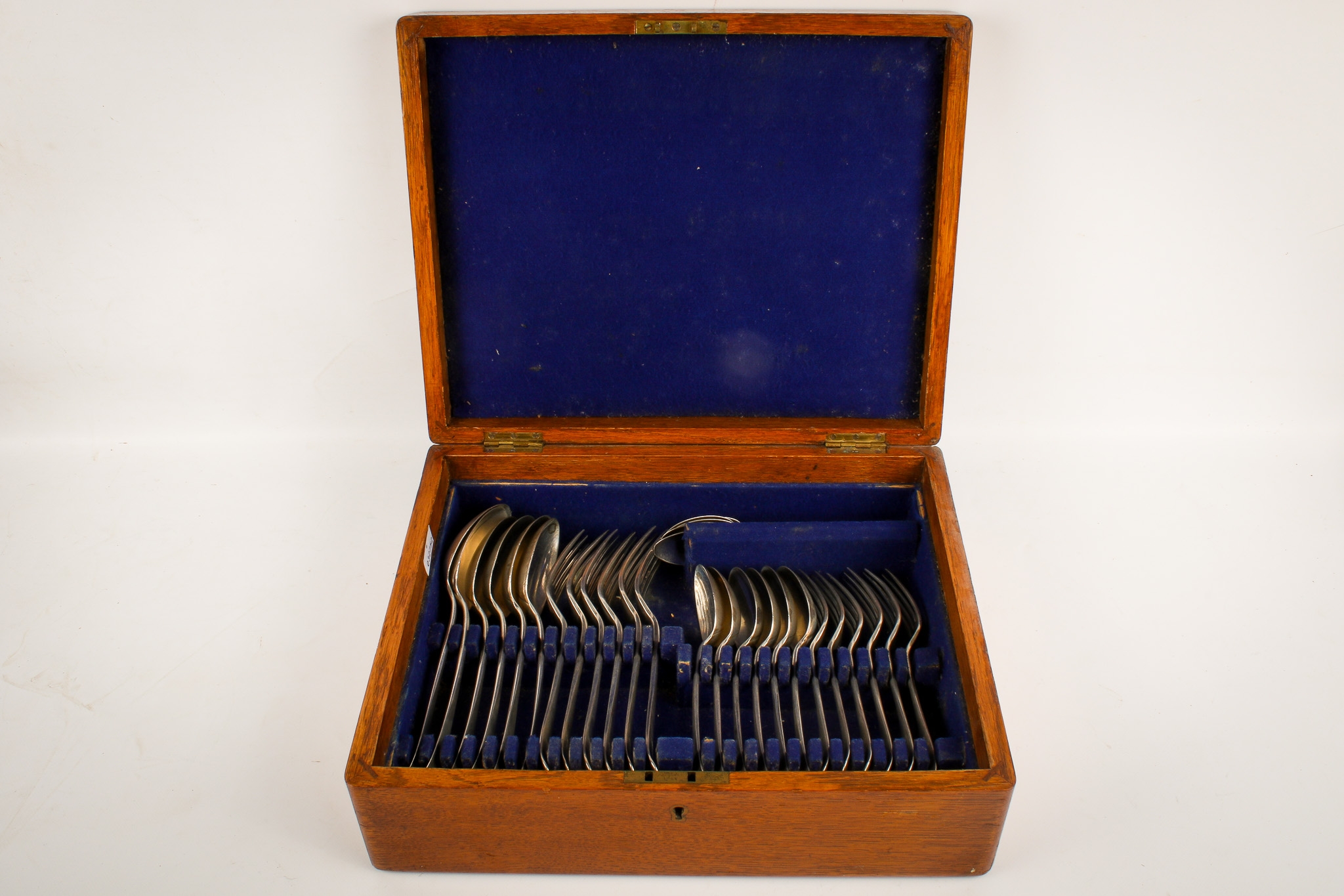 An early 20th century part canteen of silver cutlery. Comprising six large forks, six small forks, six dessert spoons, six serving spoons, nine teaspoons, hallmarks for John Round & Son Ltd, Sheffield 1903/1904, gross weight 1750.7g, in an oak canteen.
