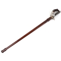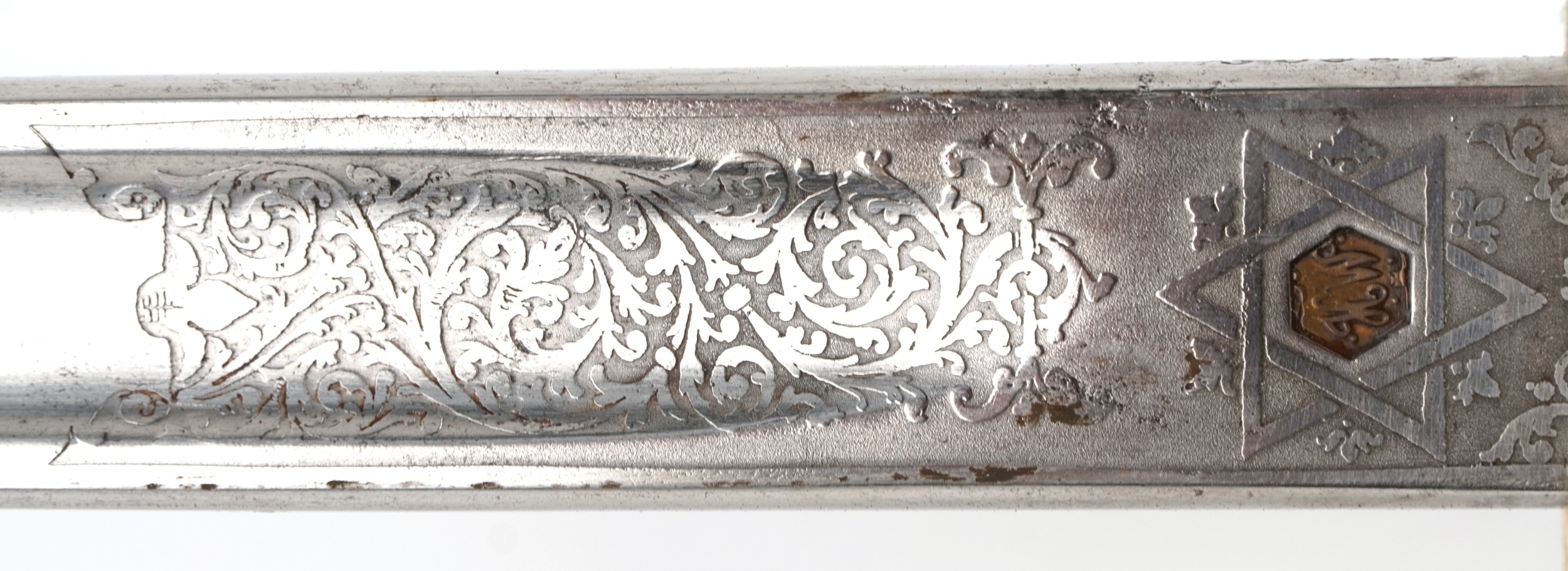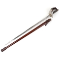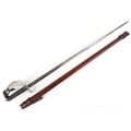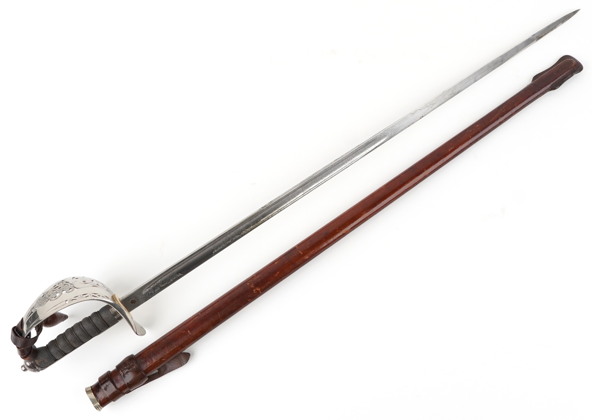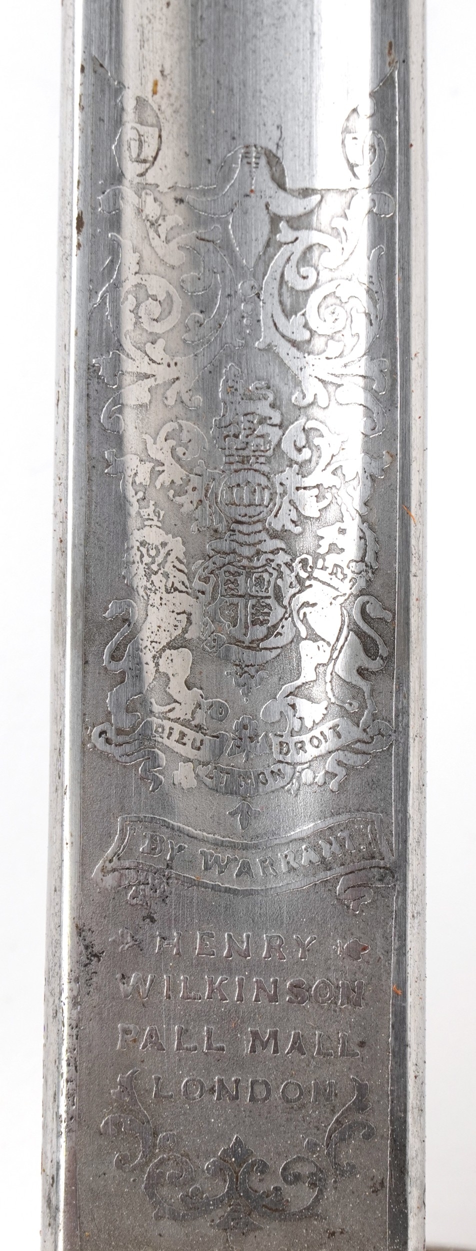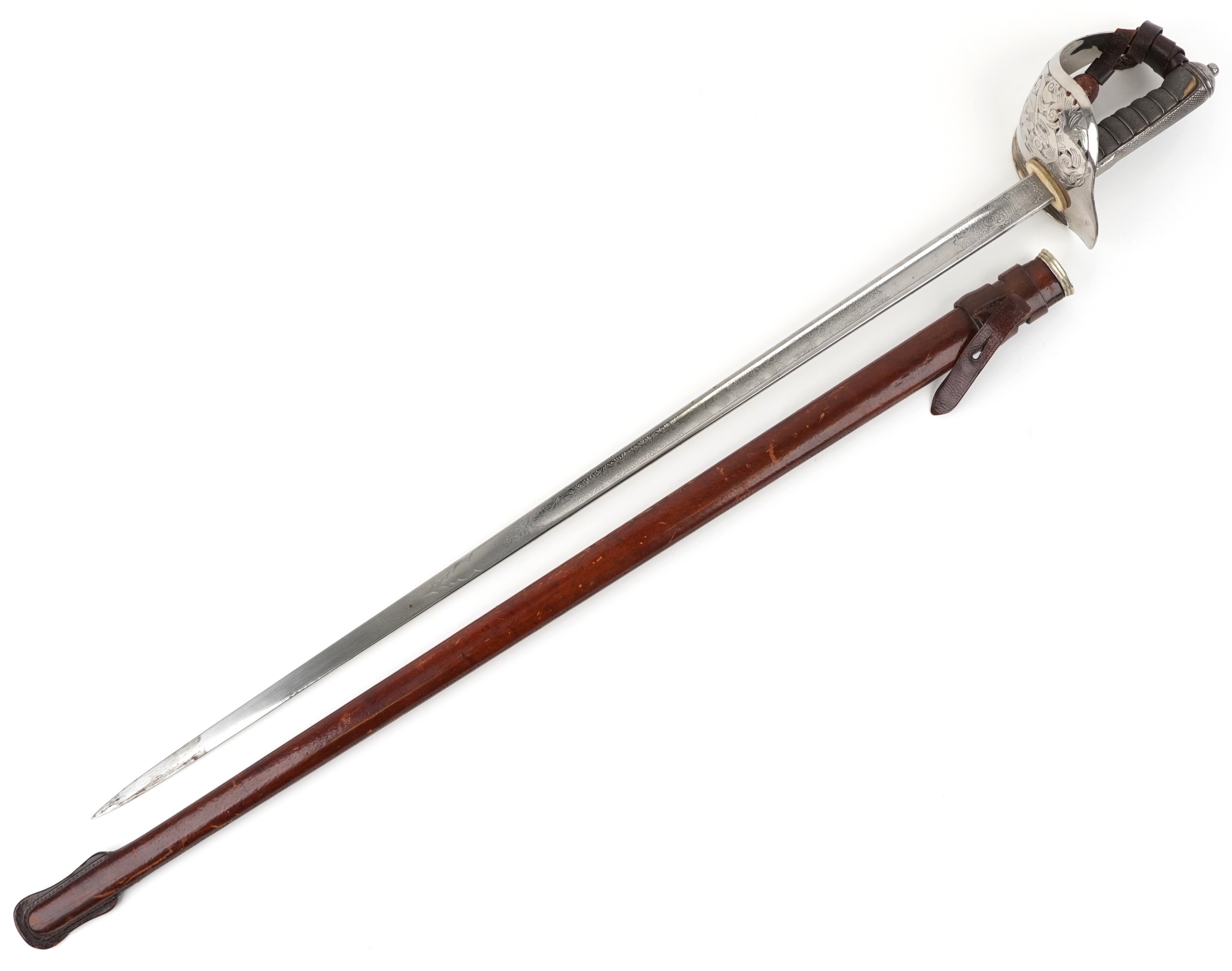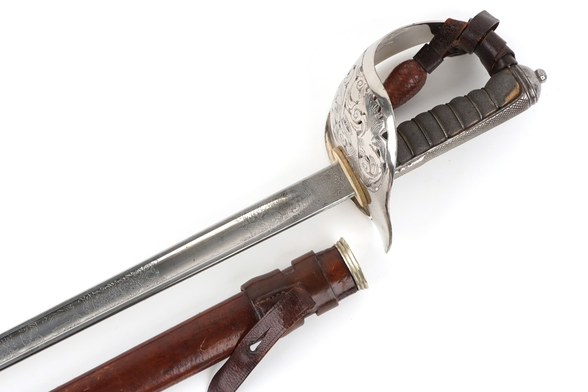 A British military Henry Wilkinson sword having engraved steel blade and wire bound shagreen grip, with leather scabbard, 102cm in length.