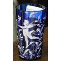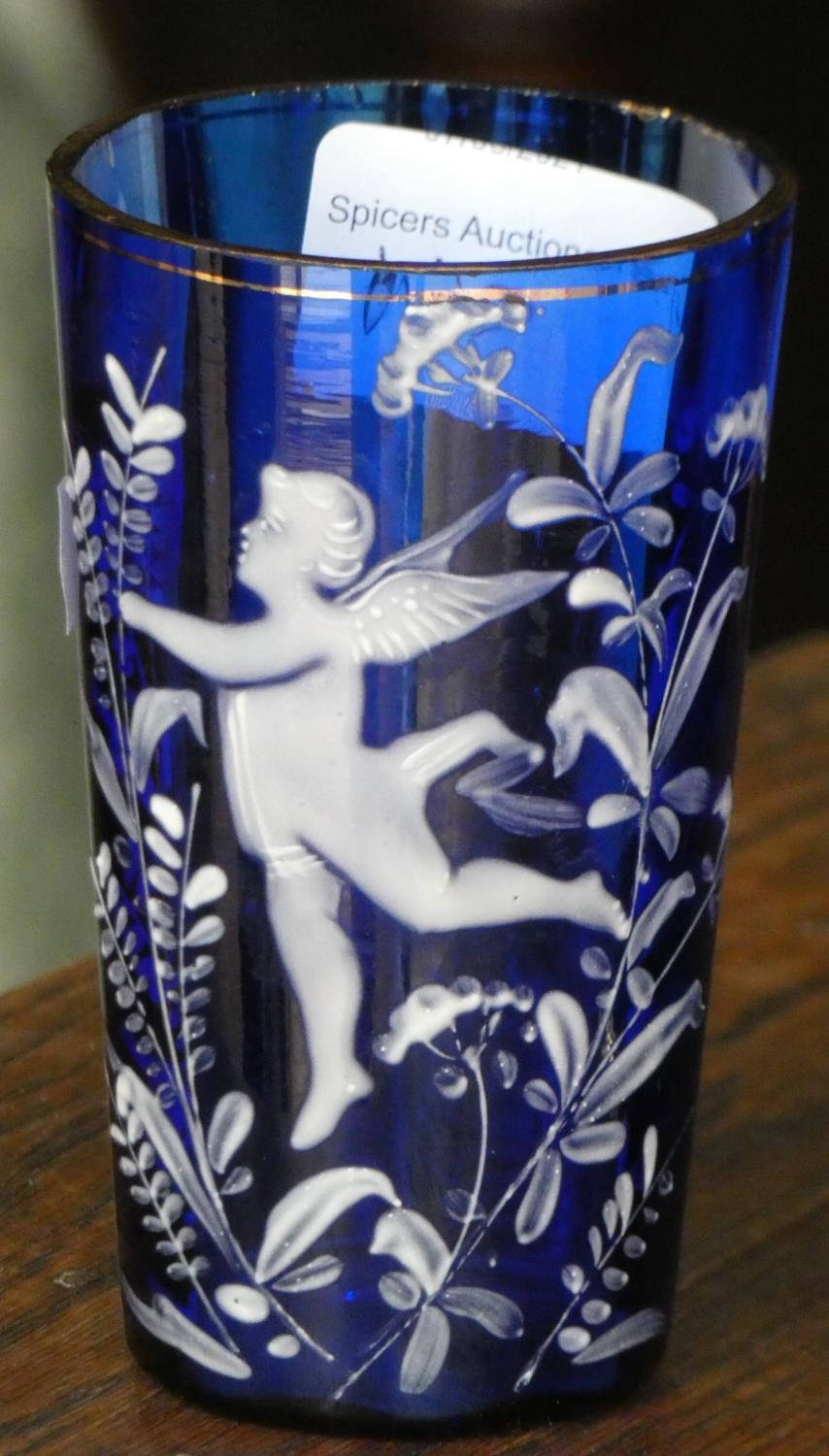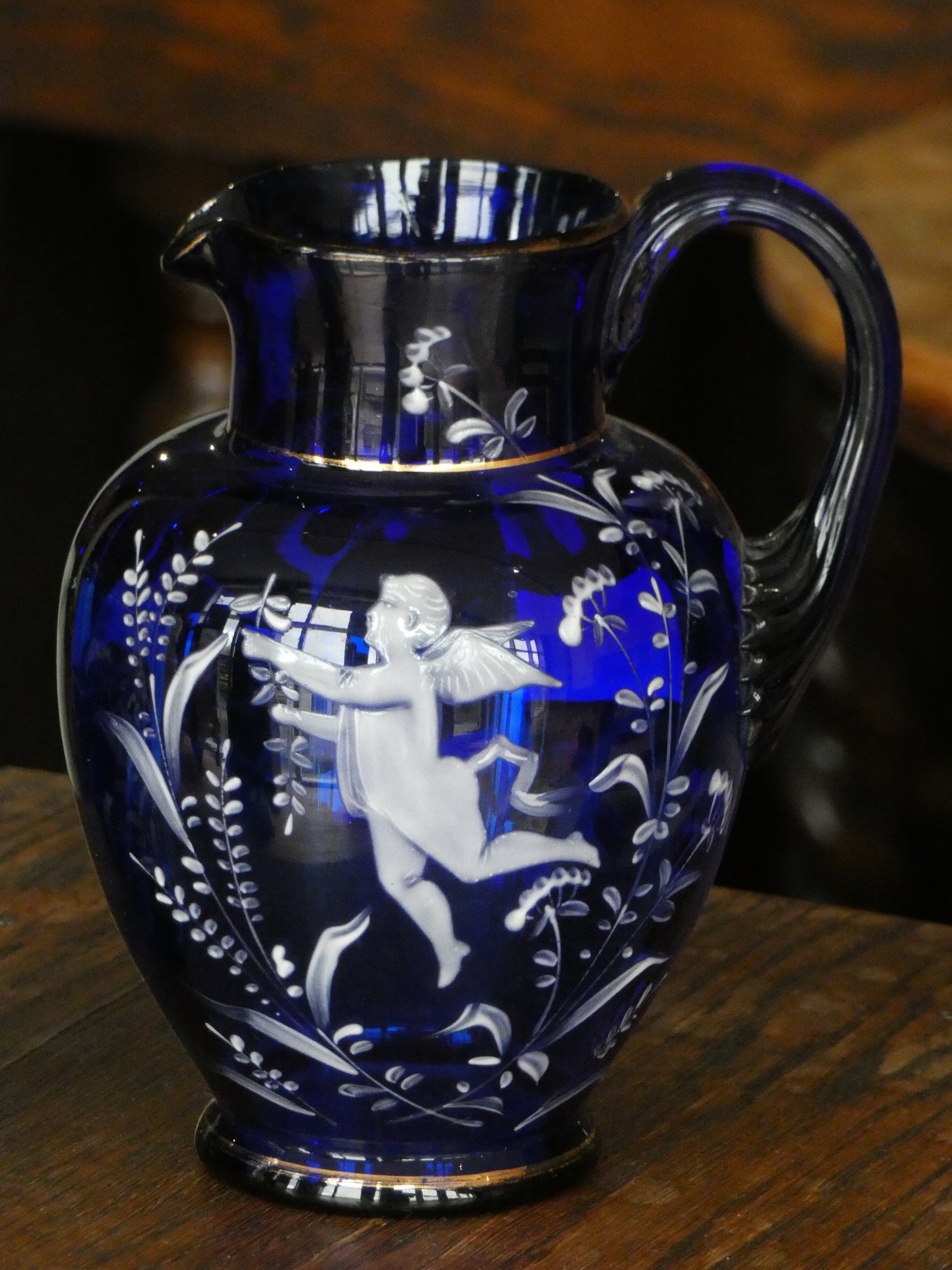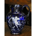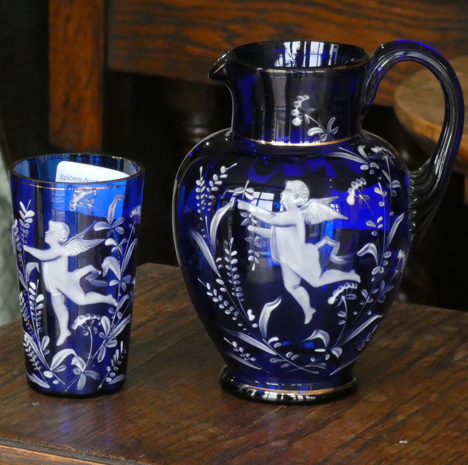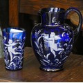 A cobalt blue glass jug with white cherub decoration together with a matching drinking glass
