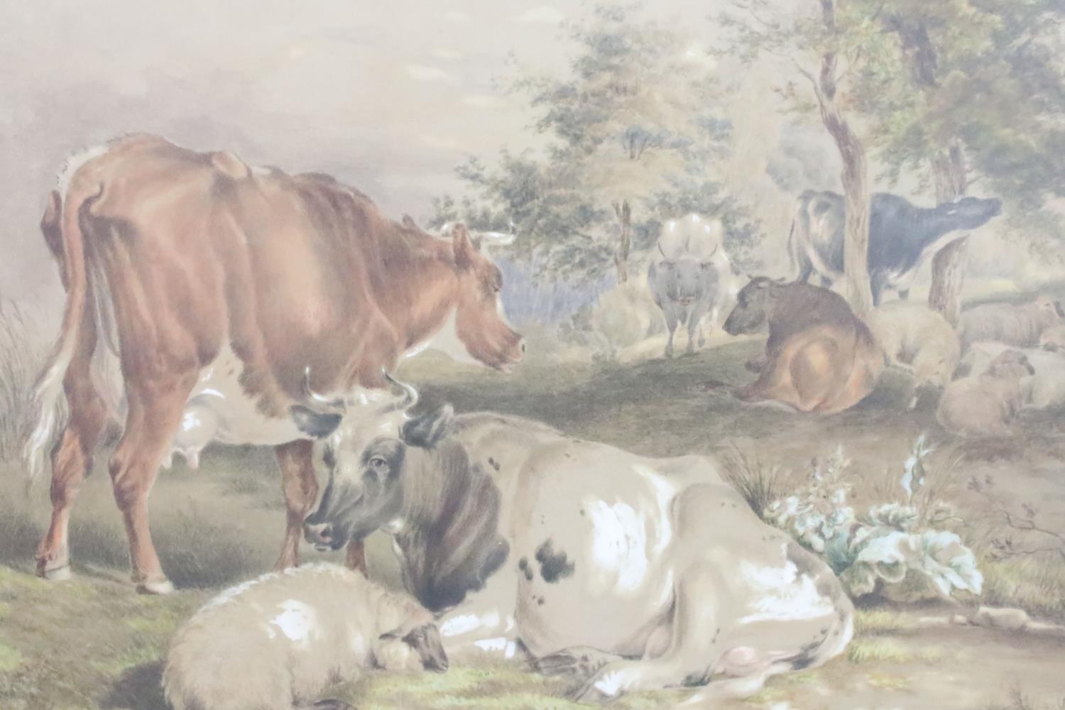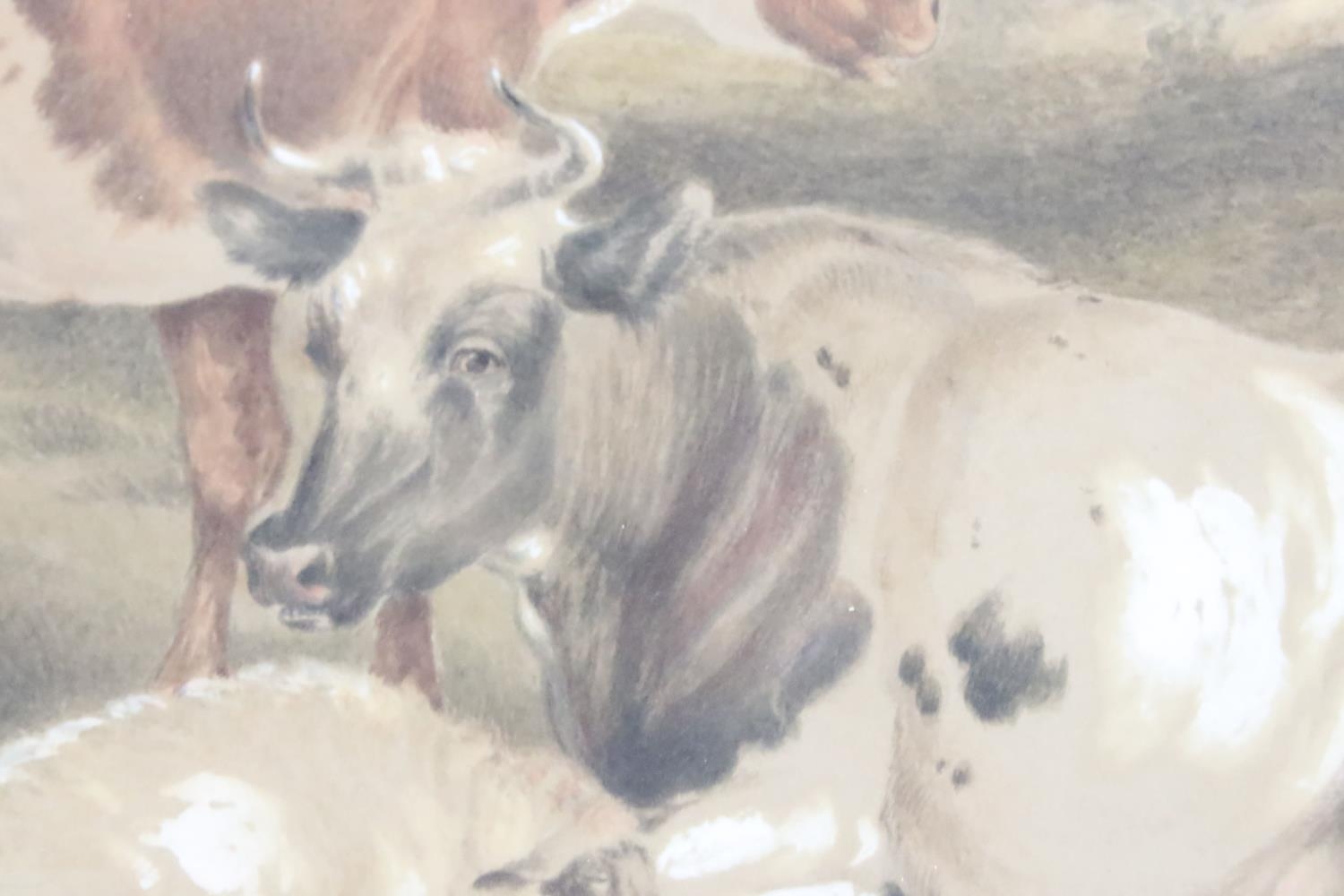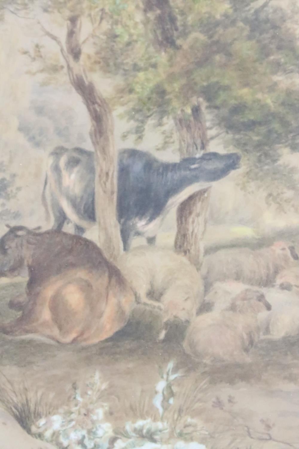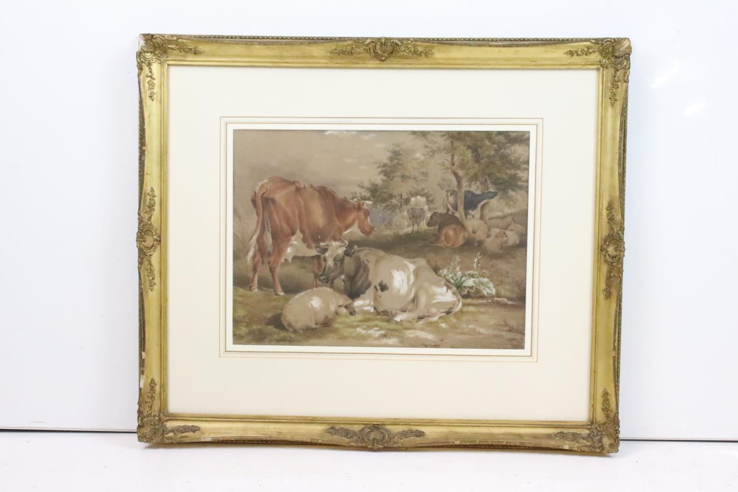 Sidney Cooper (1803 - 1902), cattle and sheep in a field, watercolour, signed lower left, 33 x 44.5cm, gilt frame