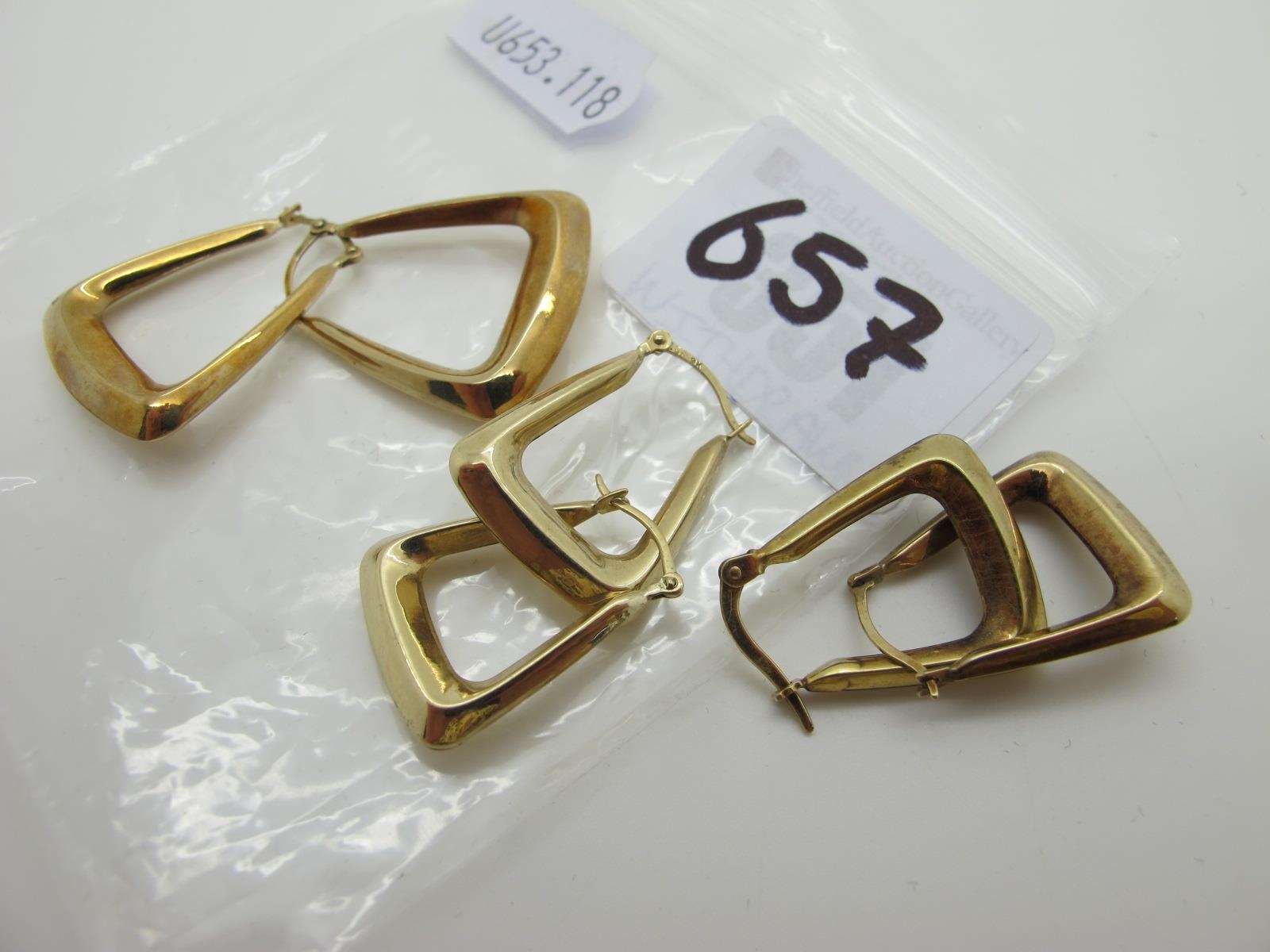 Three Pairs of Modern Earrings, stamped "9k". (3)