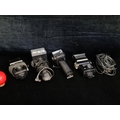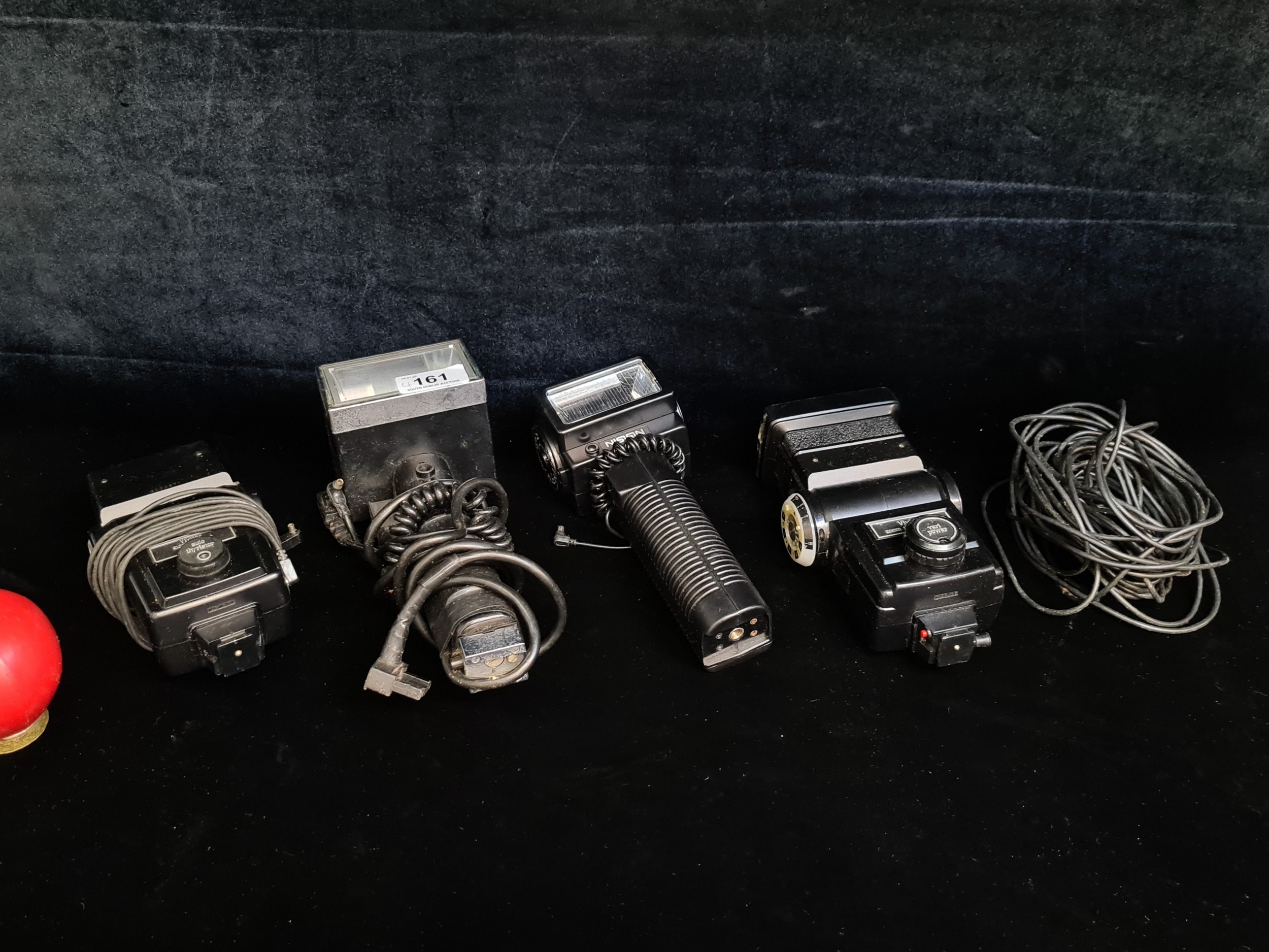 Four vintage camera flashes. Includes a 'Vivitar zoom thyri...