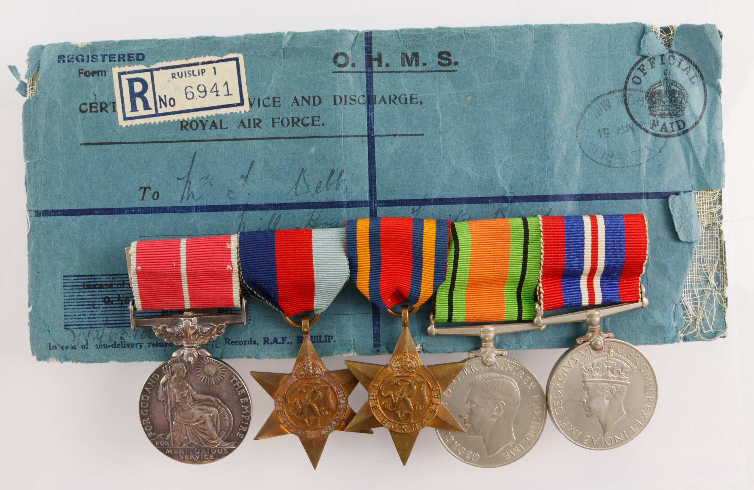 Group – A rare WW2 Burma Campaign British Empire Medal Group awarded to Sergeant F. Webb, Royal Air Force. B.E.M., GVIR Military Issue (639065 Sgt. Frank Webb, R.A.F.), 1939-45 & Burma Stars, Defence & War Medals (all unnamed as issued). Lot includes his original Buckingham Palace award slip, congratulatory award telegram (230 Group RAF) and an OHMS envelope addressed to the recipient in Jersey. Citation reads '639065 Sgt Frank Webb No.1. C.M.U. Kanchrapara. This Airman has displayed outstanding keeness, ability and devotion to duty, and his services have proved invaluable in the building up and maintenance of Merlin and Mercury Engin production to meet the demands of operational squadrons in the field. Since the formation of teh unit after the fall of Burma, he has worked long and arduous hours under the most difficult conditions and has not a fine example which has inspired the personnel of the unit to meet all commitments. He has greatly assisted in maintaining the serviceability of aircraft during a critical period'. Mounted as worn.