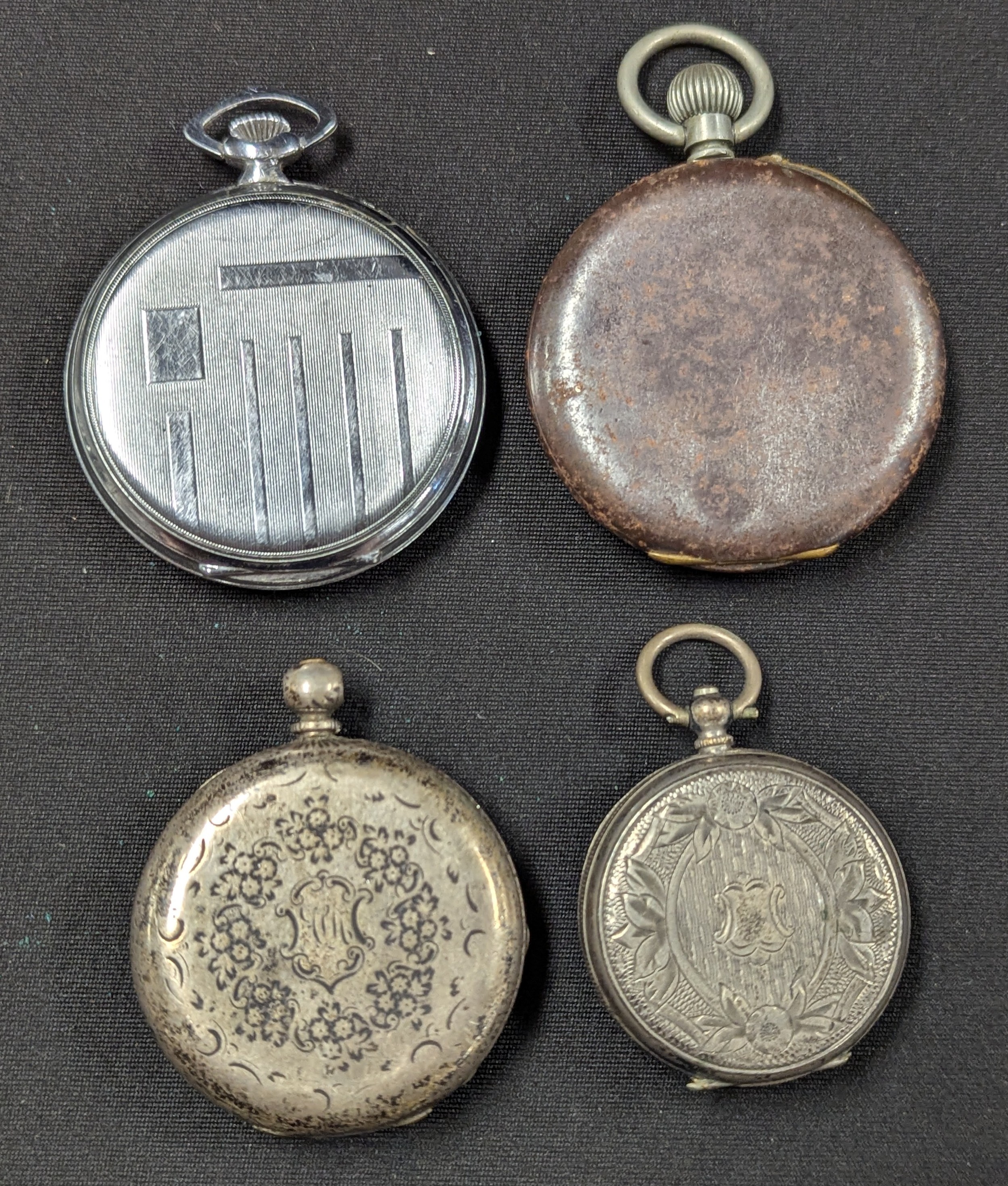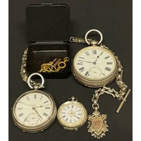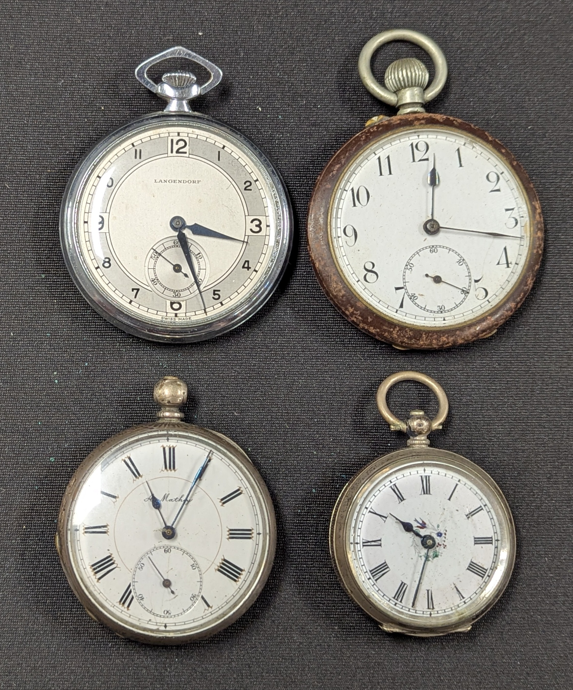 Watches - An A Mathey (A&M) fine silver cased pocket watch, enamel dial, Roman numerals, subsidiary seconds, key wind movement, 45mm diameter; others 800 grade silver lady's fob watch, 38mm diameter; Langendorf nickel chrome cased Art Deco pocket watch, 46mm diameter etc (4)
