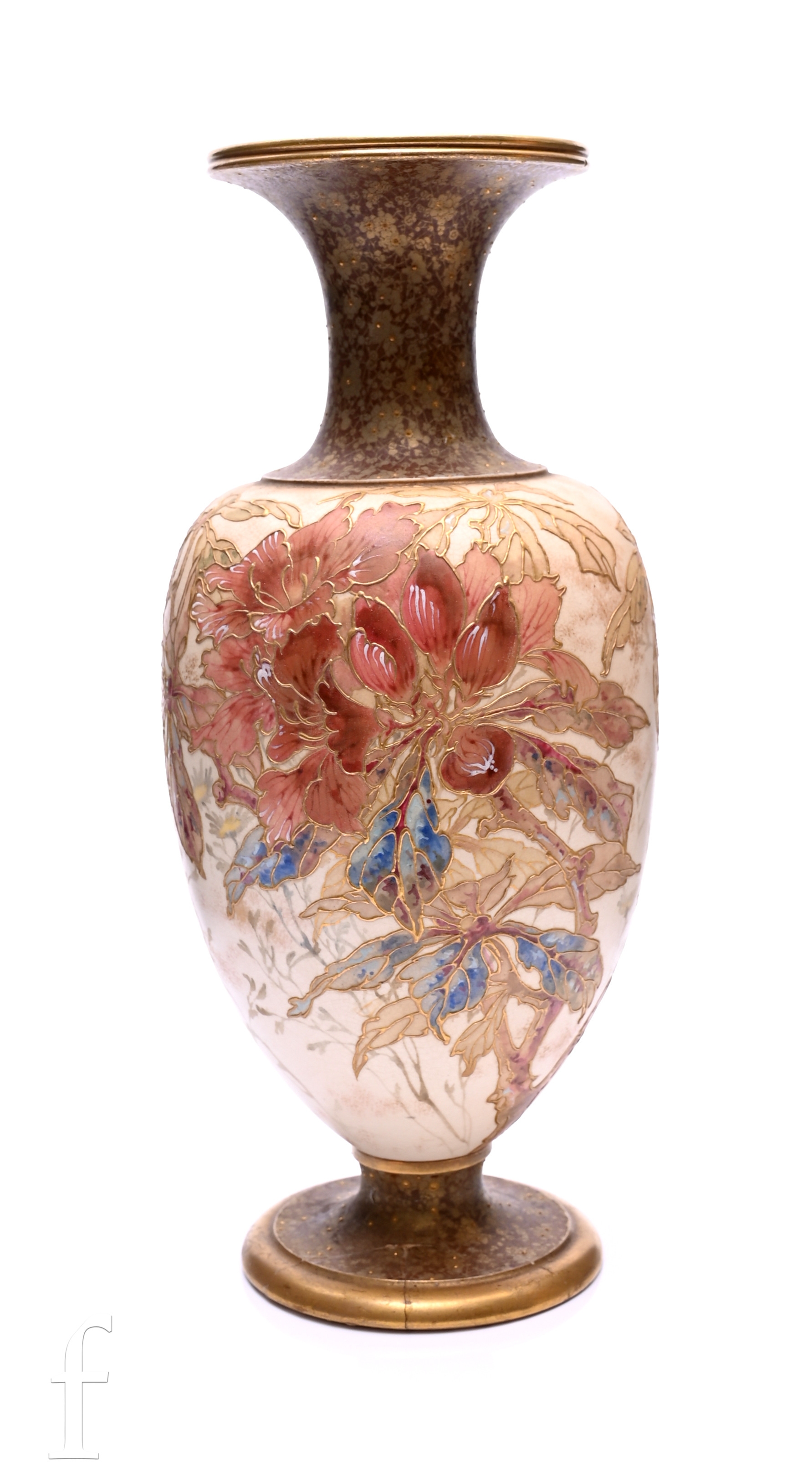 A late 19th Century Doulton Burslem vase of footed ovoid form with a flared collar neck, enamel and gilt decorated with a flowering magnolia bough over a blush ivory ground between gilded floral borders, impressed, printed and painted marks, height 28cm, damaged.