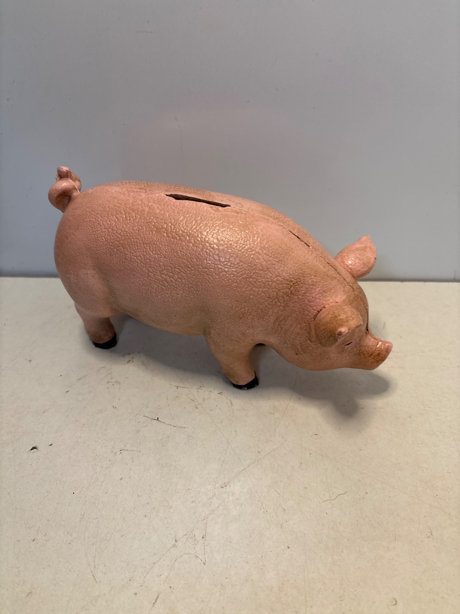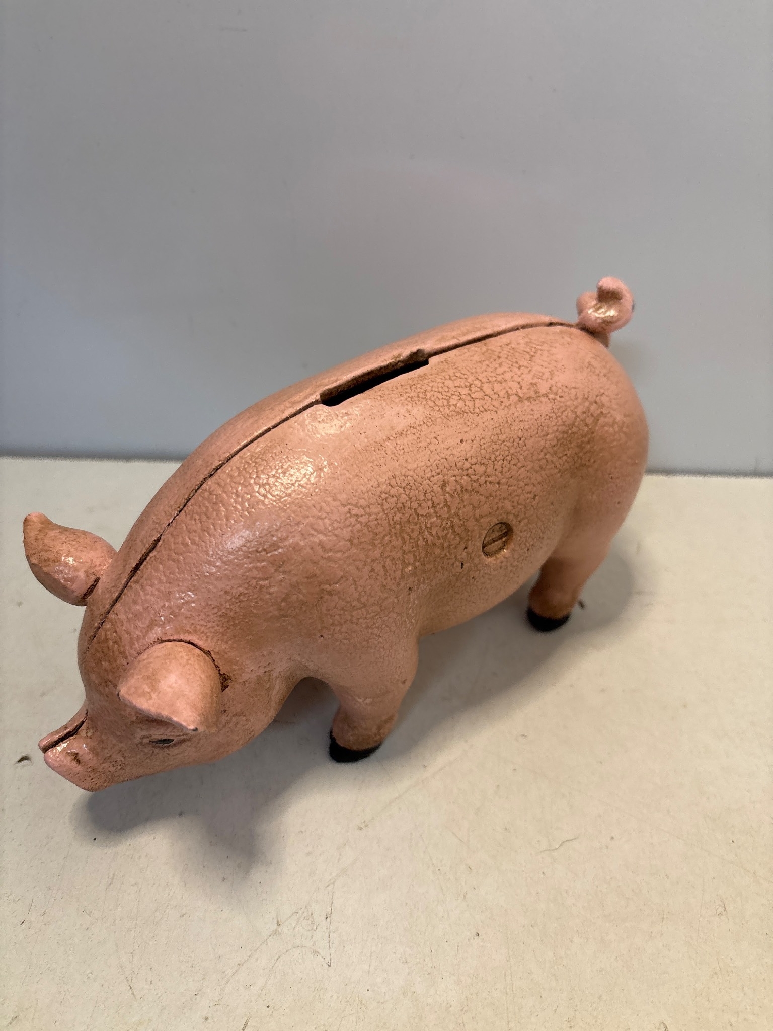 Cast iron pig-shaped coin bank with pink paint and coin slot.