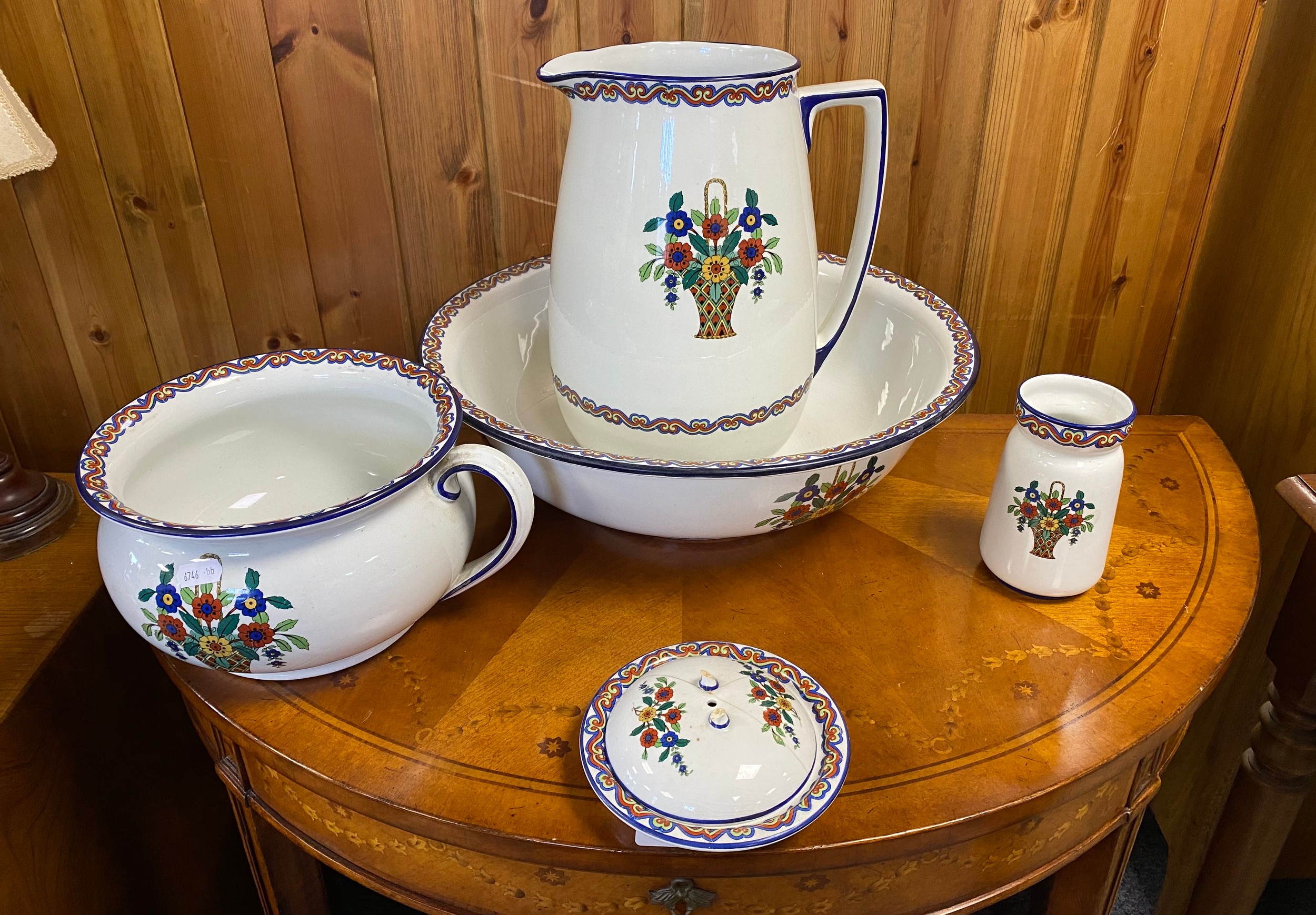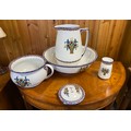 A vintage part toilet set, comprising ewer and basin, chamber pot, toothbrush holder and dish -