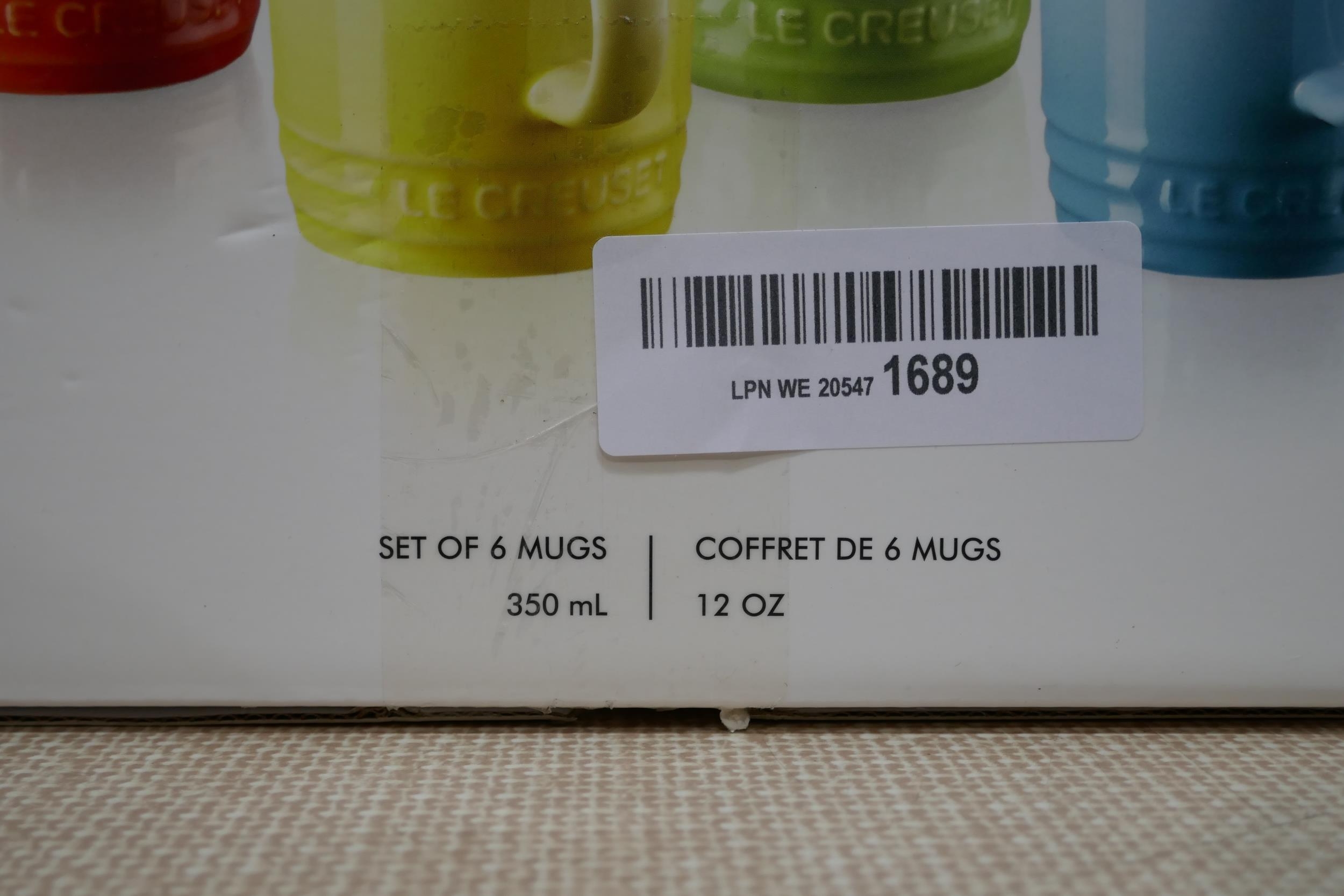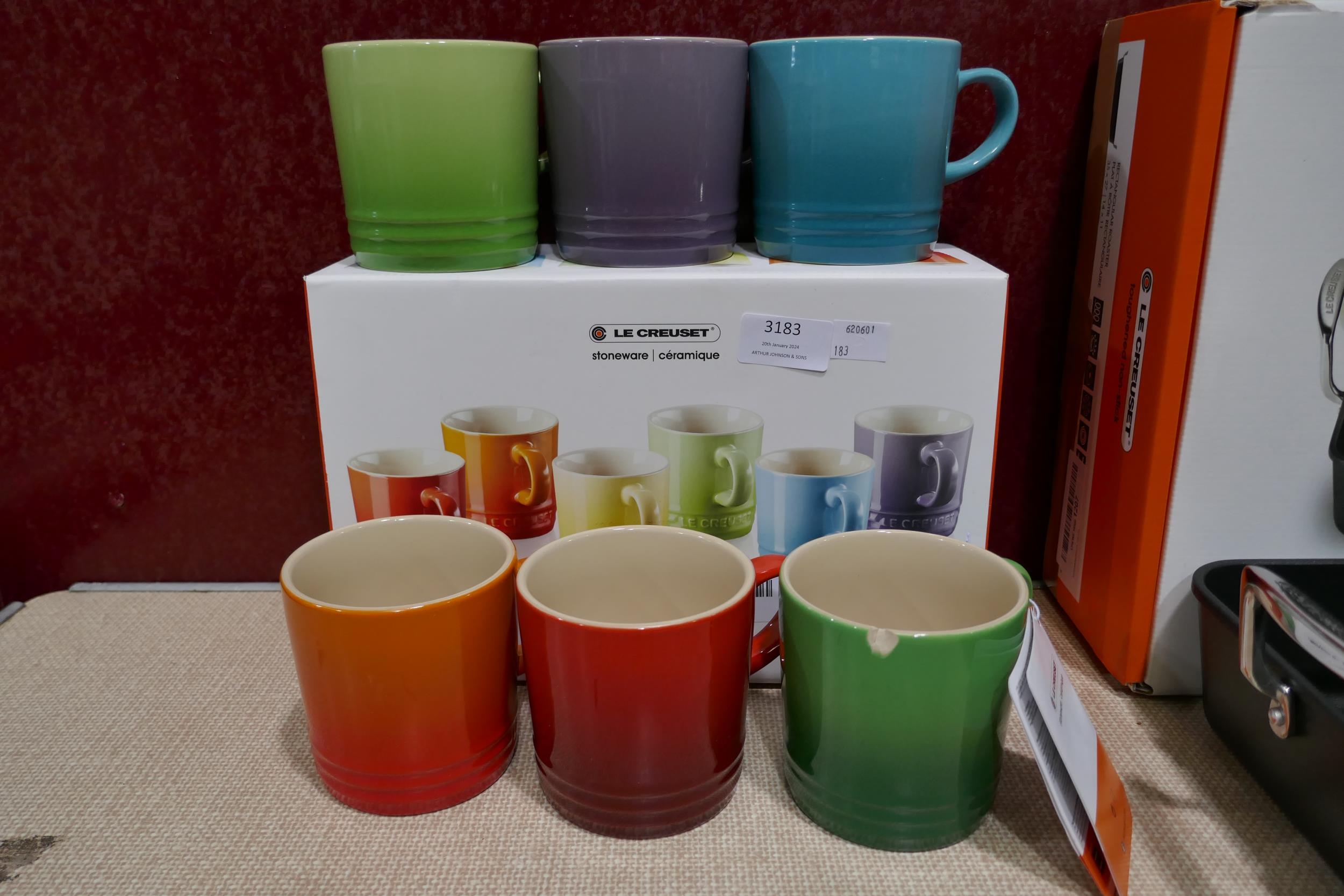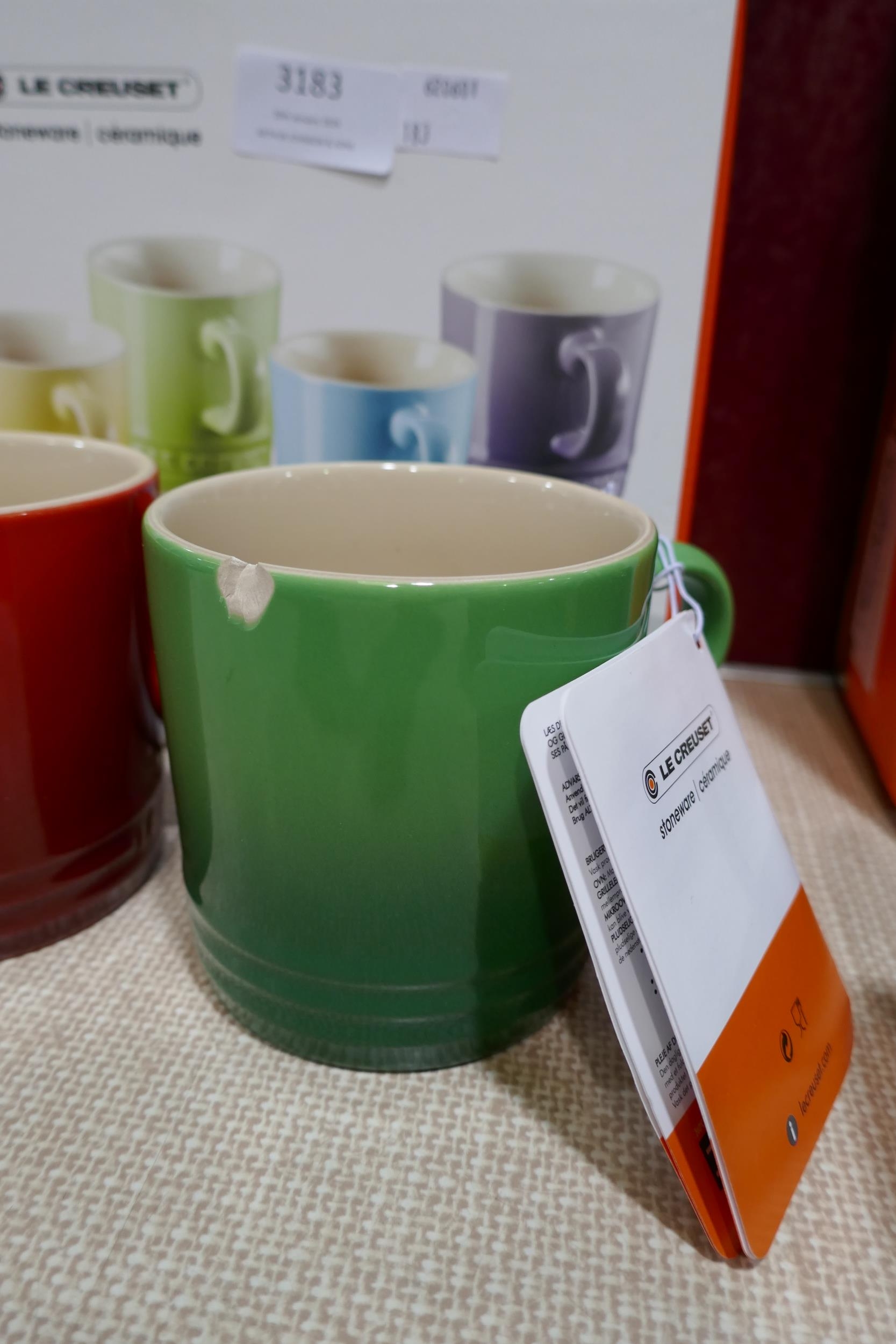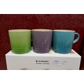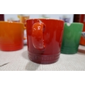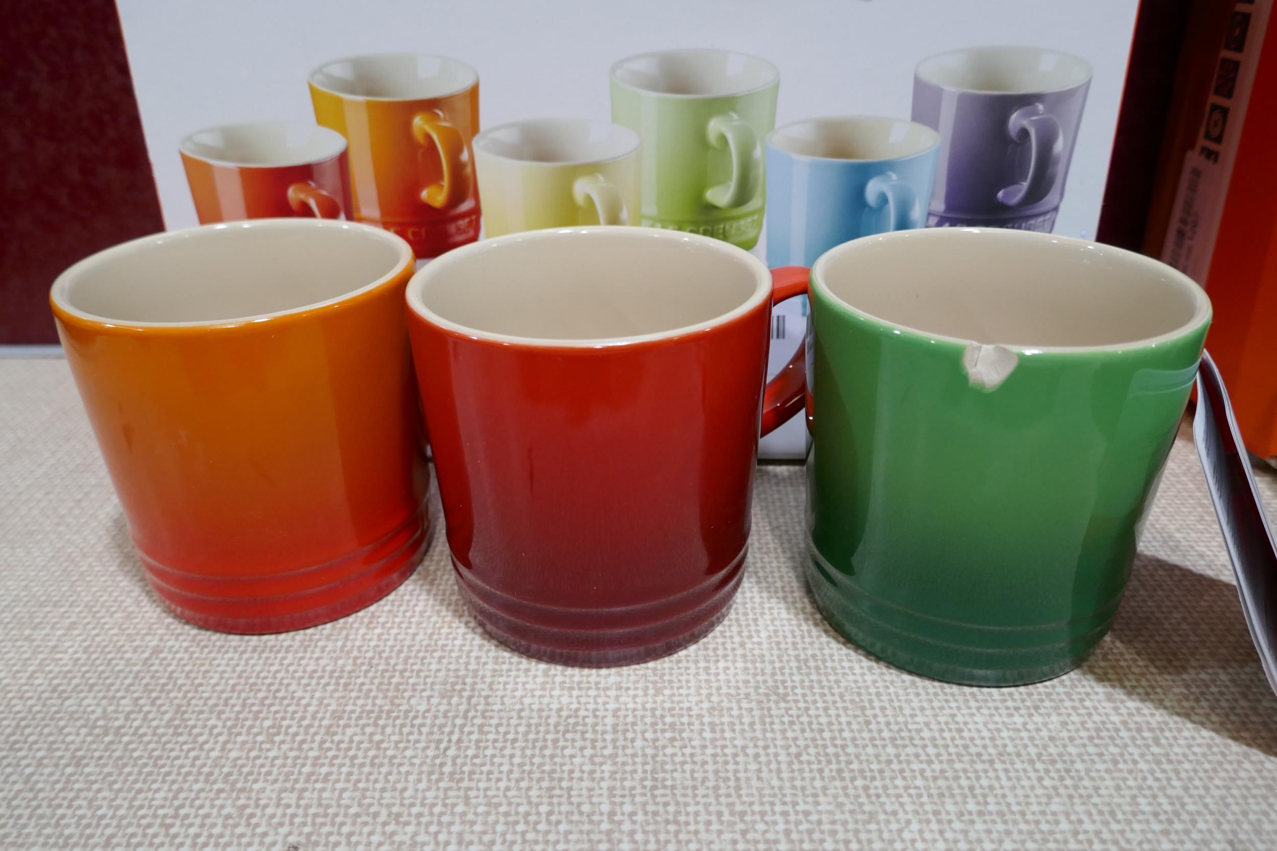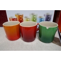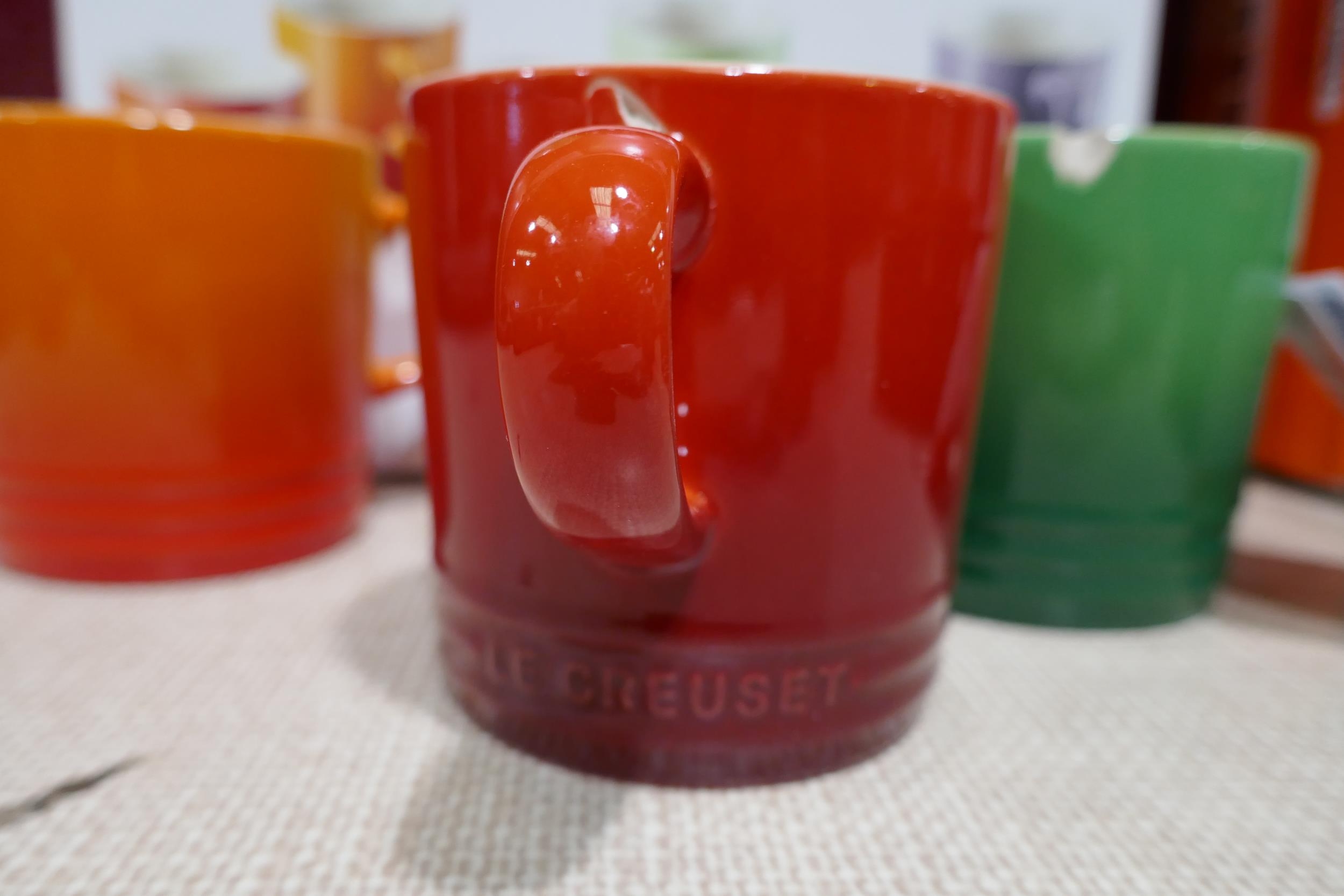 Set of six Le Creuset ceramic 350ml coffee mugs - mixed colours - one chipped