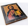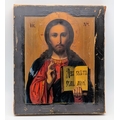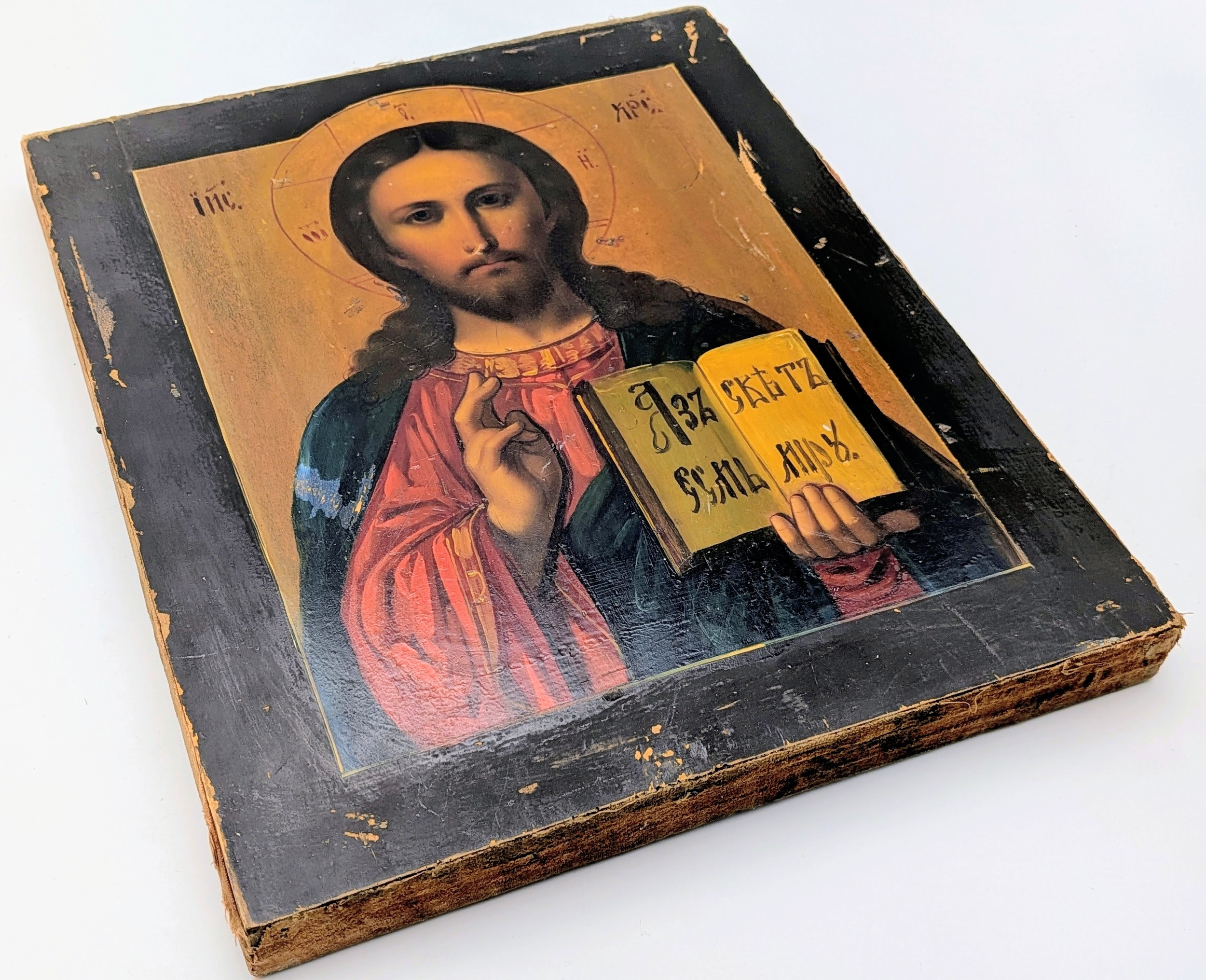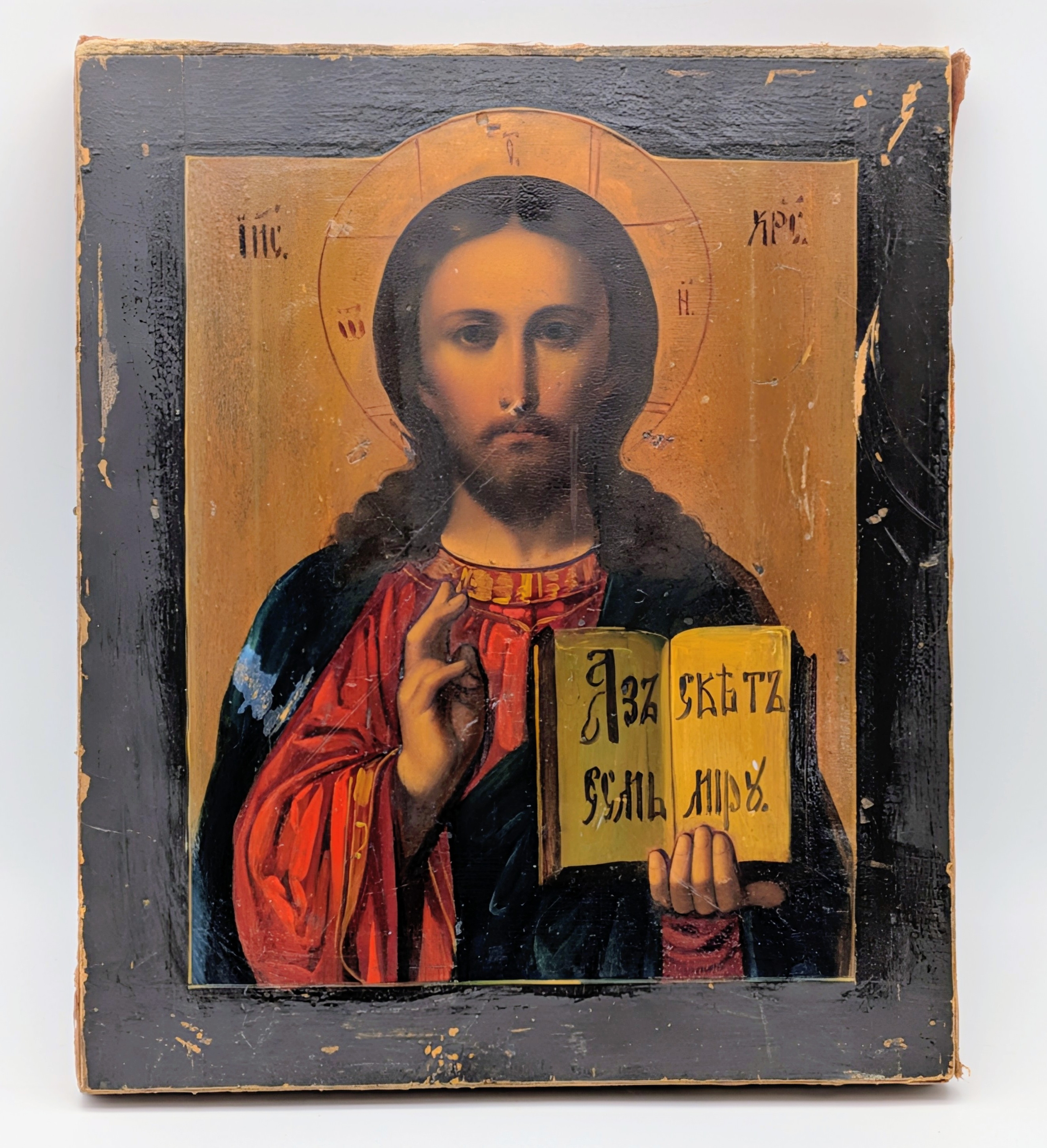 An Antique Russian Orthodox Icon of Christ Pantocrator - A traditional depiction of Jesus as the ruler of the Universe. Hand-painted on wood. 26 x 31 x 3cm.