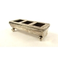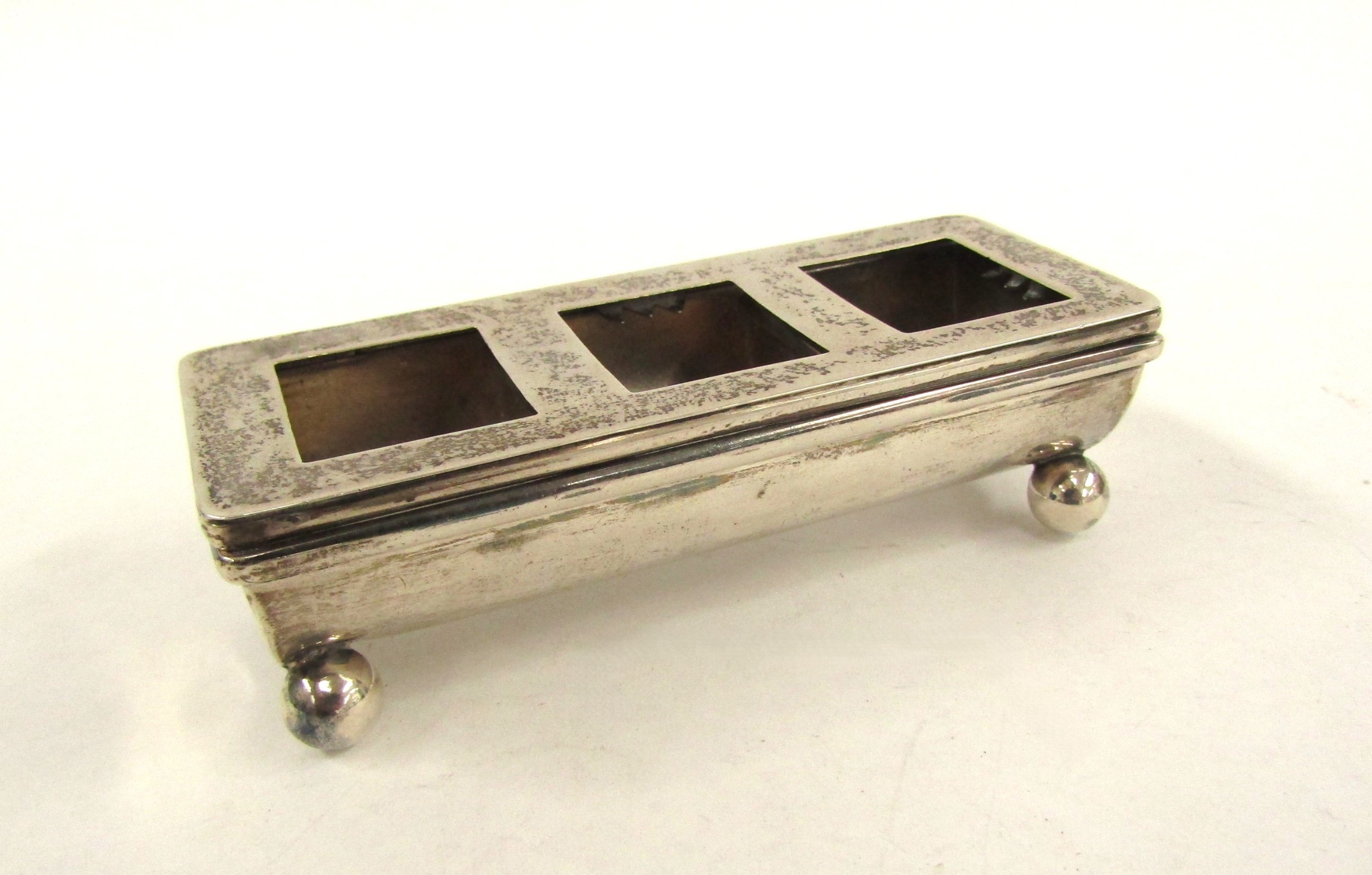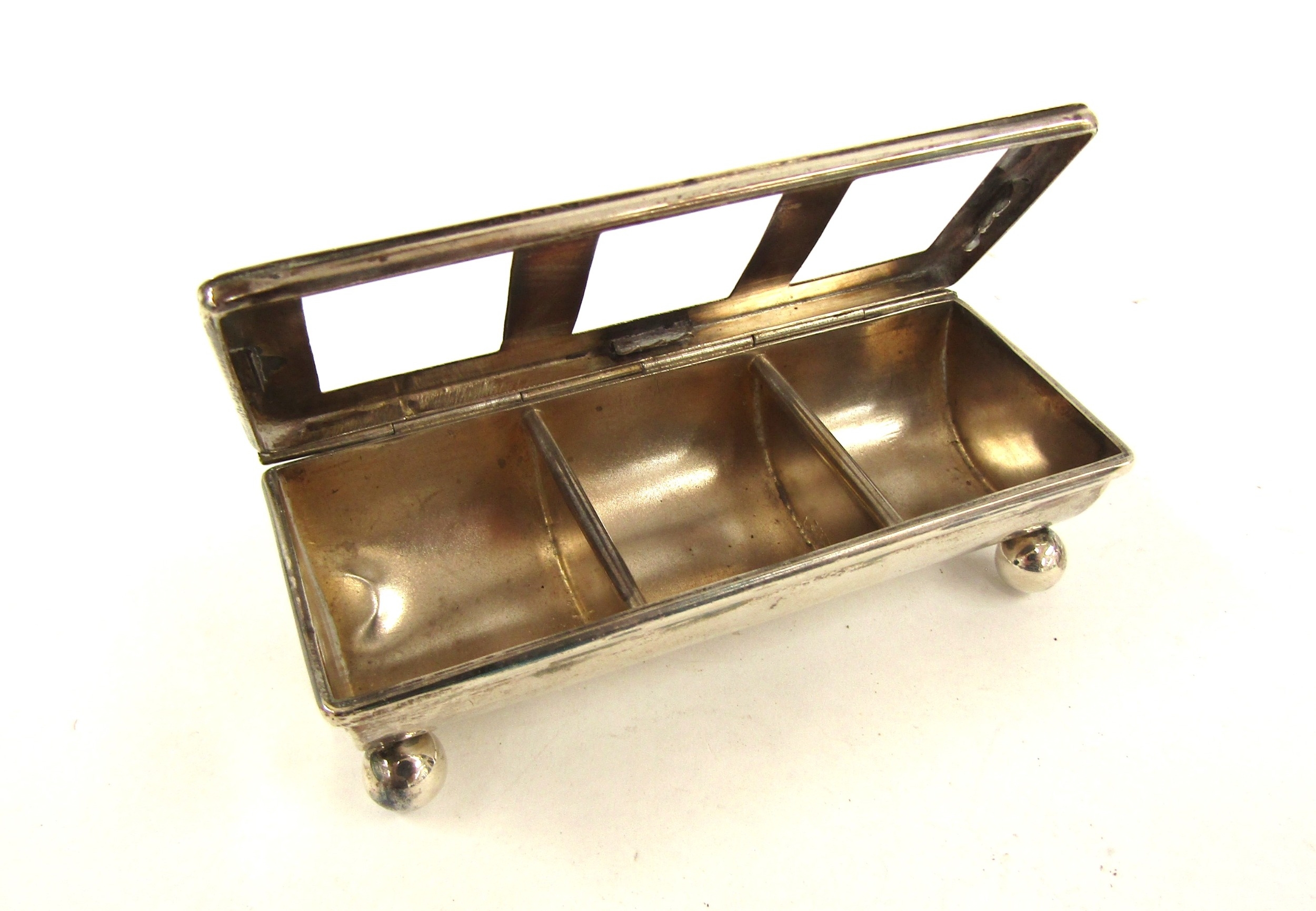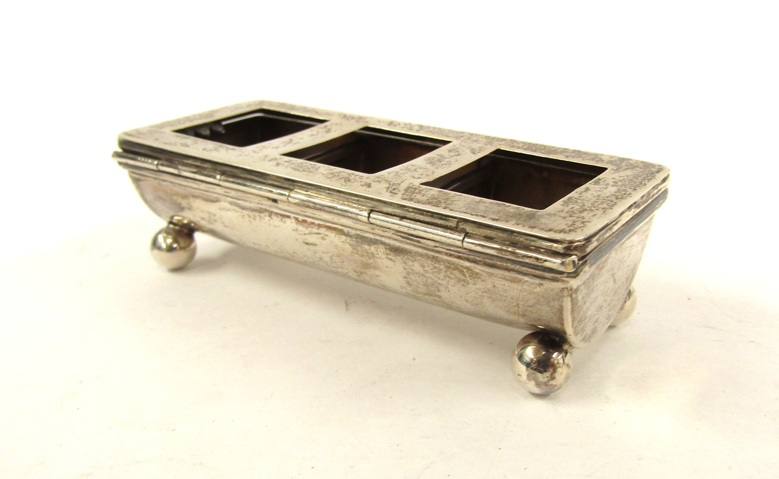 A James Deakin & Sons silver three compartment stamp box, claws missing to lid, Birmingham 1900, 2.5cm 8.7cm x 3.7cm, 46g