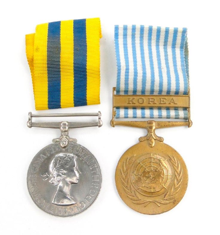 British military Elizabeth II Korea medal and a United Nations Korea medal, the former marked C/SSX.848354.S.W.HOSKINS.A.B.R.N. to the rims