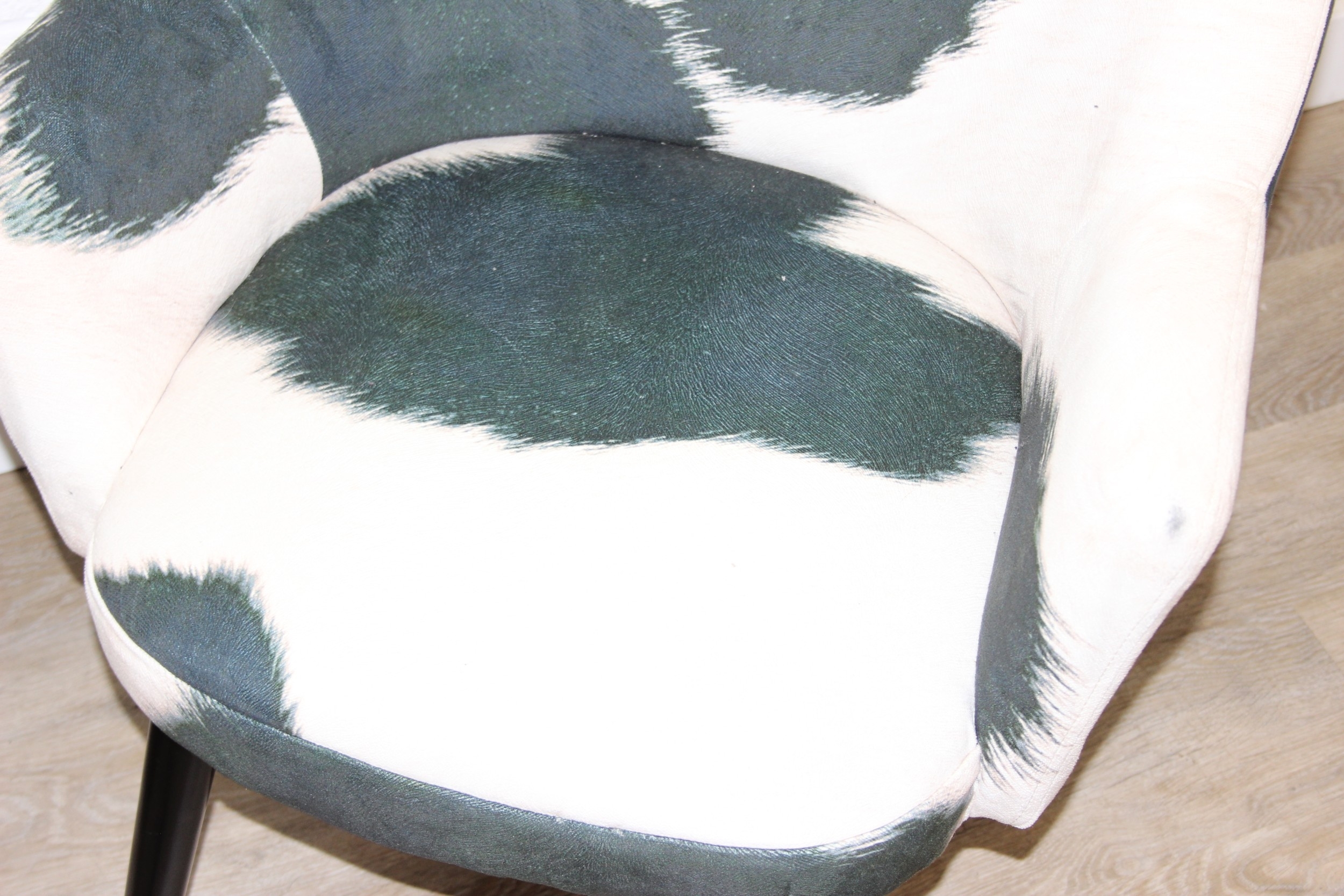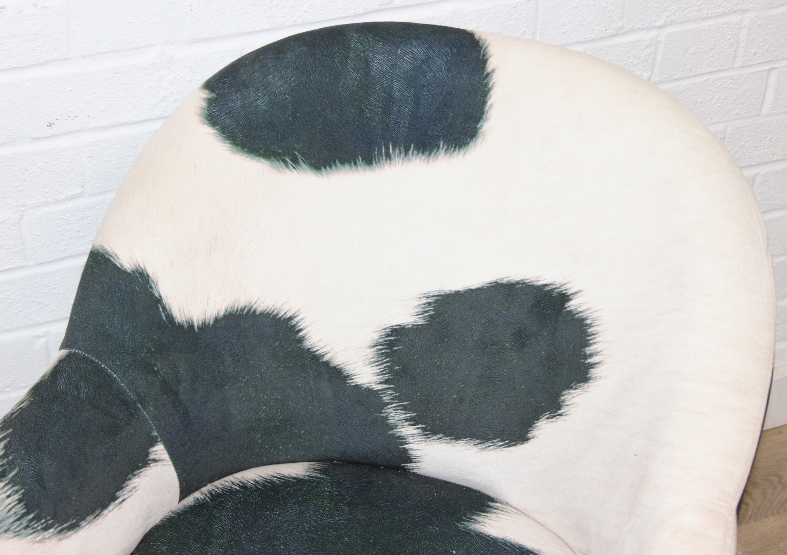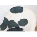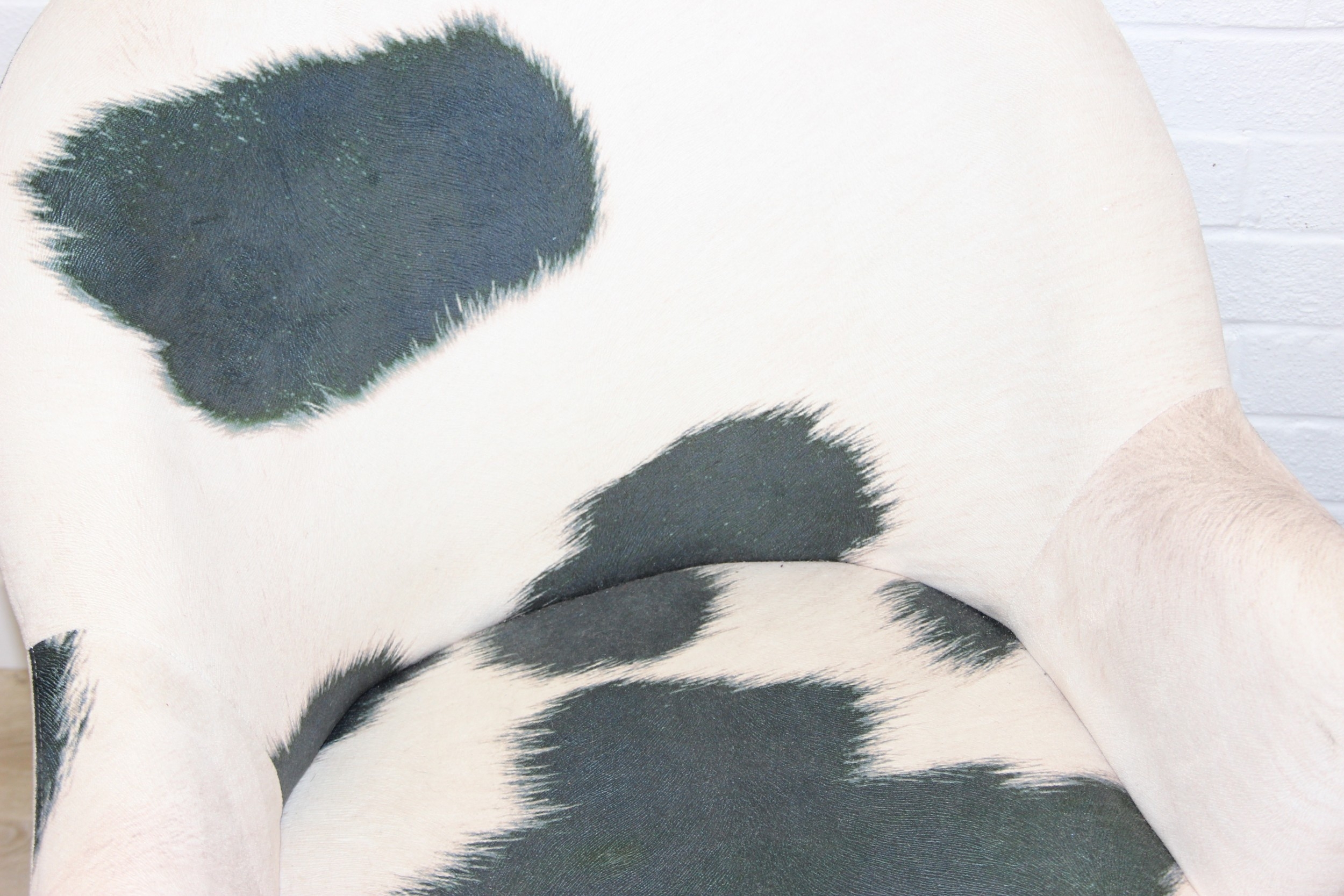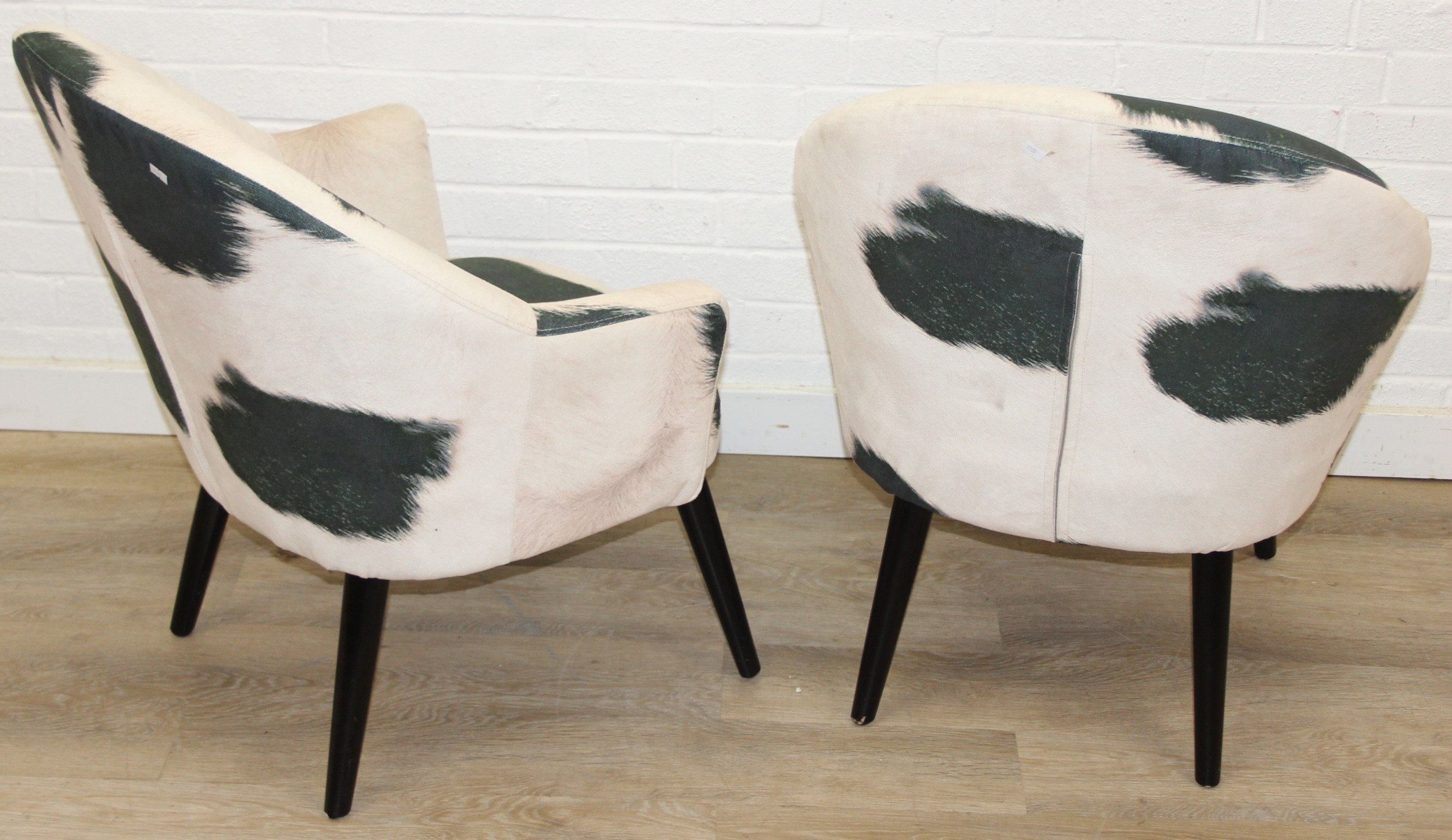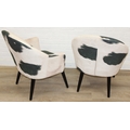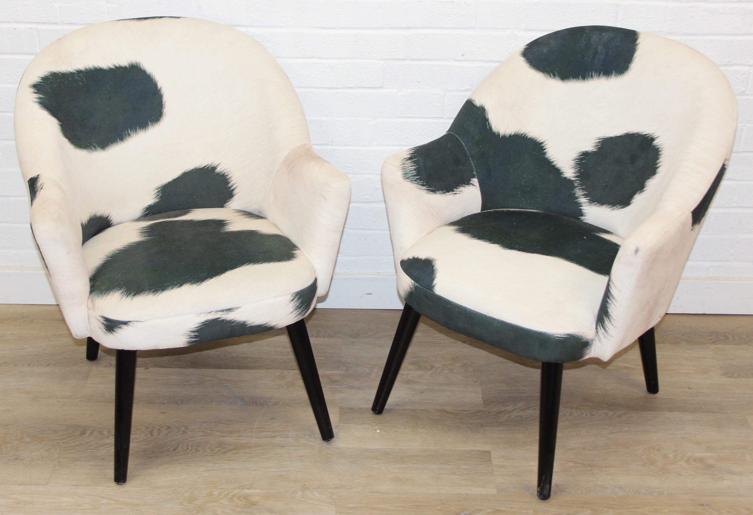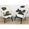 A pair of retro style Ringo armchairs with black painted wooden legs, Friesian cow hide style upholstery, label under for Premier, each 66cm wide x 79cm tall [2]