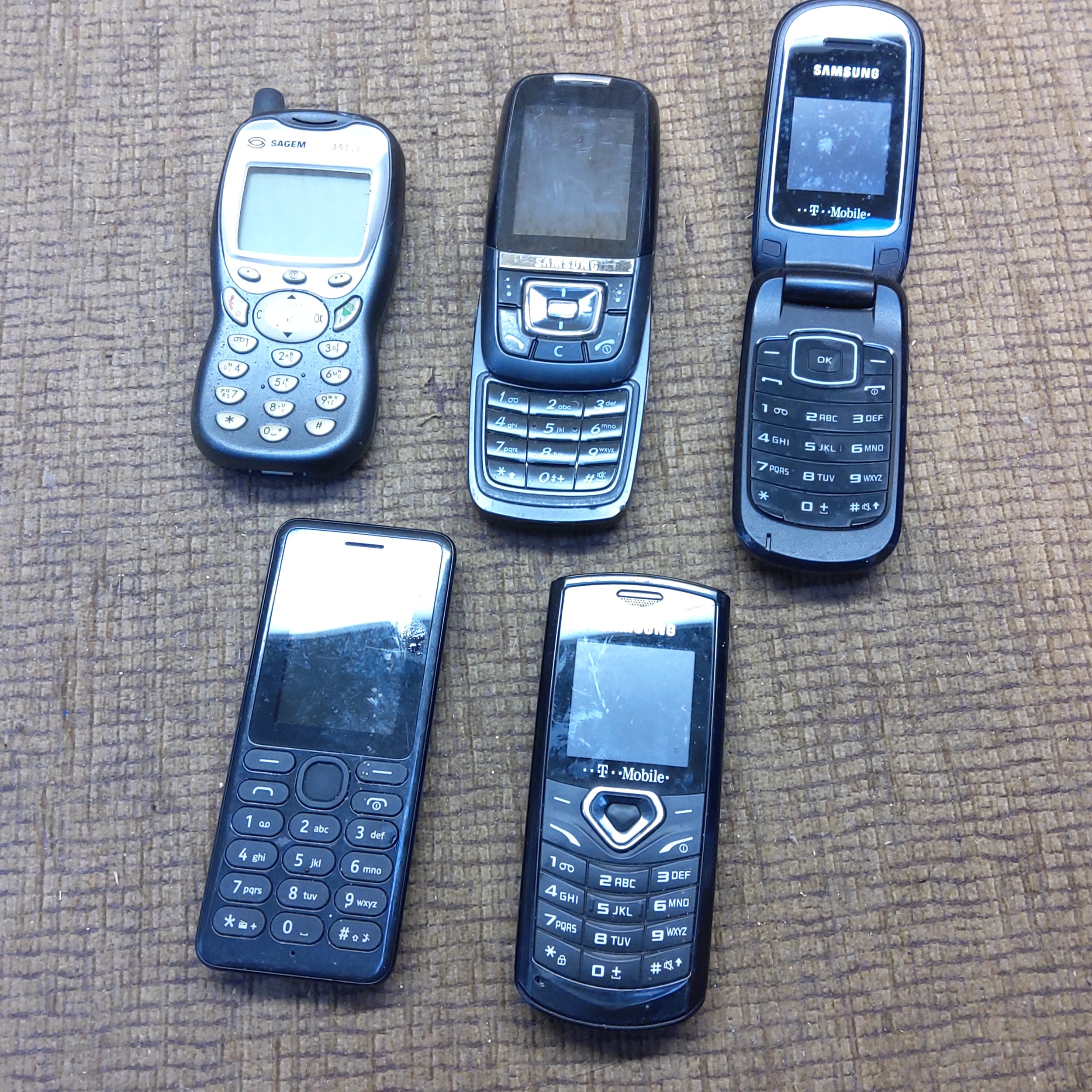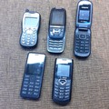Five vintage mobile phones including Nokia and Samsung D600E.