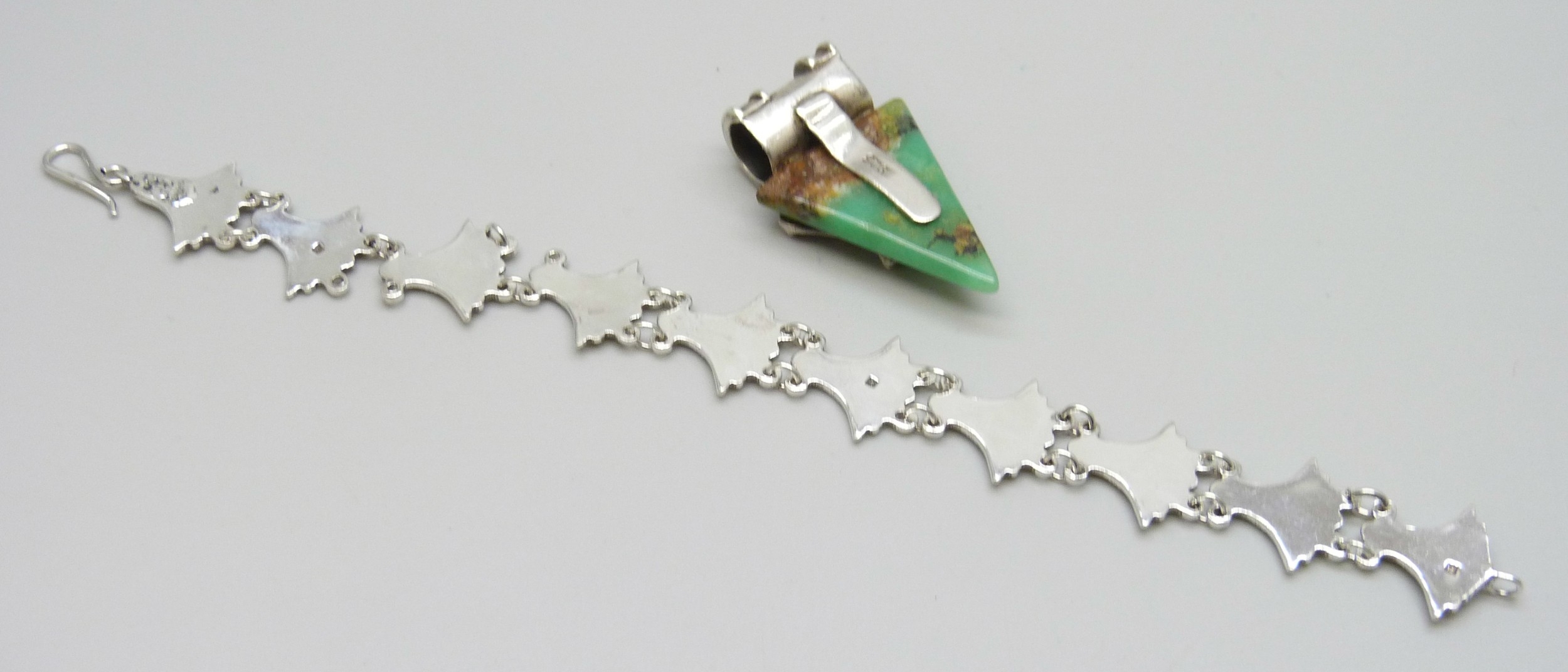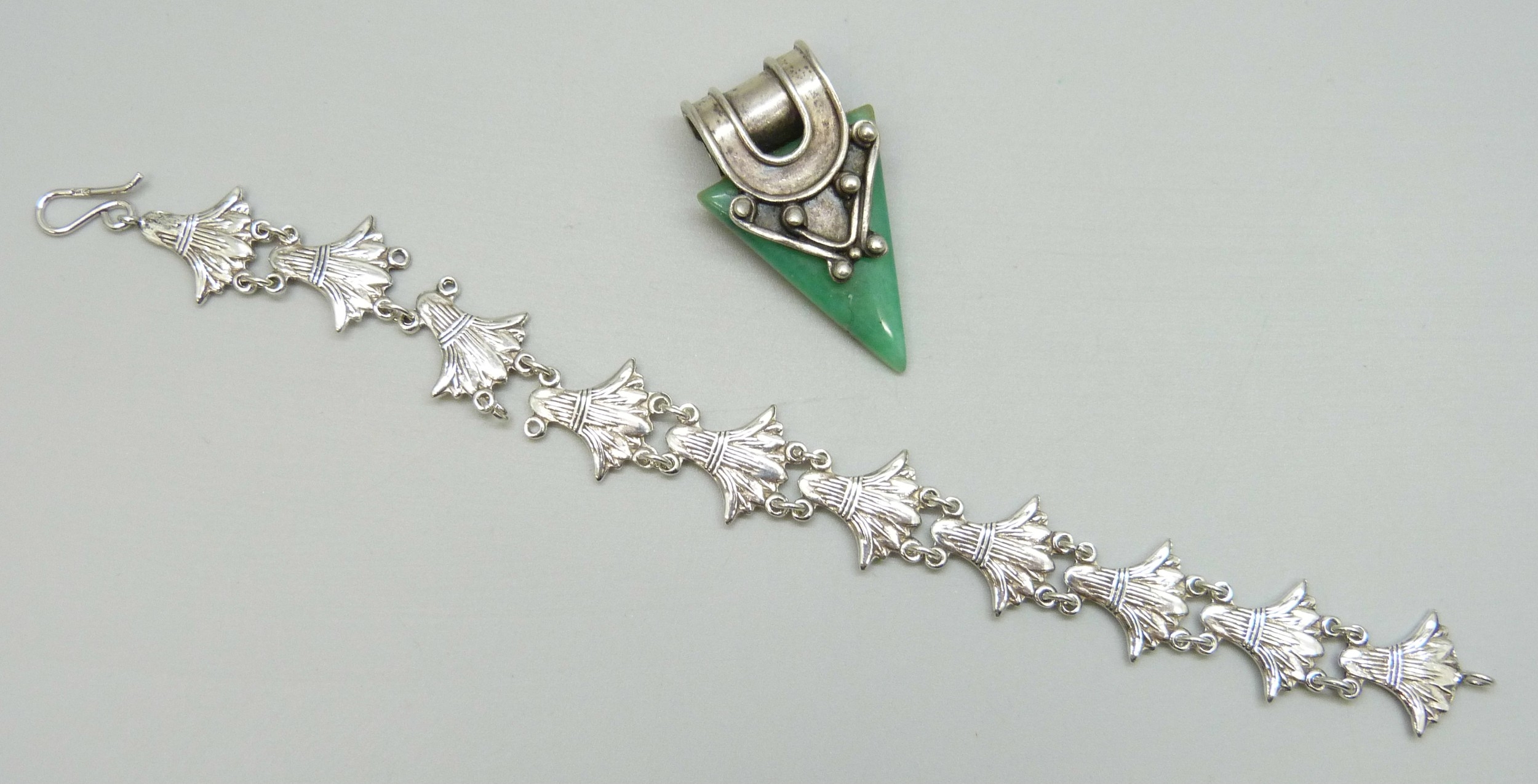 A possibly Egyptian white metal bracelet with control marks, a/f, and a silver mounted pendant, 24g total
