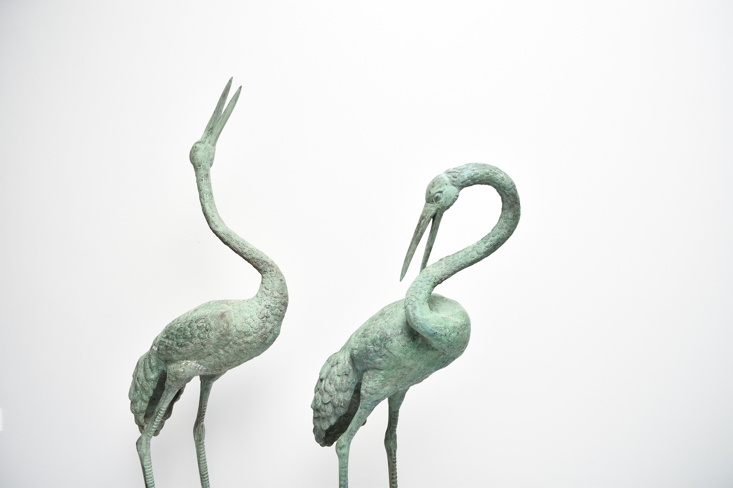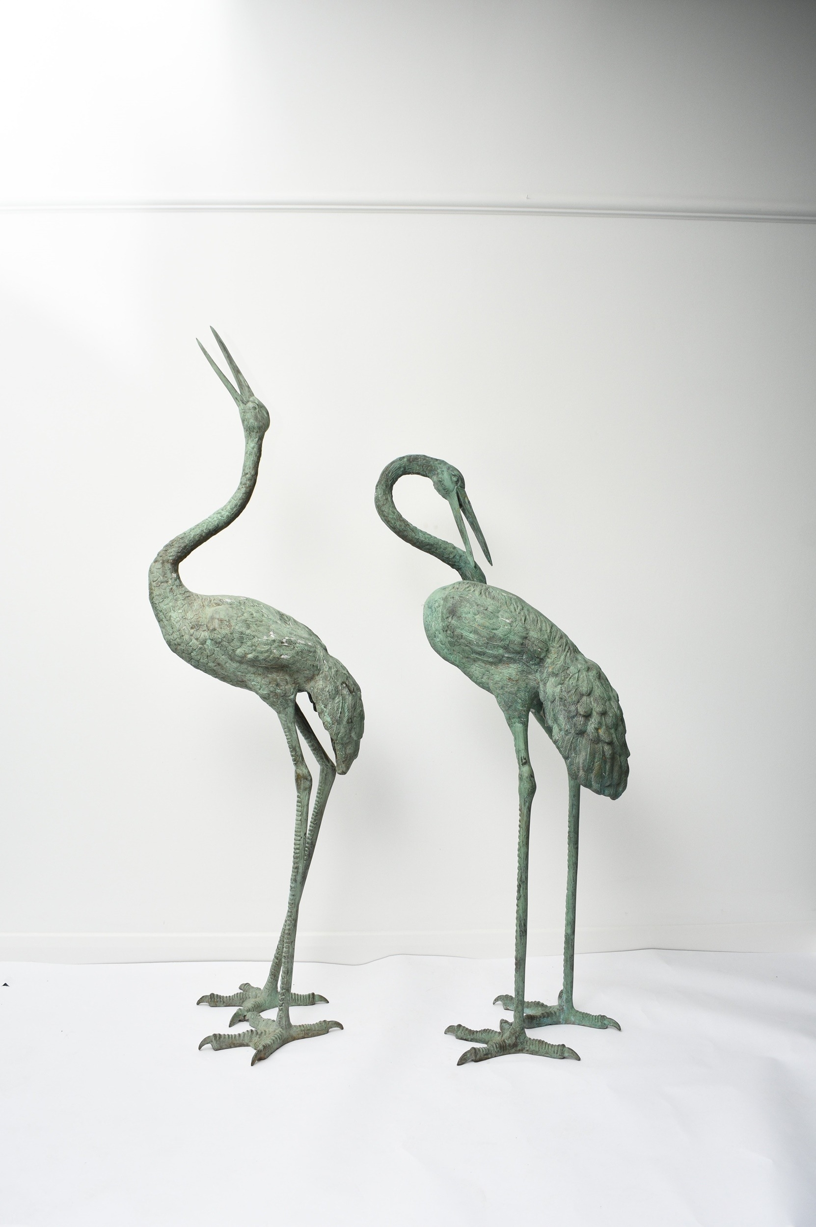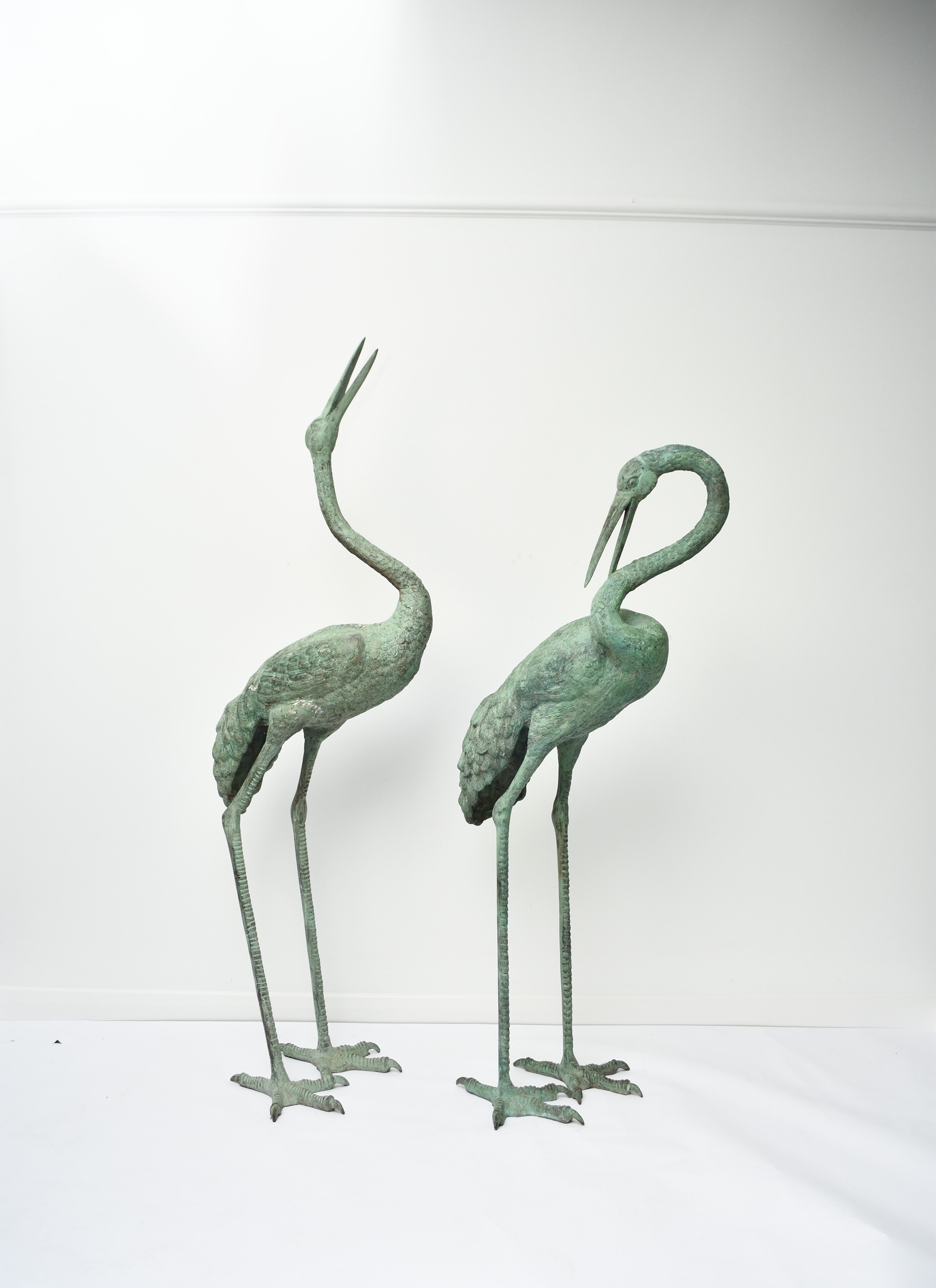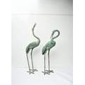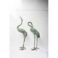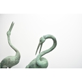 A pair of bronze garden statues of crane birds, 20th century Both modelled standing, one with head raised, the other with neck curled back, finished in a verdigris effect. 167cm and 138cm high (2) Condition:Both appear good.