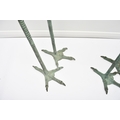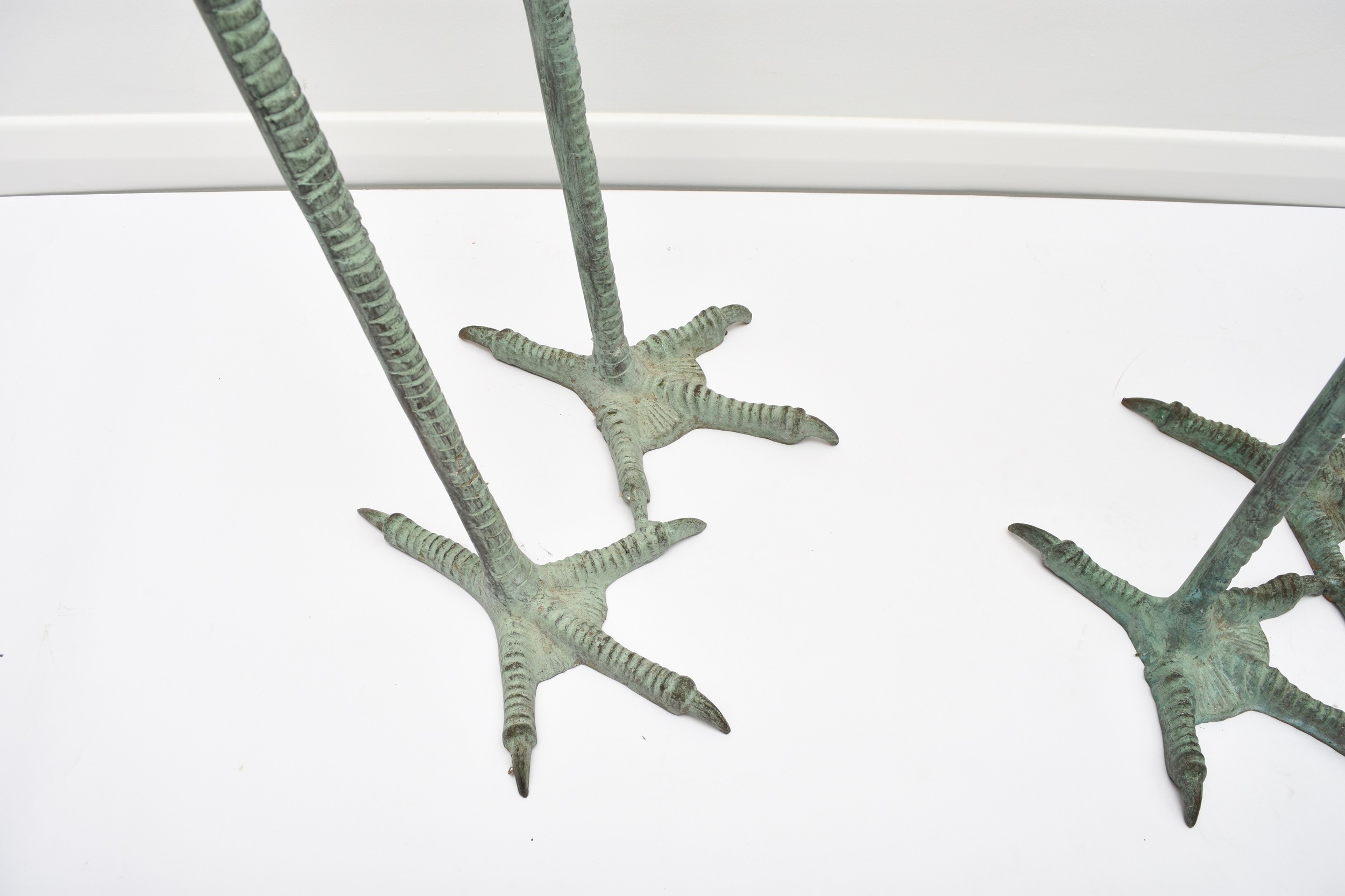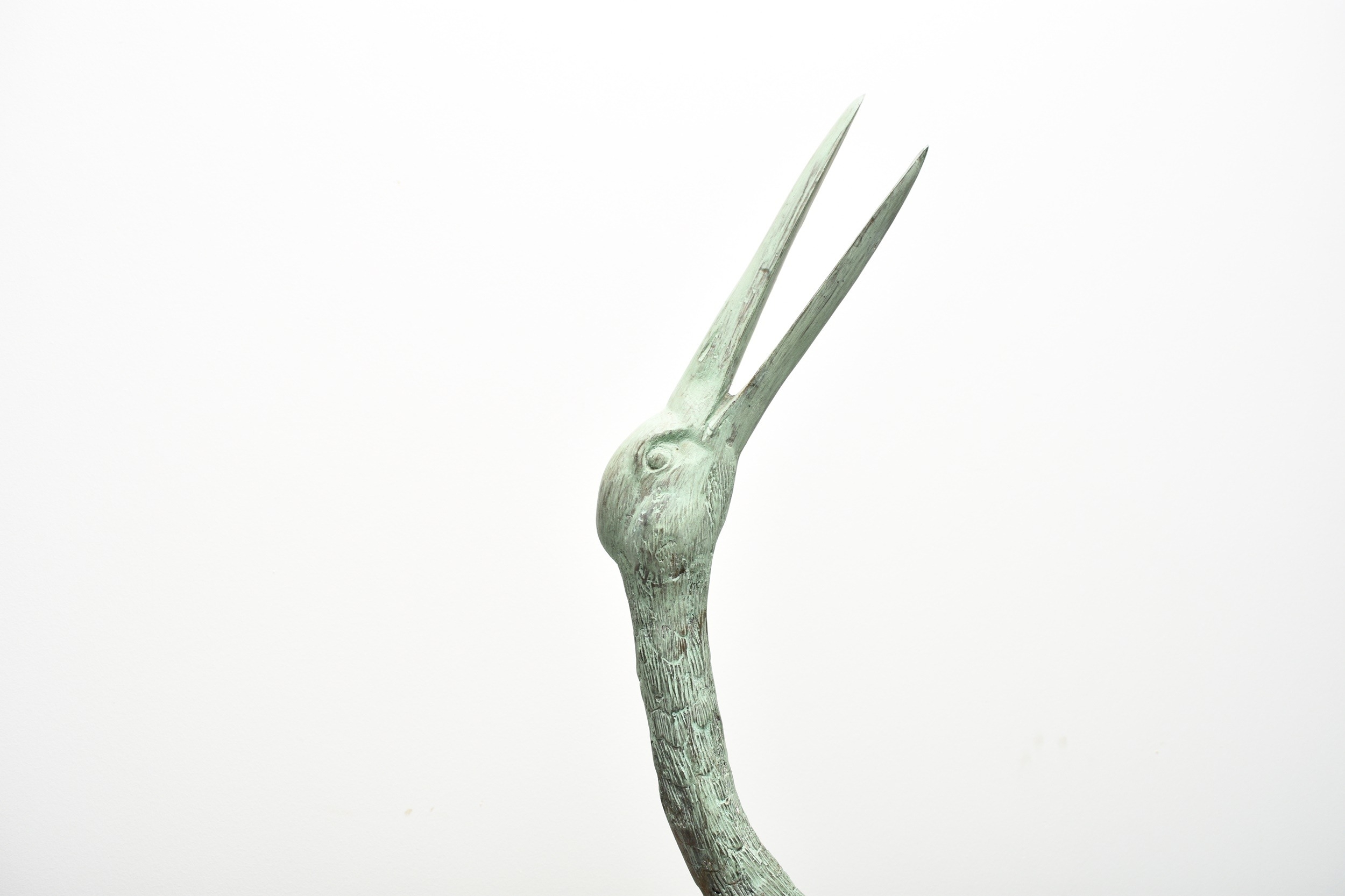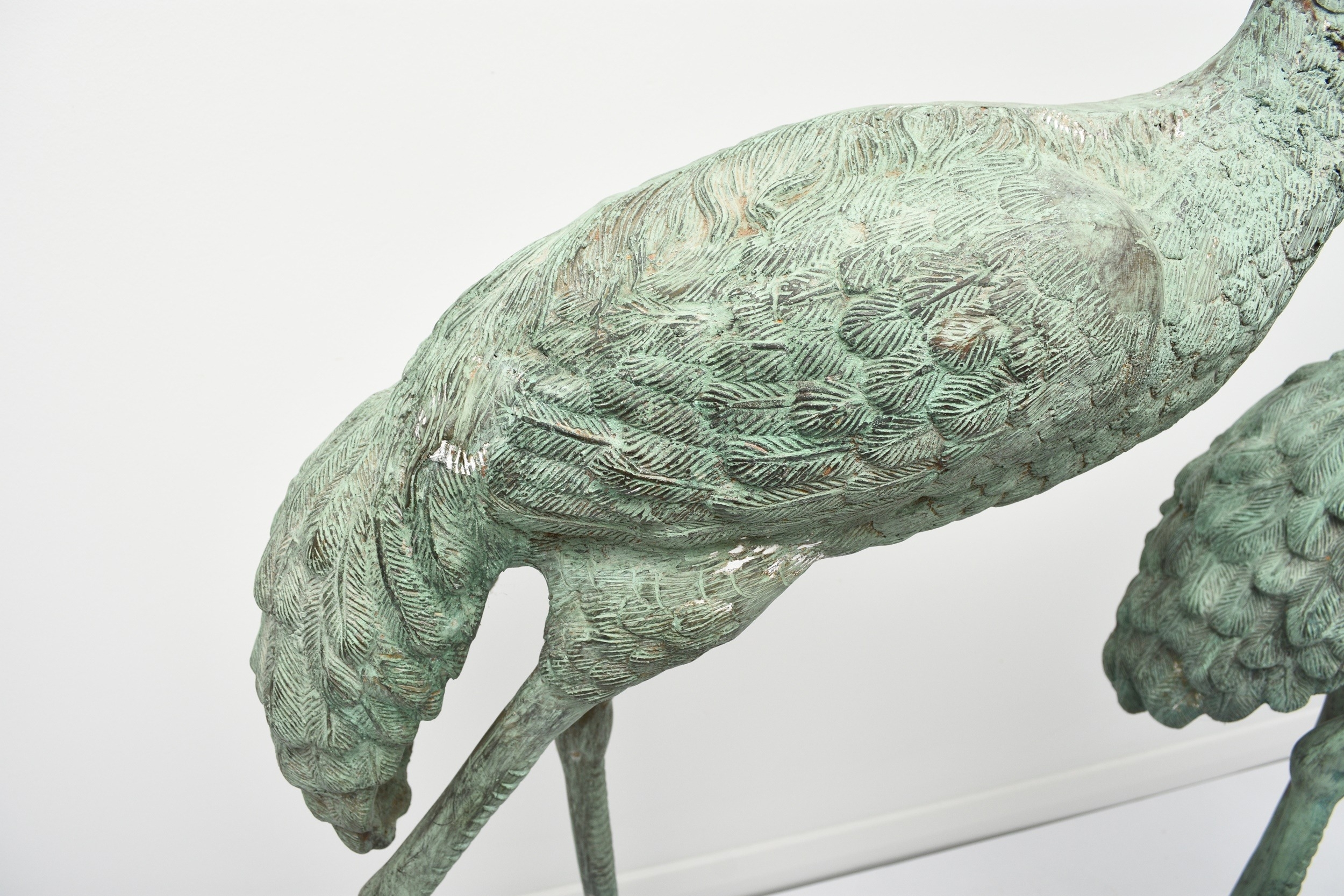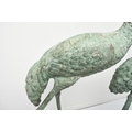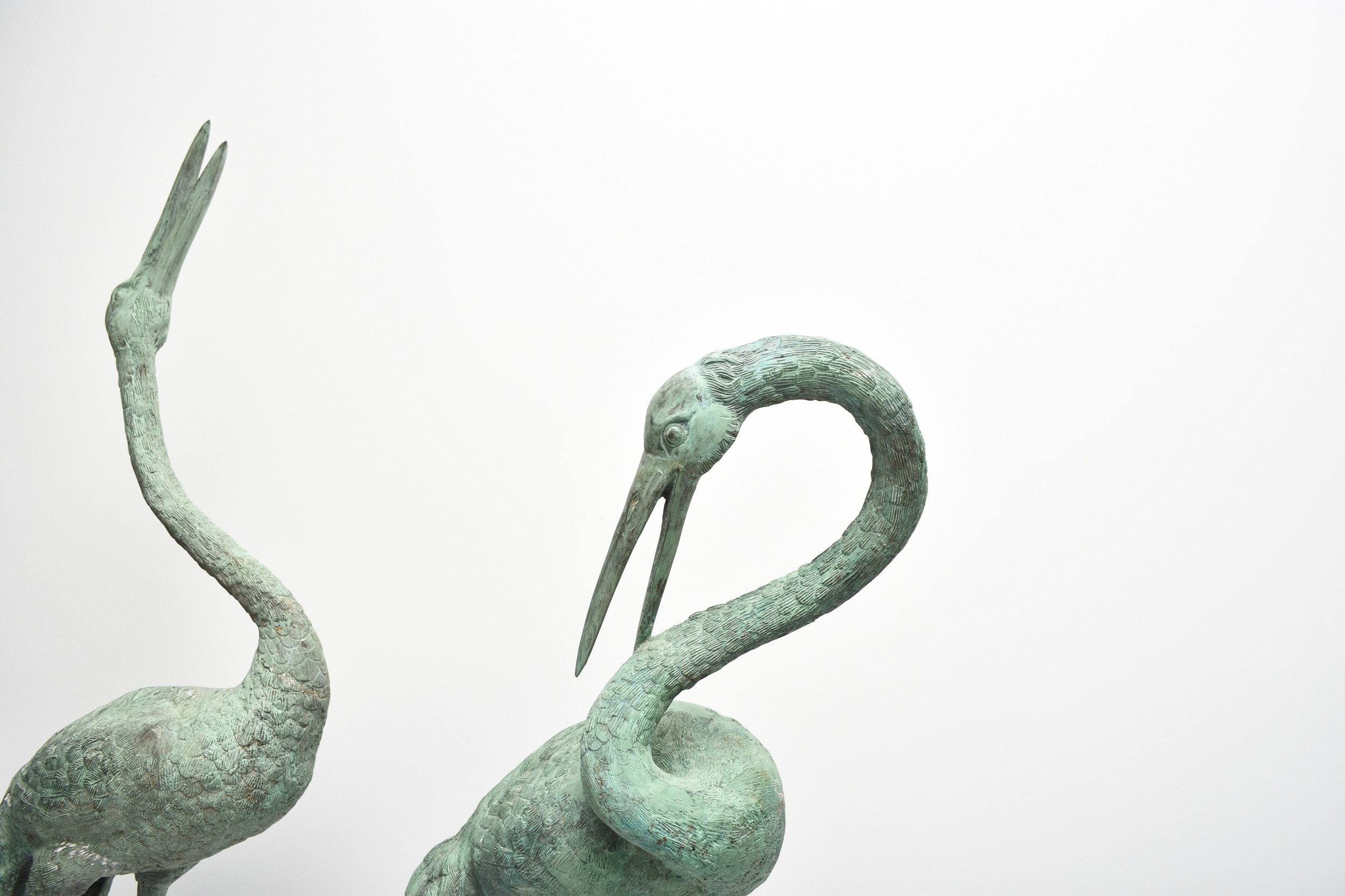 A pair of bronze garden statues of crane birds, 20th century Both modelled standing, one with head raised, the other with neck curled back, finished in a verdigris effect. 167cm and 138cm high (2) Condition:Both appear good.