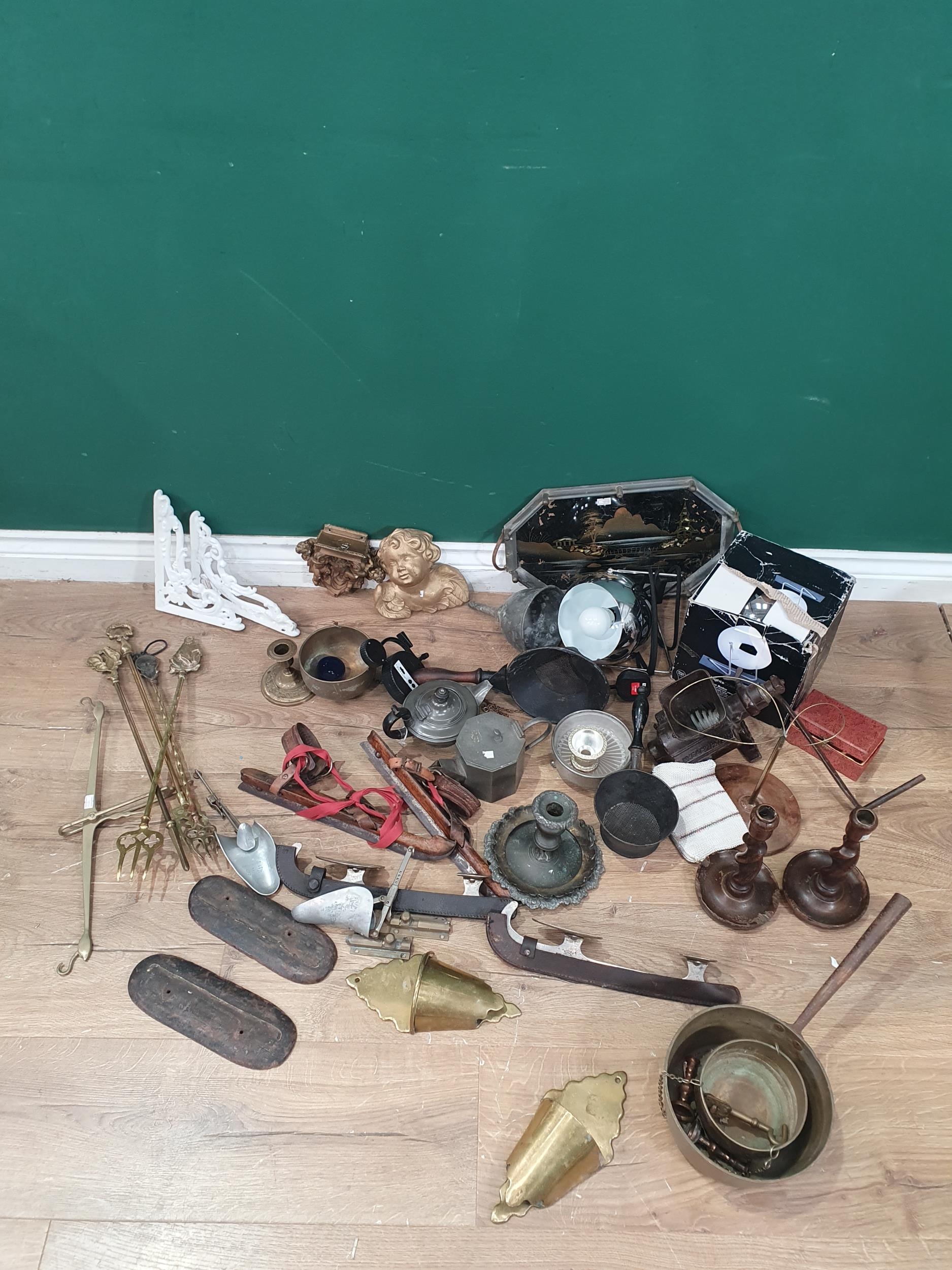 A quantity of items including a pair of 19th Century Wall Pockets, an octagonal pewter Teapot, gilded Cherub, pair of Lamps, two pairs of Skates, etc, (R5)