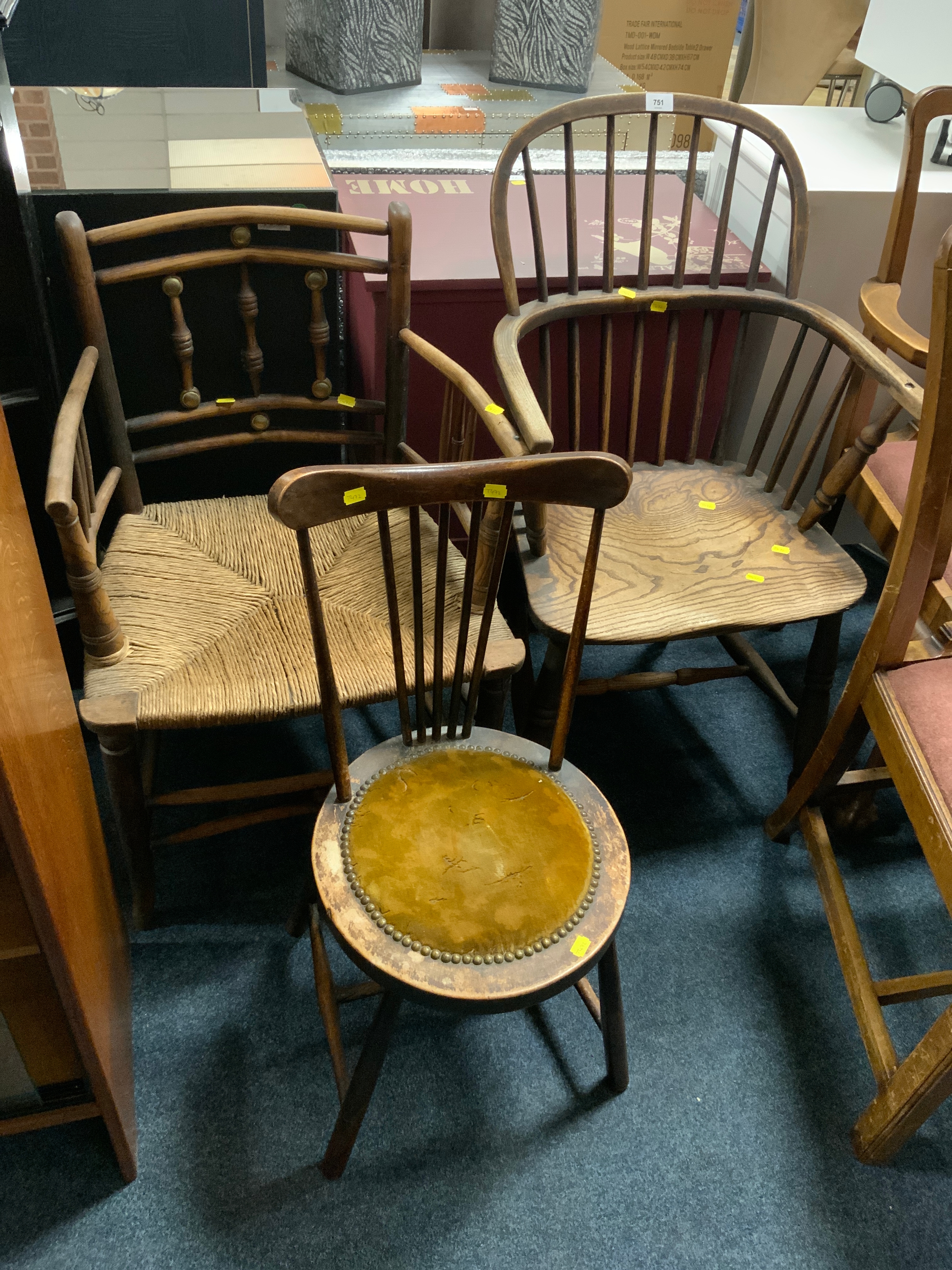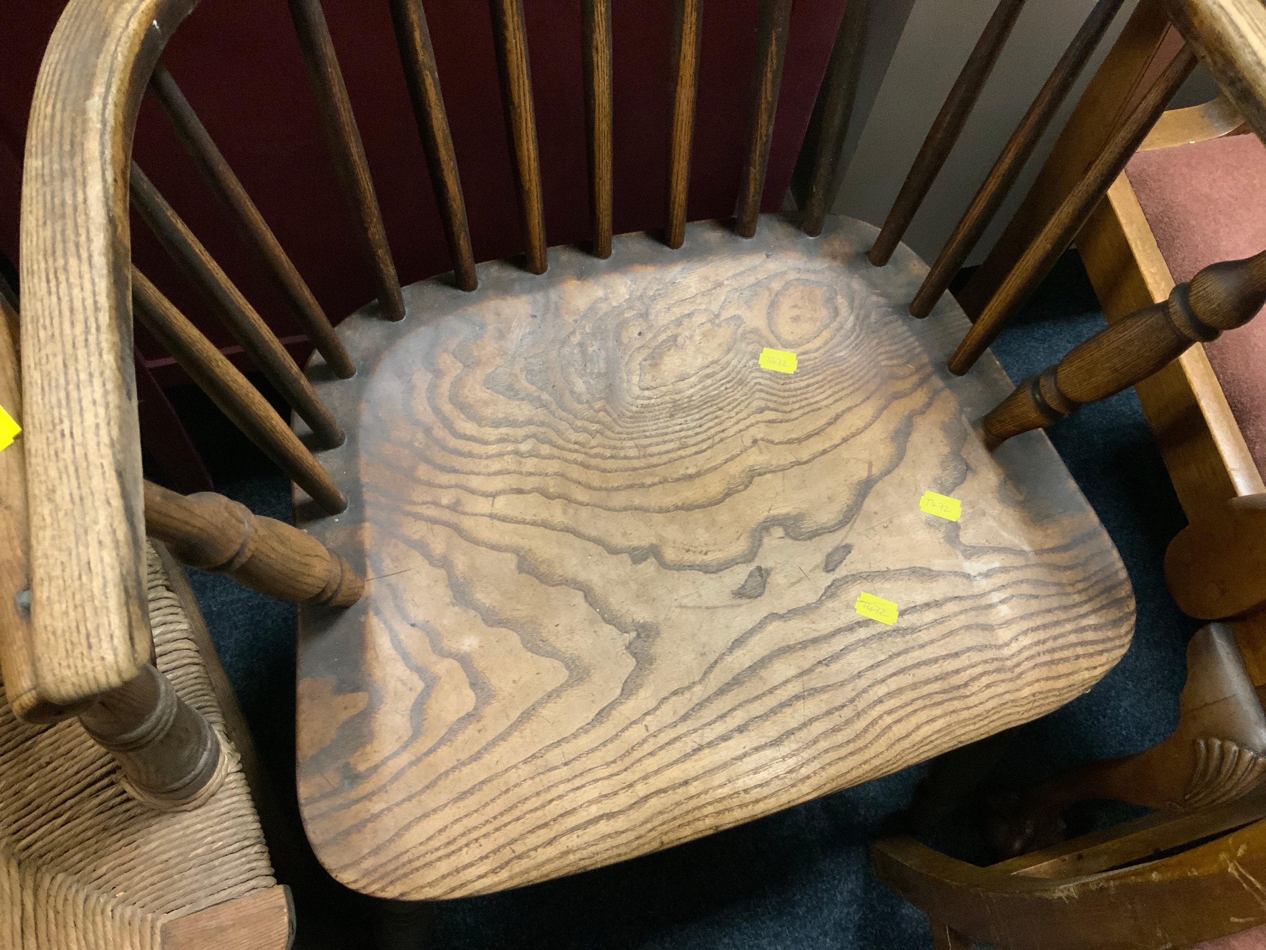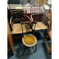 An antique Windsor armchair together with another antique wicker seat chair and a bedroom chair. (3)