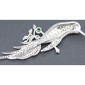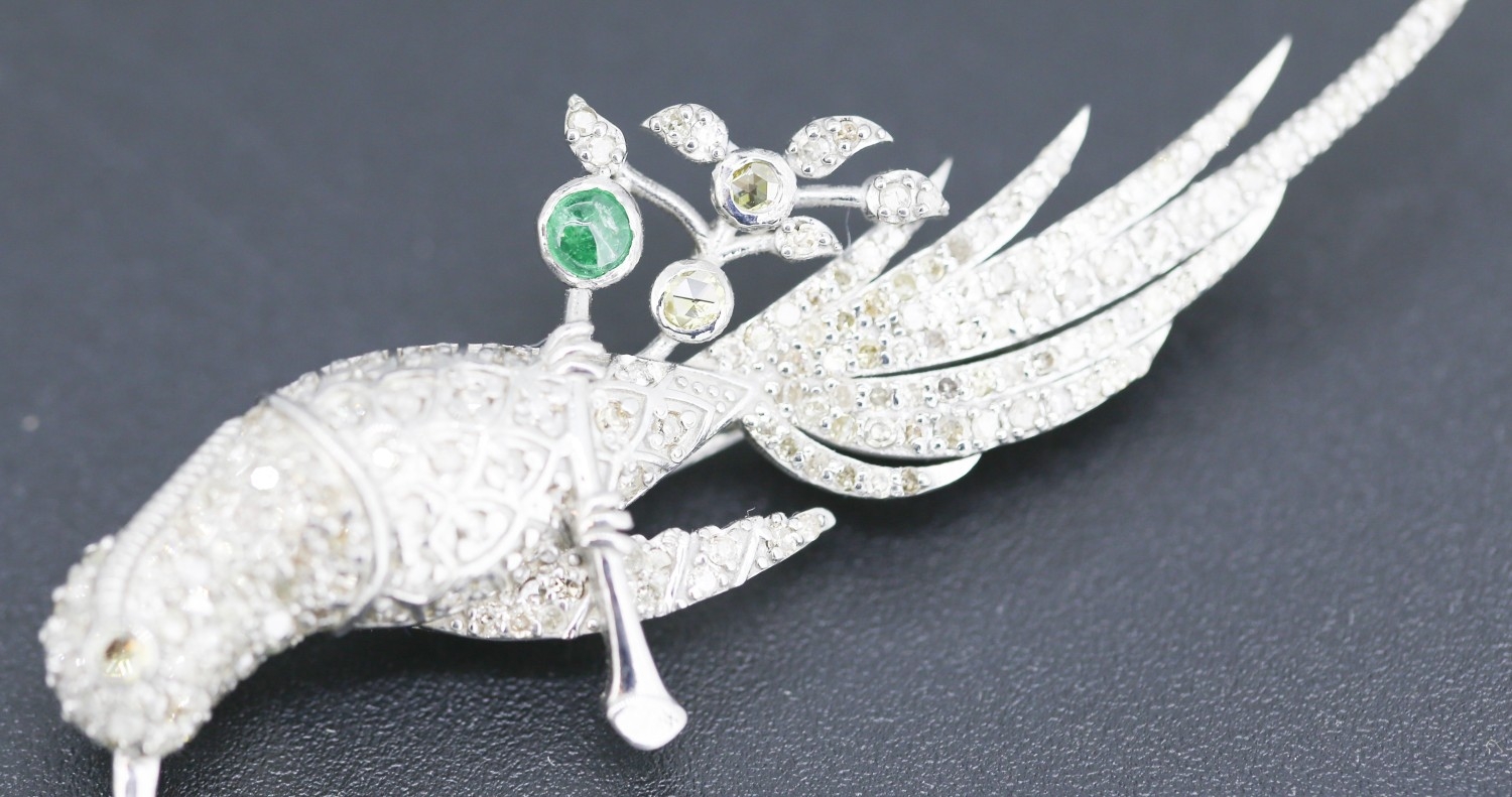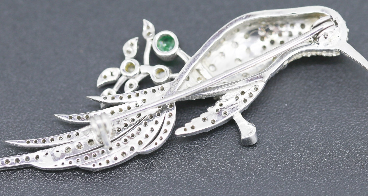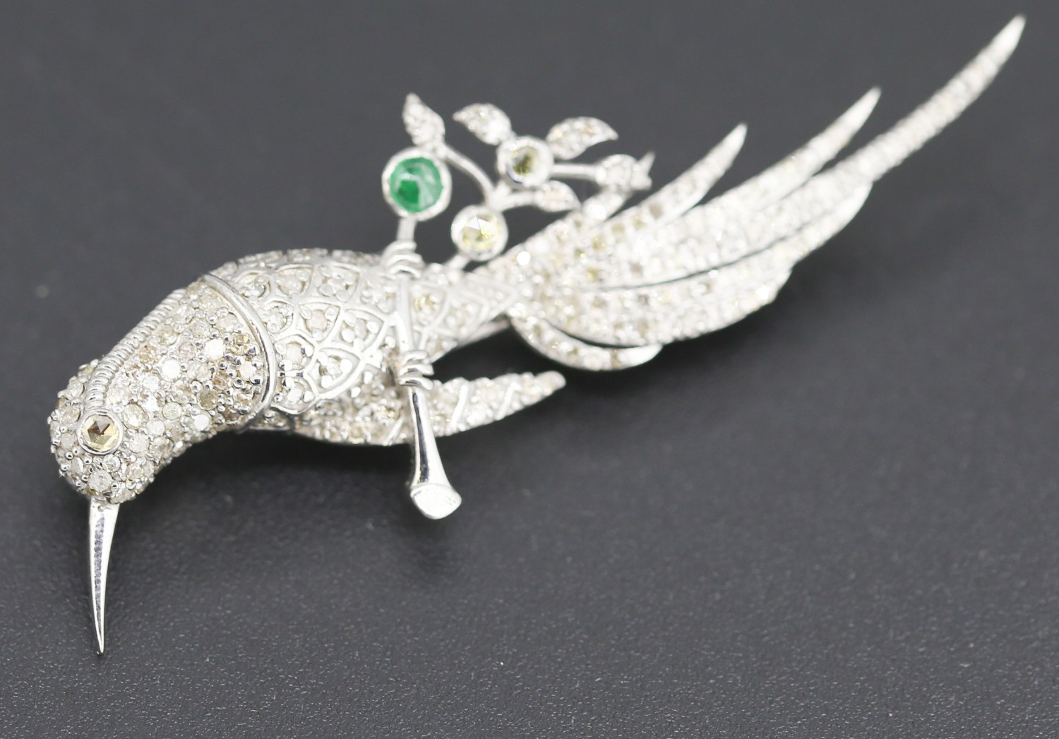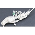 Finely Detailed Diamond Cluster Set Exotic Bird Motif Brooch with Further Polished Emerald Inset Mounted in Silver 6cm High