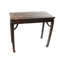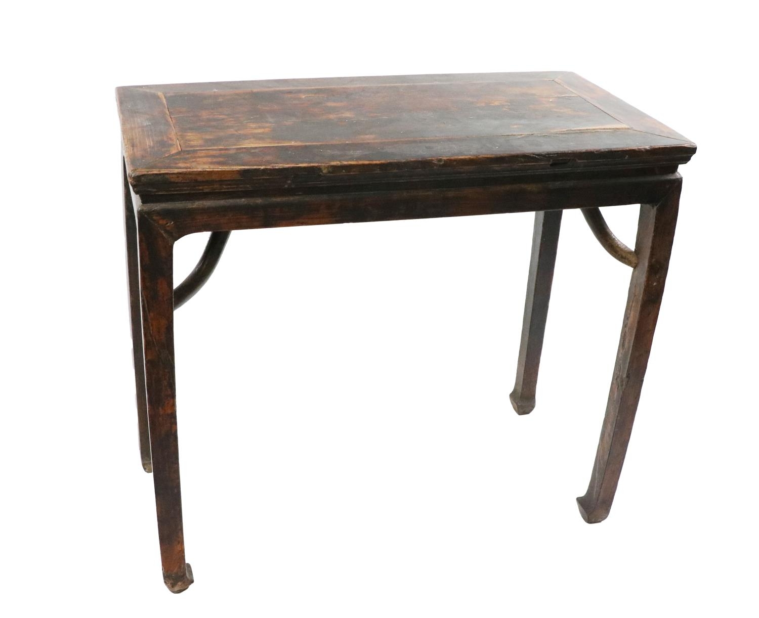 A Chinese wooden Altar Table, with rectangular top on square tapering legs on curved feet, 34" x 38 1/2" (86cms x 98cms). (1)